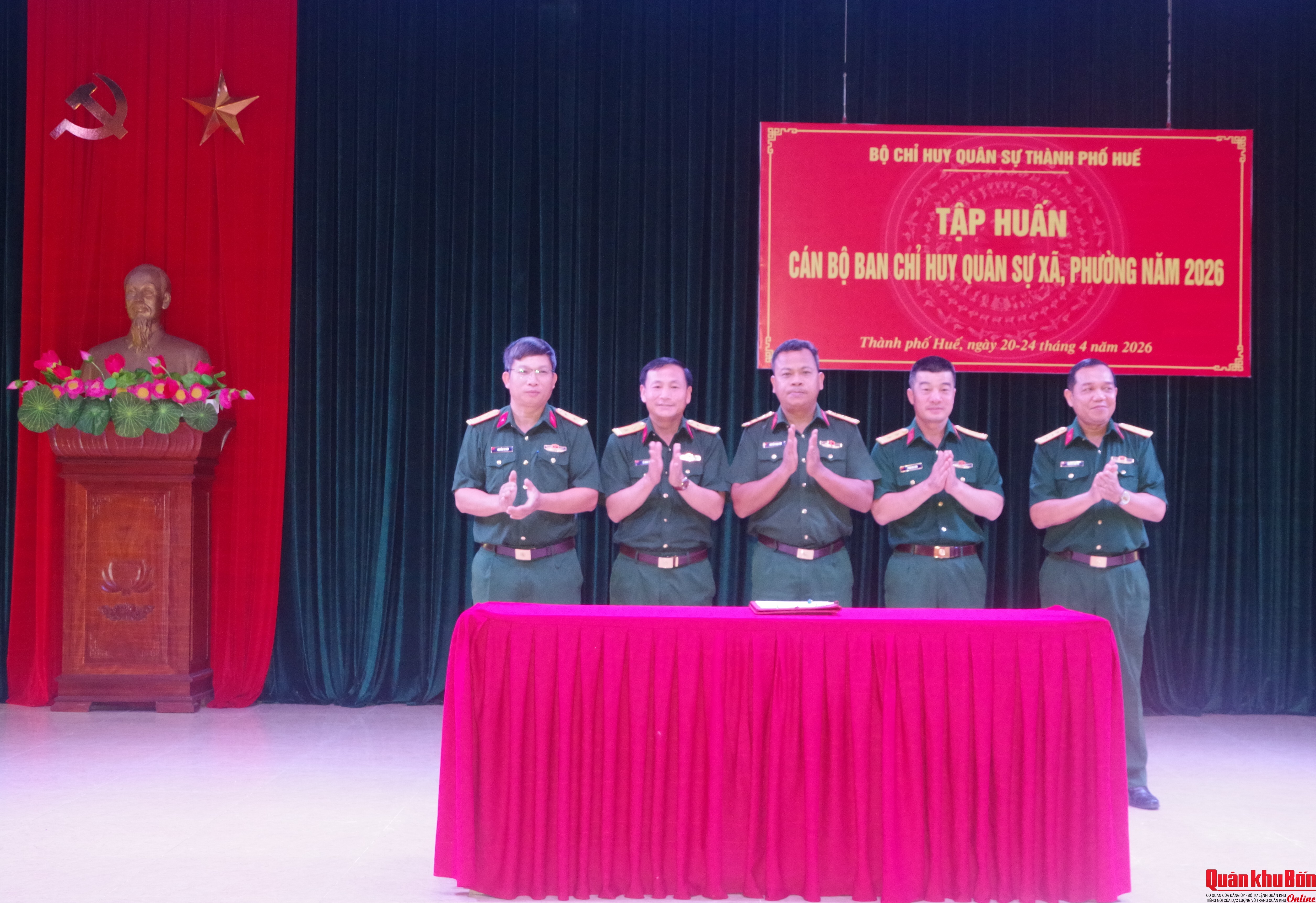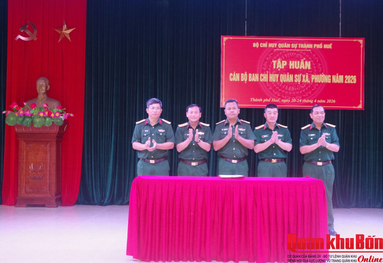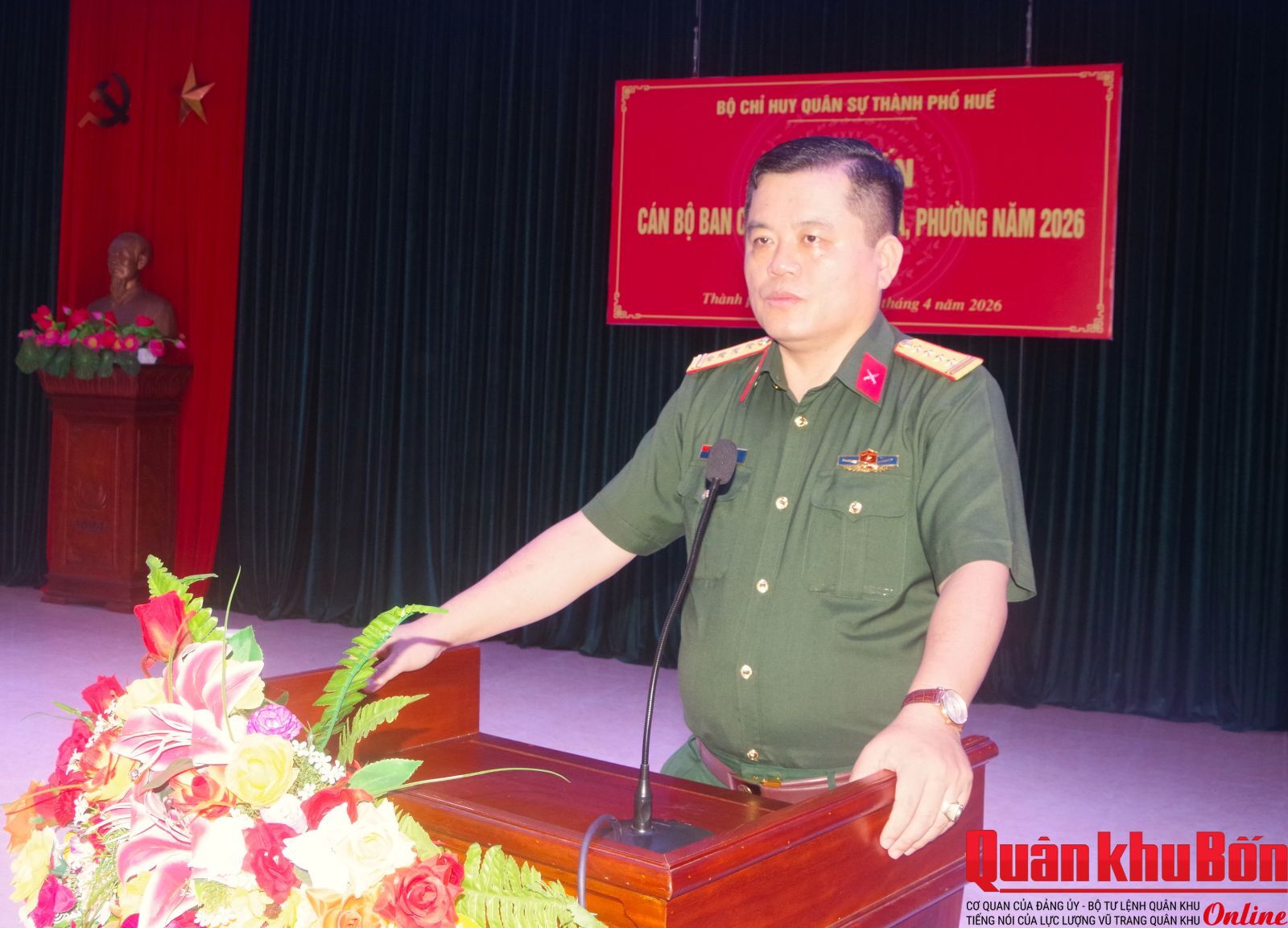 Sáng 20/4/2026, Bộ Chỉ huy quân sự (CHQS) thành phố Huế tổ chức khai mạc lớp tập huấn cán bộ Ban CHQS xã, phường năm 2026 cho 96 cán bộ là sĩ quan, quân nhân chuyên nghiệp. Đại tá Lê Huy Nghĩa, Phó Chỉ huy trưởng, Tham mưu trưởng Bộ CHQS thành phố dự và phát biểu chỉ đạo.