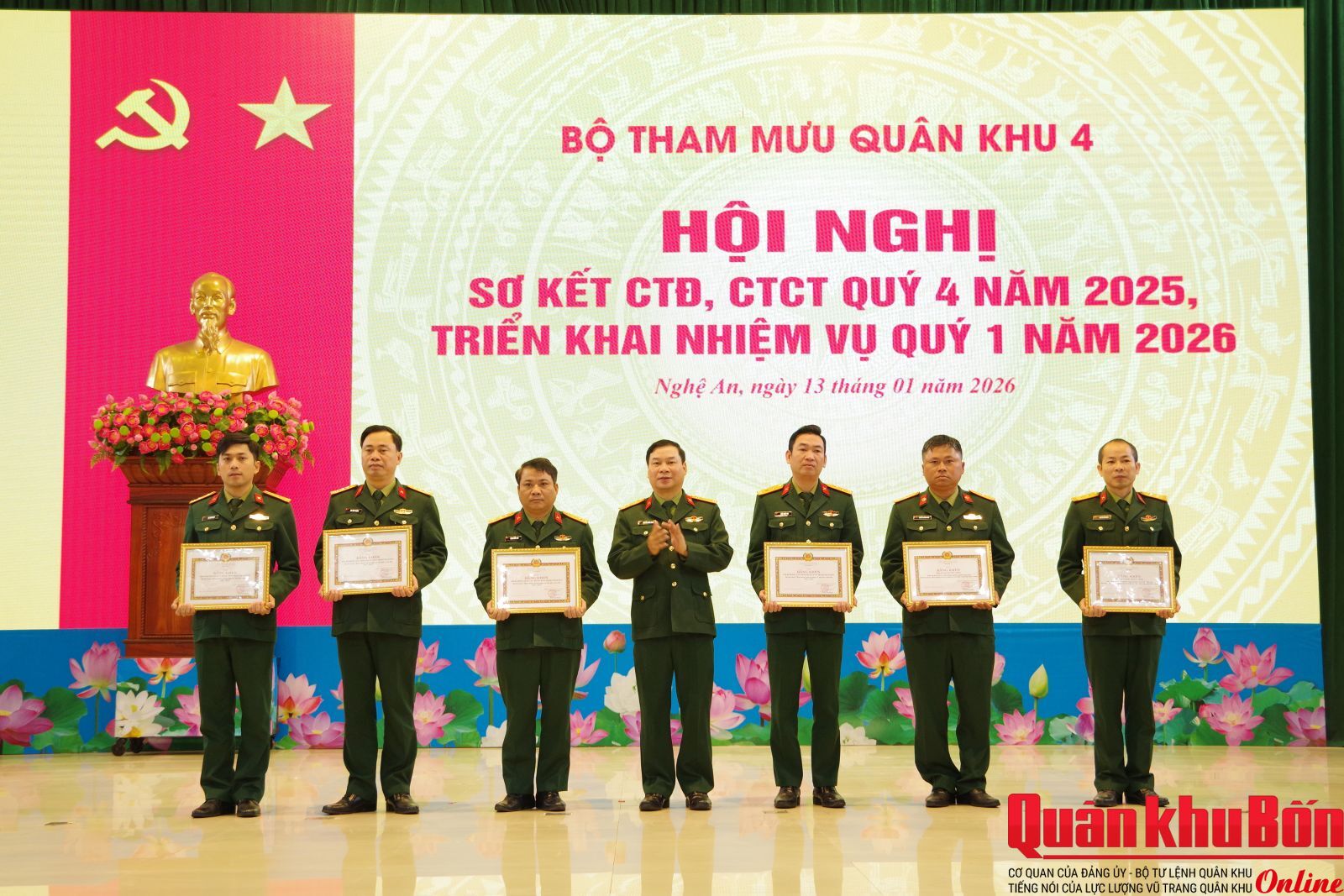 Sáng ngày 13/01/2026, Bộ Tham mưu Quân khu 4 tổ chức Hội nghị sơ kết hoạt động công tác Đảng, công tác chính trị (CTĐ, CTCT) quý IV năm 2025, triển khai nhiệm vụ quý I năm 2026. Đồng chí Đại tá Nguyễn Doãn Hoan, Ủy viên Ban Thường vụ Đảng ủy Bộ Tham mưu, Chủ nhiệm Chính trị Bộ Tham mưu Quân khu chủ trì Hội nghị