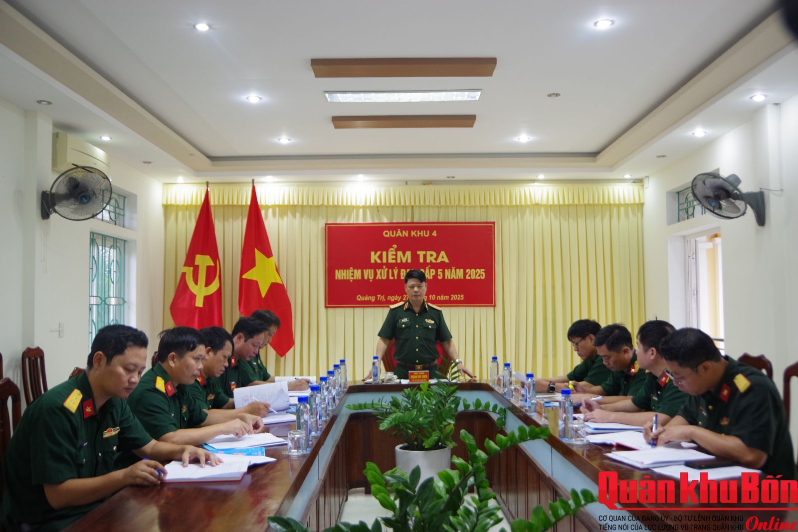 Ngày 27/10/2025, Đoàn công tác Bộ Tư lệnh Quân khu 4 do Thiếu tướng Hoàng Duy Chiến, Phó Tư lệnh Quân khu, làm Trưởng đoàn đã kiểm tra công tác xử lý đạn dược cấp 5 tại Kho K3 (Cục Hậu cần - Kỹ thuật Quân khu 4). Cùng đi có Đại tá Lê Thanh Tịnh, Trưởng phòng Quân khí, Cục Hậu cần - Kỹ thuật và đại diện một số cơ quan chức năng của Quân khu.