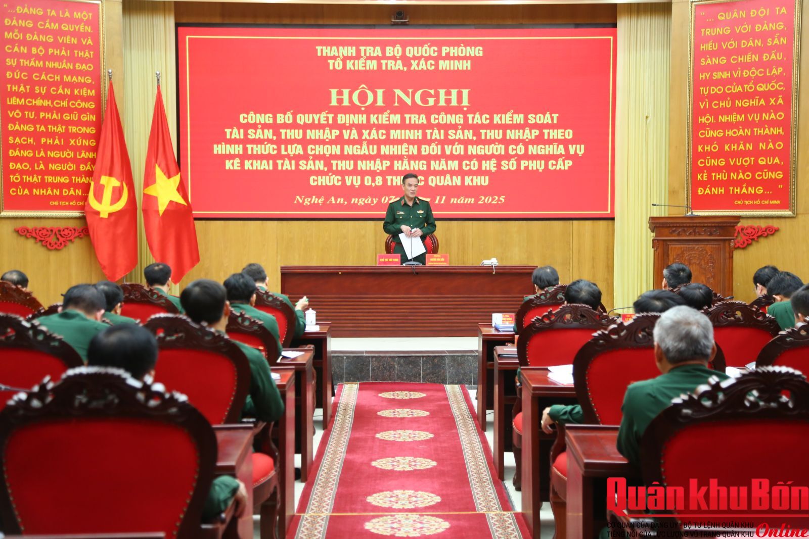 Ngày 7/10/2025, Thanh tra Bộ Quốc phòng tổ chức Hội nghị công bố quyết định kiểm tra công tác kiểm soát tài sản, thu nhập và xác minh tài sản, thu nhập theo hình thức lựa chọn ngẫu nhiên đối với người có nghĩa vụ kê khai tài sản, thu nhập hằng năm có hệ số phụ cấp chức vụ 0,8 thuộc Quân khu 4. Thiếu tướng Nguyễn Văn Xiển, Phó Chánh Thanh tra Bộ Quốc phòng chủ trì hội nghị.