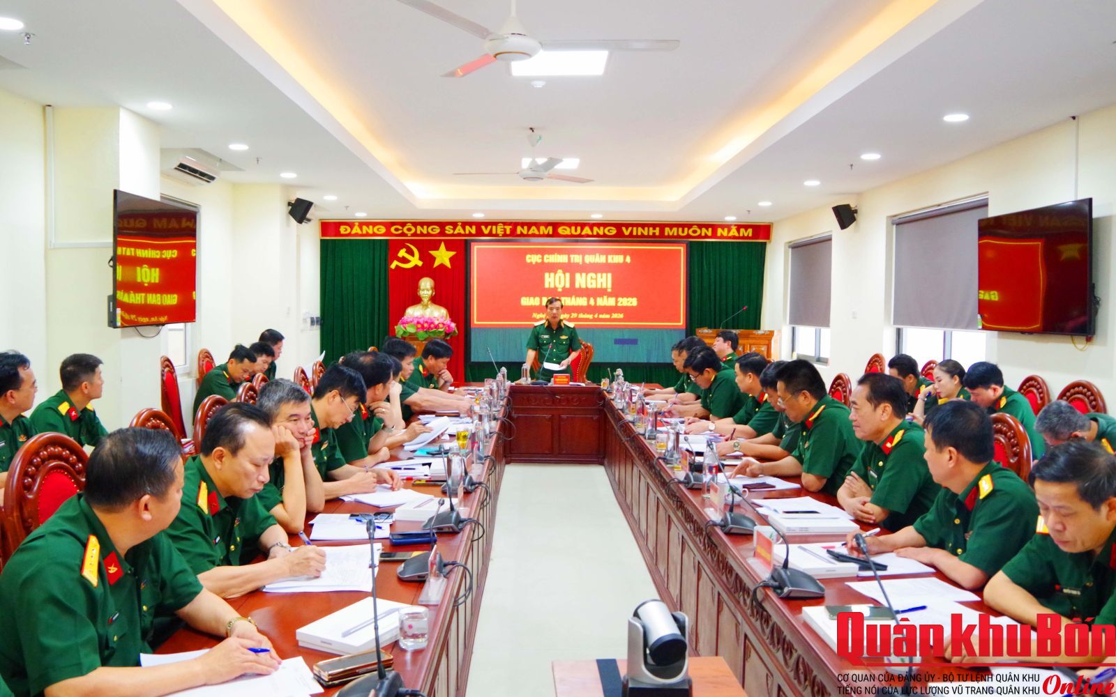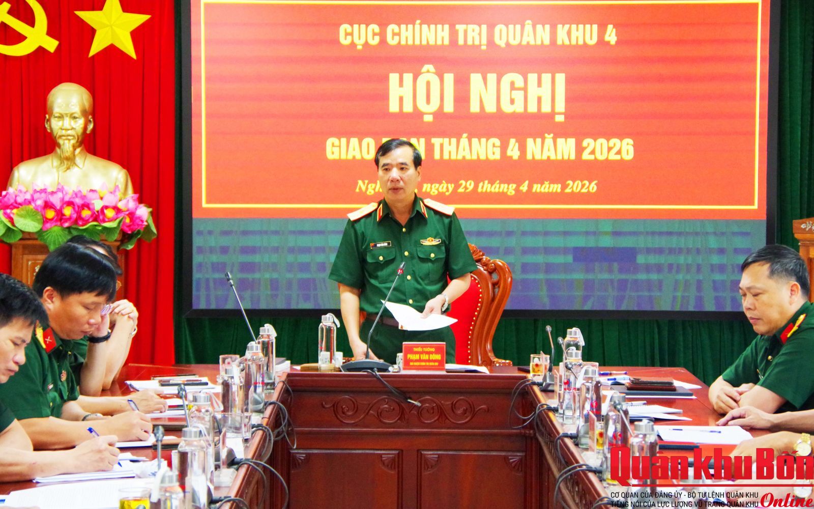Sáng 29/4/2026, Cục Chính trị Quân khu 4 tổ chức Hội nghị giao ban, đánh giá kết quả thực hiện nhiệm vụ tháng 4, triển khai nhiệm vụ tháng 5 năm 2026. Thiếu tướng Phạm Văn Đông, Ủy viên Ban Thường vụ Đảng ủy, Chủ nhiệm Chính trị Quân khu chủ trì Hội nghị. Tham dự Hội nghị có Thiếu tướng Phan Văn Sỹ, Bí thư Đảng ủy Cục Chính trị, Phó Chủ nhiệm Chính trị Quân khu; các đồng chí trong Thường vụ Đảng ủy, Thủ trưởng Cục; lãnh đạo, chỉ huy các phòng, ban, cơ quan, đơn vị trực thuộc Cục.
