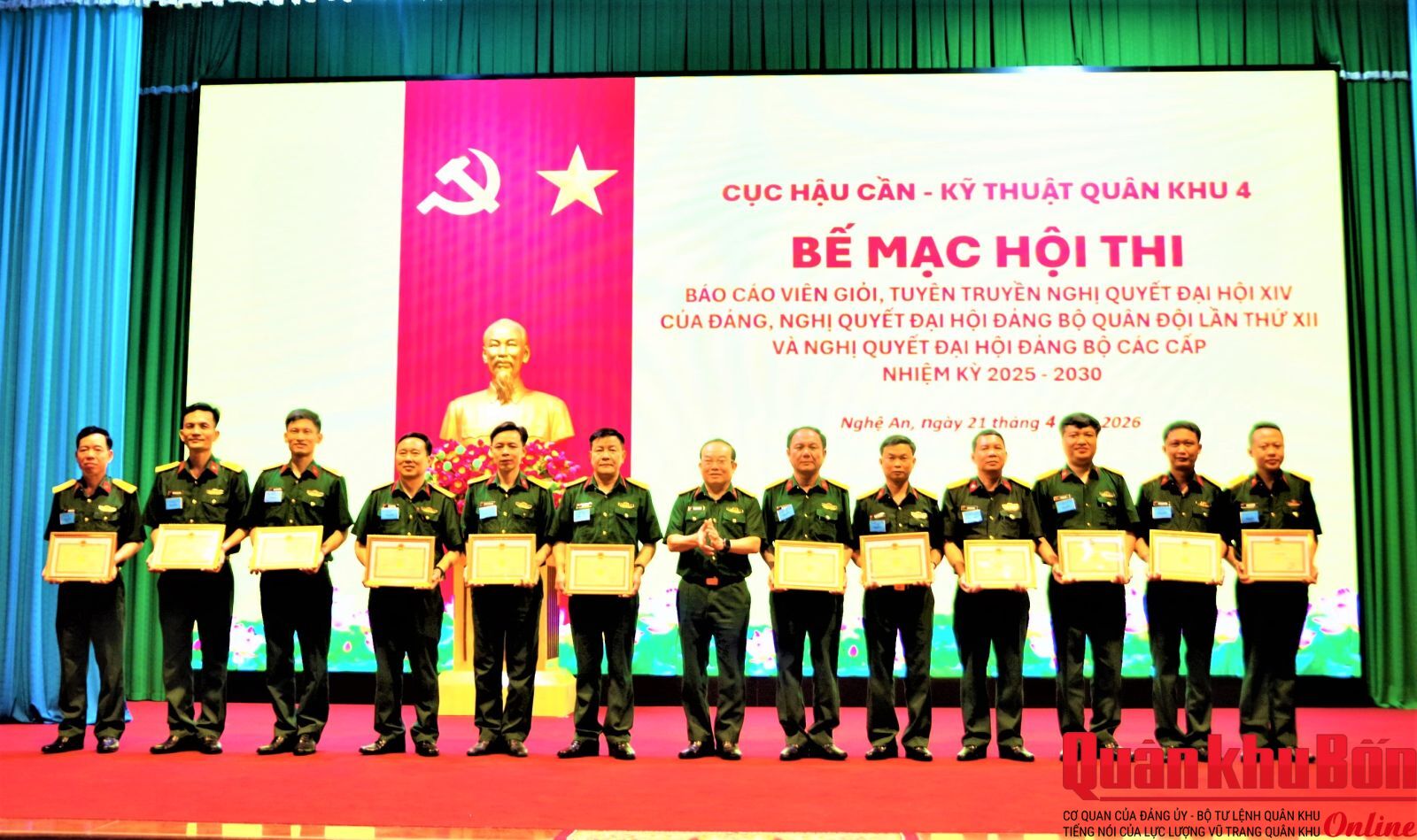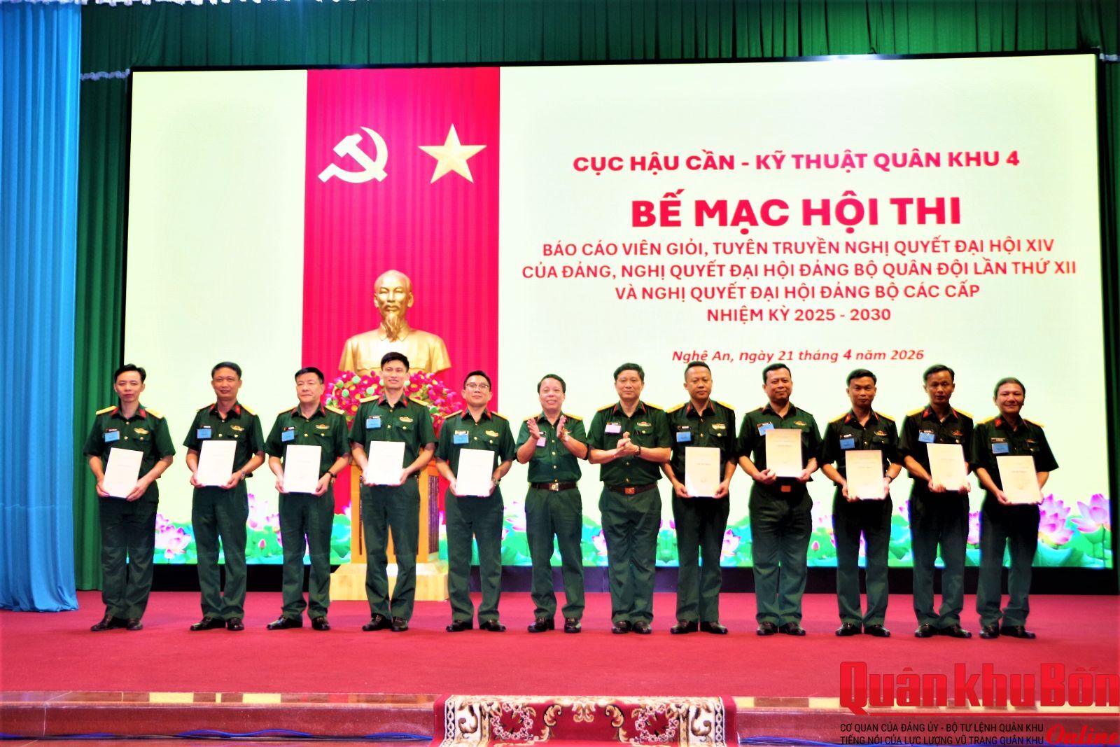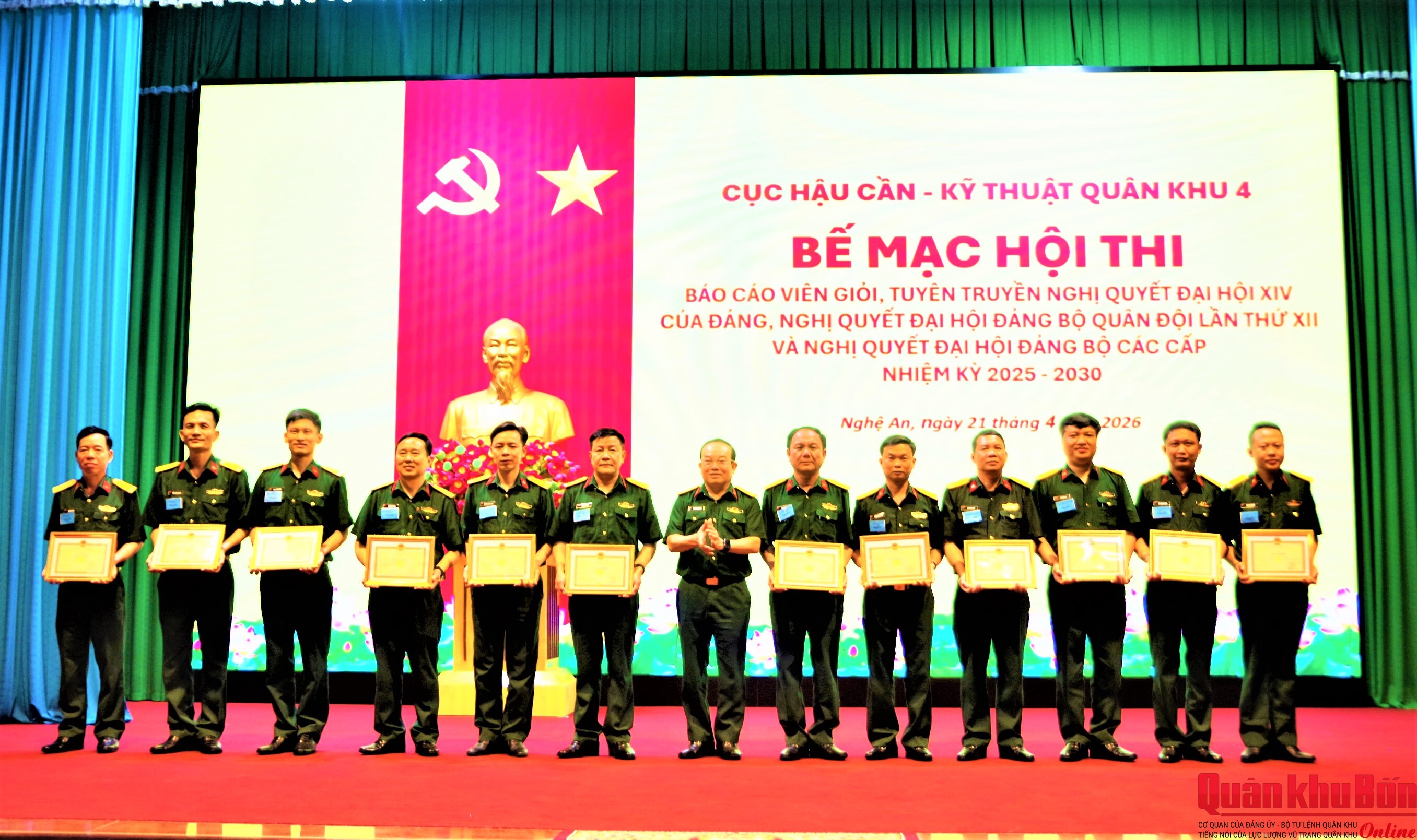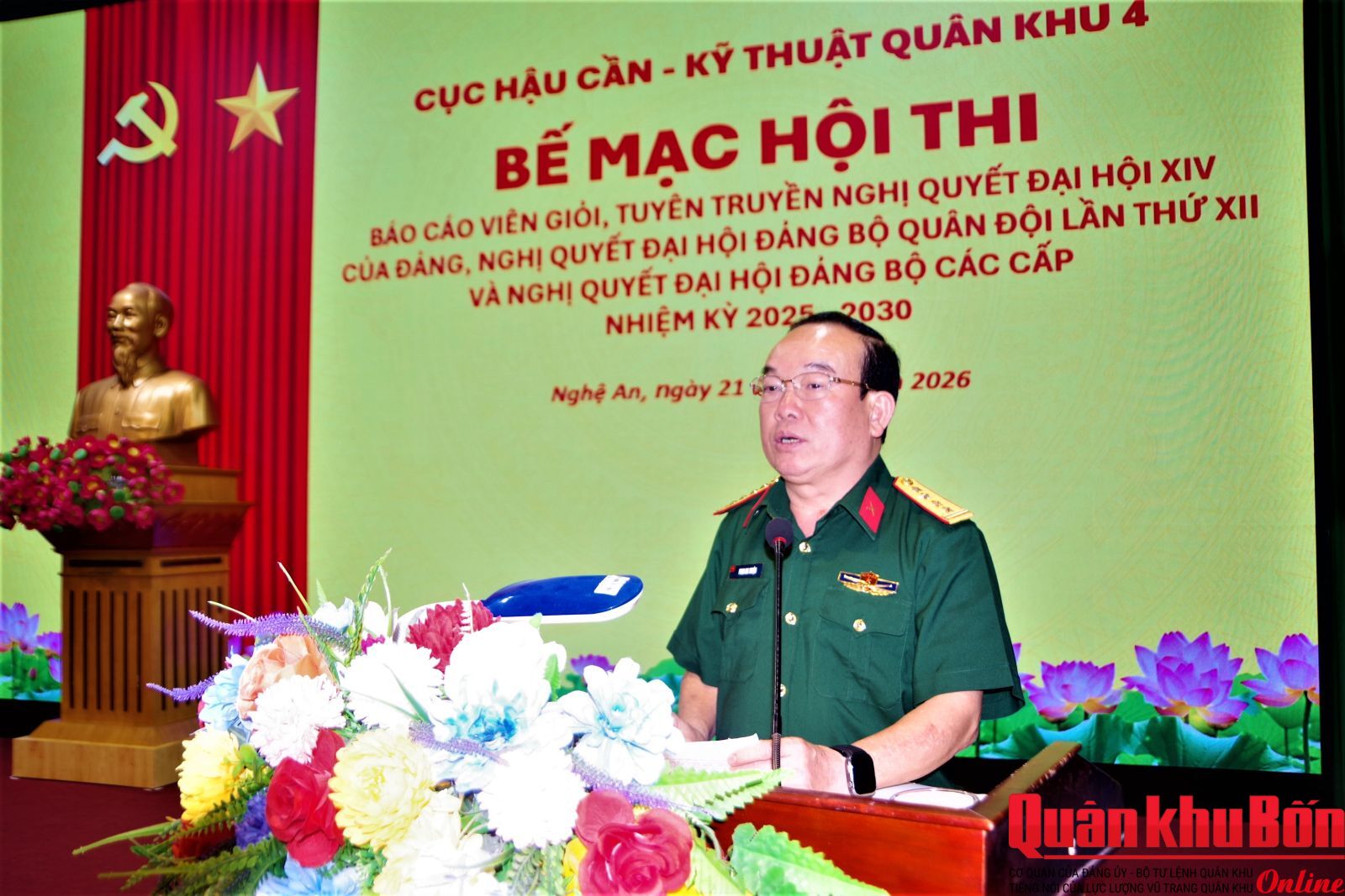 Ngày 21/4/2026, tại Bệnh viện Quân y 4, Cục Hậu cần – Kỹ thuật Quân khu 4 tổ chức Hội thi báo cáo viên giỏi năm 2026. Đại tá Phan Gia Thuận, Bí thư Đảng ủy, Chính ủy Cục Hậu cần – Kỹ thuật Quân khu 4 dự và chỉ đạo hội thi.