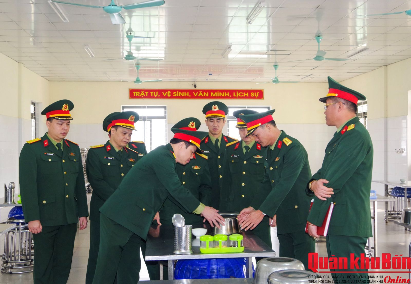 Nội dung kiểm tra tập trung vào công tác chuẩn bị, bảo đảm quân nhu cho HSQ, BS xuất ngũ năm 2026 (gồm túi quà Tết và các tiêu chuẩn quân nhu theo quy định); bảo đảm lương thực, thực phẩm phục vụ Tết Nguyên đán Bính Ngọ; bảo đảm trang bị nhà ăn, nhà bếp, dụng cụ cấp dưỡng, lực lượng nuôi quân; bảo đảm quân trang phục vụ nhiệm vụ tiếp nhận, huấn luyện chiến sĩ mới năm 2026; công tác bảo đảm quân nhu cho phòng, chống rét; dự trữ vật chất quân nhu phục vụ sẵn sàng chiến đấu và nhiệm vụ đột xuất; công tác kiểm kê, quyết toán quân nhu và hệ thống văn kiện công tác quân nhu.