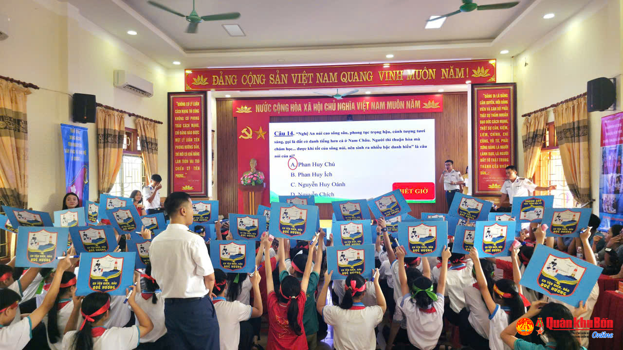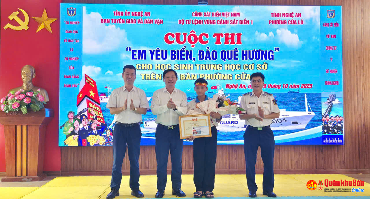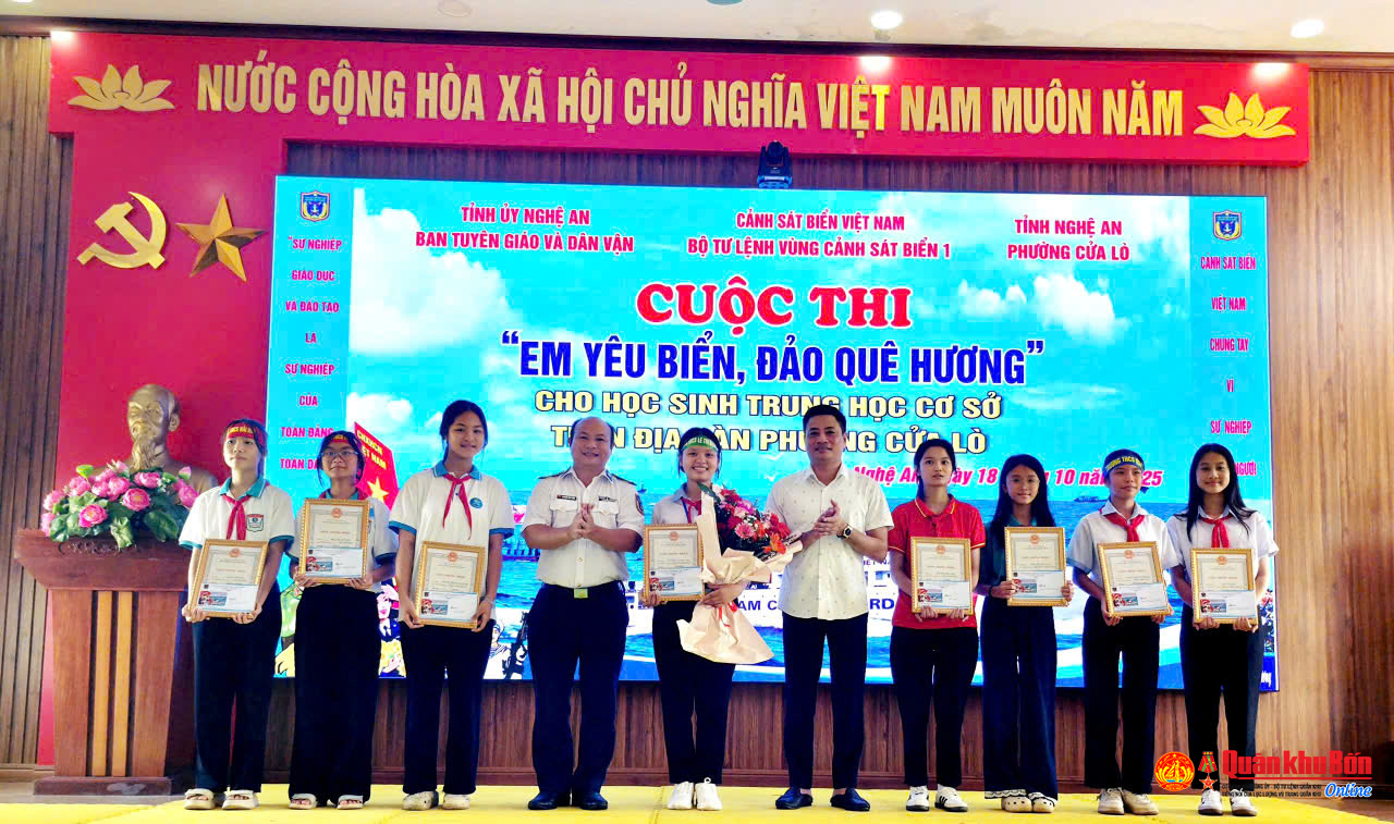 Sáng ngày 18/10/2025, tại trụ sở Ban Chỉ huy quân sự phường Cửa Lò (tỉnh Nghệ An), Hải đội 102 - Bộ Tư lệnh Vùng Cảnh sát biển 1 phối hợp với Phòng Văn hoá – Xã hội phường Cửa Lò và 6 trường trung học cơ sở trên địa bàn tổ chức Cuộc thi “Em yêu biển, đảo quê hương” năm 2025.