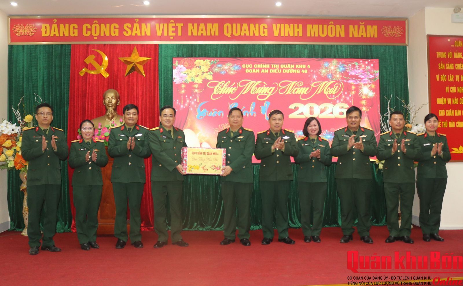 Chiều ngày 3/2/2026, đoàn công tác Cục Chính trị Quân khu 4 do Đại tá Nguyễn Kỳ Hồng, Phó Chủ nhiệm Chính trị Quân khu làm trưởng đoàn đã đến kiểm tra công tác sẵn sàng chiến đấu (SSCĐ) và chúc Tết Đoàn An điều dưỡng 40 Cửa Hội, Viện Kiểm sát Quân sự Khu vực 41 và Bảo tàng Quân khu 4.