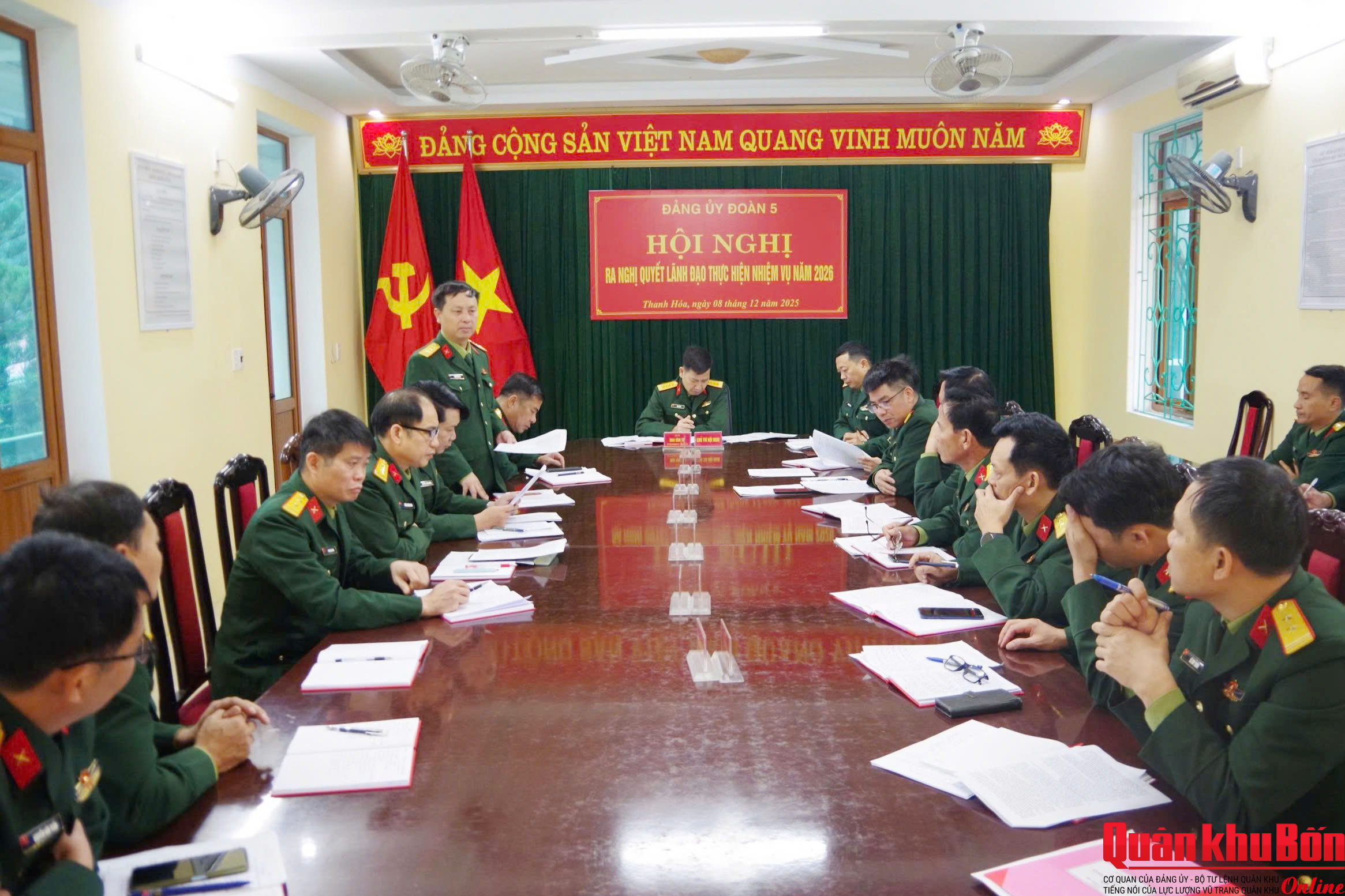 Sáng ngày 8/12/2025, Đảng ủy Đoàn Kinh tế - Quốc phòng 5 tổ chức Hội nghị ra Nghị quyết lãnh đạo thực hiện nhiệm vụ năm 2026. Đại tá Mai Văn Tài, Bí thư Đảng ủy, Chính ủy Đoàn chủ trì Hội nghị. Tham dự Hội nghị có các đồng chí trong Ban Thường vụ; Ban Chấp hành Đảng bộ Đoàn; chỉ huy Đoàn và Bí thư các chi bộ trực thuộc.