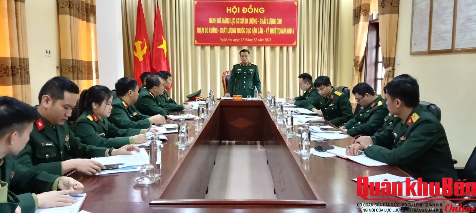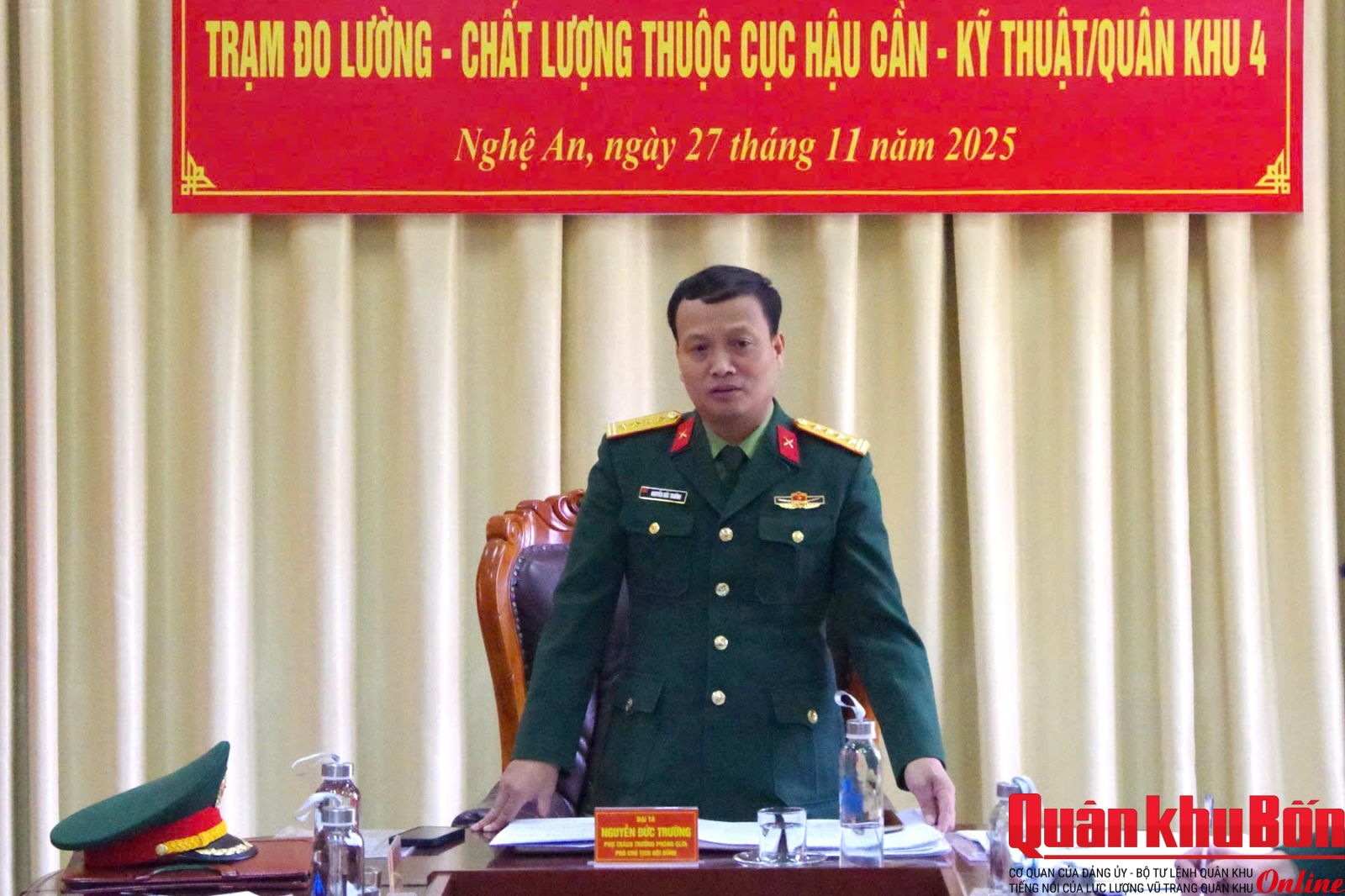 Ngày 27/11/2025, Hội đồng đánh giá năng lực cơ sở Đo lường - Chất lượng của Cục Tiêu chuẩn - Đo lường - Chất lượng, Bộ Tổng Tham mưu tổ chức đánh giá năng lực cơ sở Đo lường - Chất lượng năm 2025 tại Trạm Đo lường - Chất lượng, Cục Hậu cần - Kỹ thuật Quân khu 4. Đại tá Nguyễn Đức Trường, Phụ trách Trưởng phòng Quản lý Đo lường, Phó Chủ tịch Hội đồng chủ trì; cùng dự có Đại tá Nguyễn Tuấn Anh, Phó Chủ nhiệm Hậu cần - Kỹ thuật Quân khu.
