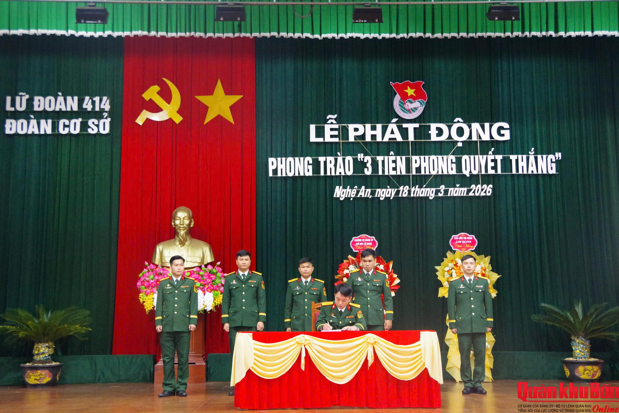 Sáng 18/3/2026, Đoàn cơ sở Lữ đoàn Công binh 414 tổ chức Lễ phát động phong trào “3 Tiên phong quyết thắng” giai đoạn 2025–2030. Đây là đơn vị được Quân khu 4 chọn làm điểm để rút kinh nghiệm triển khai trong toàn Quân khu. Đại tá Bùi Thế Kỷ, Trưởng phòng Công tác quần chúng, Cục Chính trị Quân khu; đại biểu Đoàn xã Vạn An (Nghệ An), lãnh đao, chỉ huy Lữ đoàn 414 dự Lễ phát động.