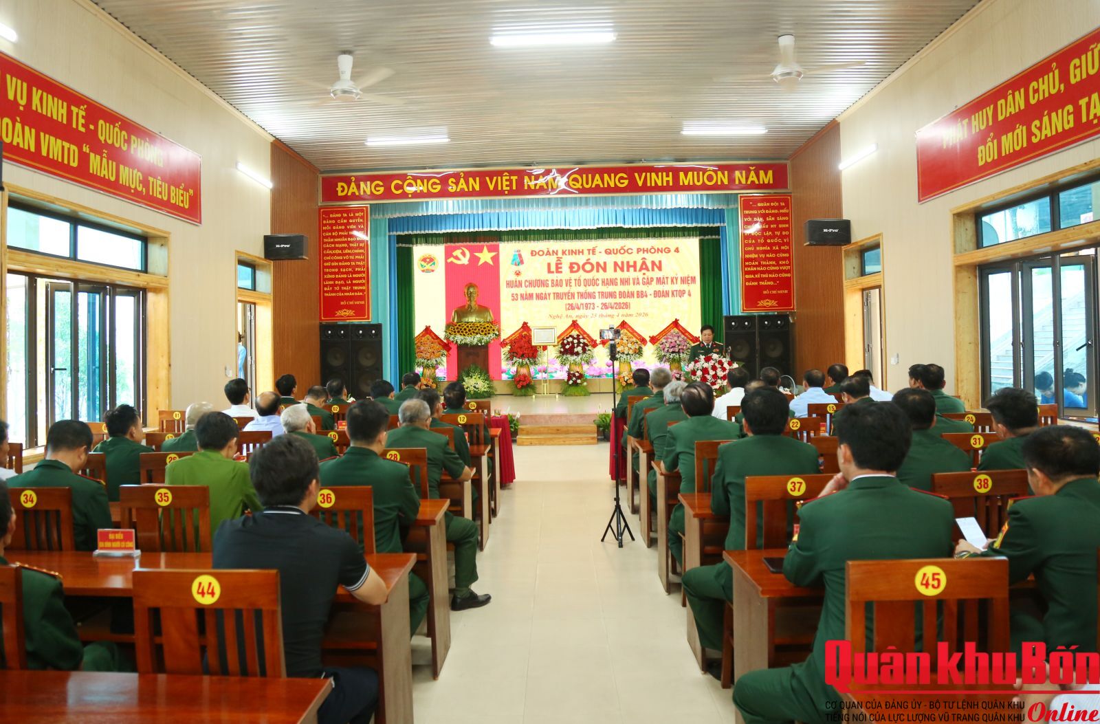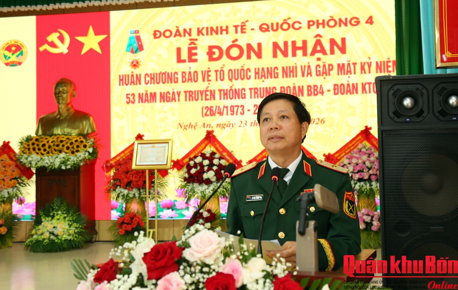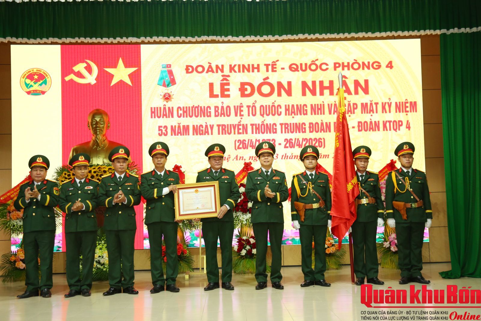Chiều ngày 23/4/2026, Đoàn Kinh tế - Quốc phòng 4 (Quân khu 4) long trọng tổ chức Lễ đón nhận Huân chương Bảo vệ Tổ quốc hạng Nhì và gặp mặt kỷ niệm 53 năm Ngày truyền thống đơn vị (26/4/1973 – 26/4/2026). Dự, chỉ đạo Lễ đón nhận có Thiếu tướng Lê Văn Trung, Ủy viên Thường vụ Đảng ủy, Phó Chính ủy Quân khu.