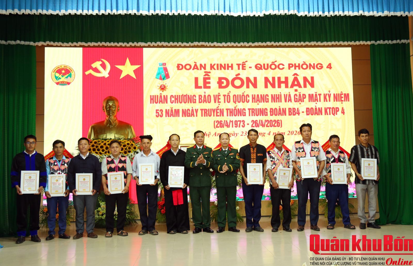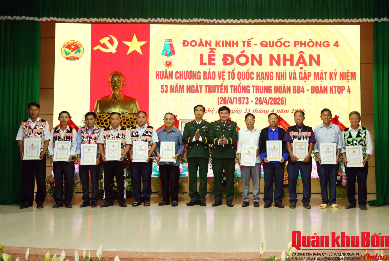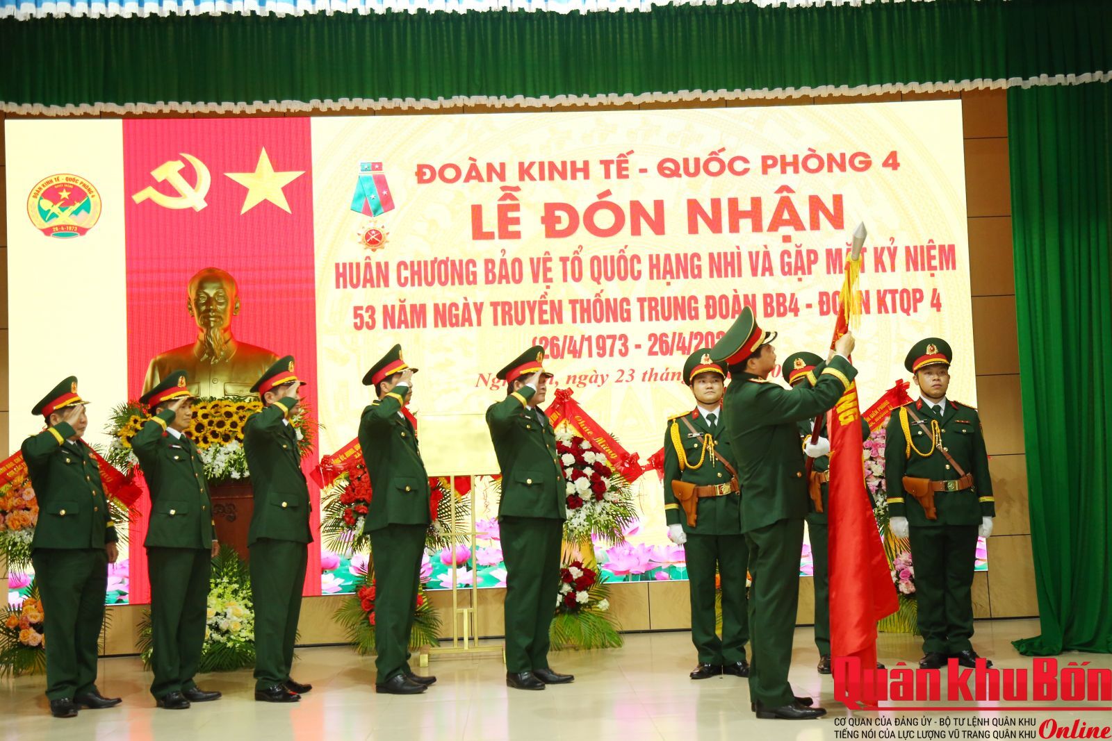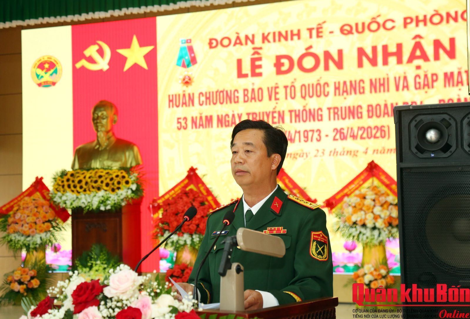 Chiều ngày 23/4/2026, Đoàn Kinh tế - Quốc phòng 4 (Quân khu 4) long trọng tổ chức Lễ đón nhận Huân chương Bảo vệ Tổ quốc hạng Nhì và gặp mặt kỷ niệm 53 năm Ngày truyền thống đơn vị (26/4/1973 – 26/4/2026). Dự, chỉ đạo Lễ đón nhận có Thiếu tướng Lê Văn Trung, Ủy viên Thường vụ Đảng ủy, Phó Chính ủy Quân khu.