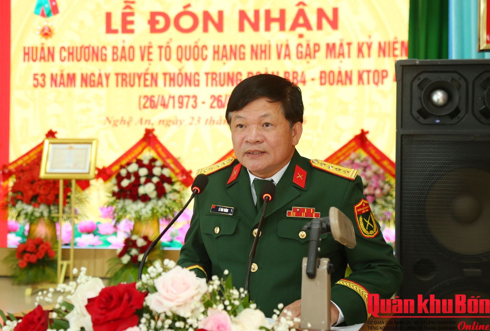 Tại buổi Lễ, thừa ủy quyền, Thiếu tướng Lê Văn Trung, Ủy viên Thường vụ Đảng ủy, Phó Chính ủy Quân khu trao Huân Chương Bảo vệ Tổ quốc hạng Nhì cho Đoàn Kinh tế - Quốc phòng 4. Đồng thời, Thiếu tướng Lê Văn Trung, phó Chính ủy Quân khu biểu dương những kết quả mà đơn vị đạt được, đồng thời yêu cầu trong thời gian tới, Đoàn tiếp tục nâng cao chất lượng huấn luyện, sẵn sàng chiến đấu; đẩy mạnh phát triển kinh tế gắn với củng cố quốc phòng, an ninh; xây dựng đơn vị vững mạnh toàn diện, hoàn thành tốt mọi nhiệm vụ được giao.