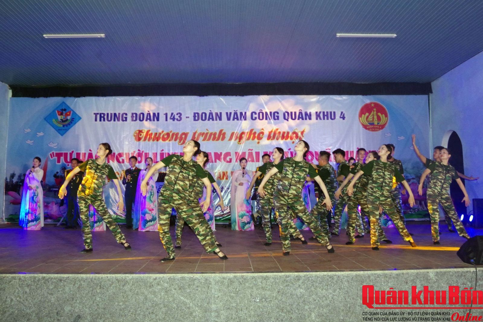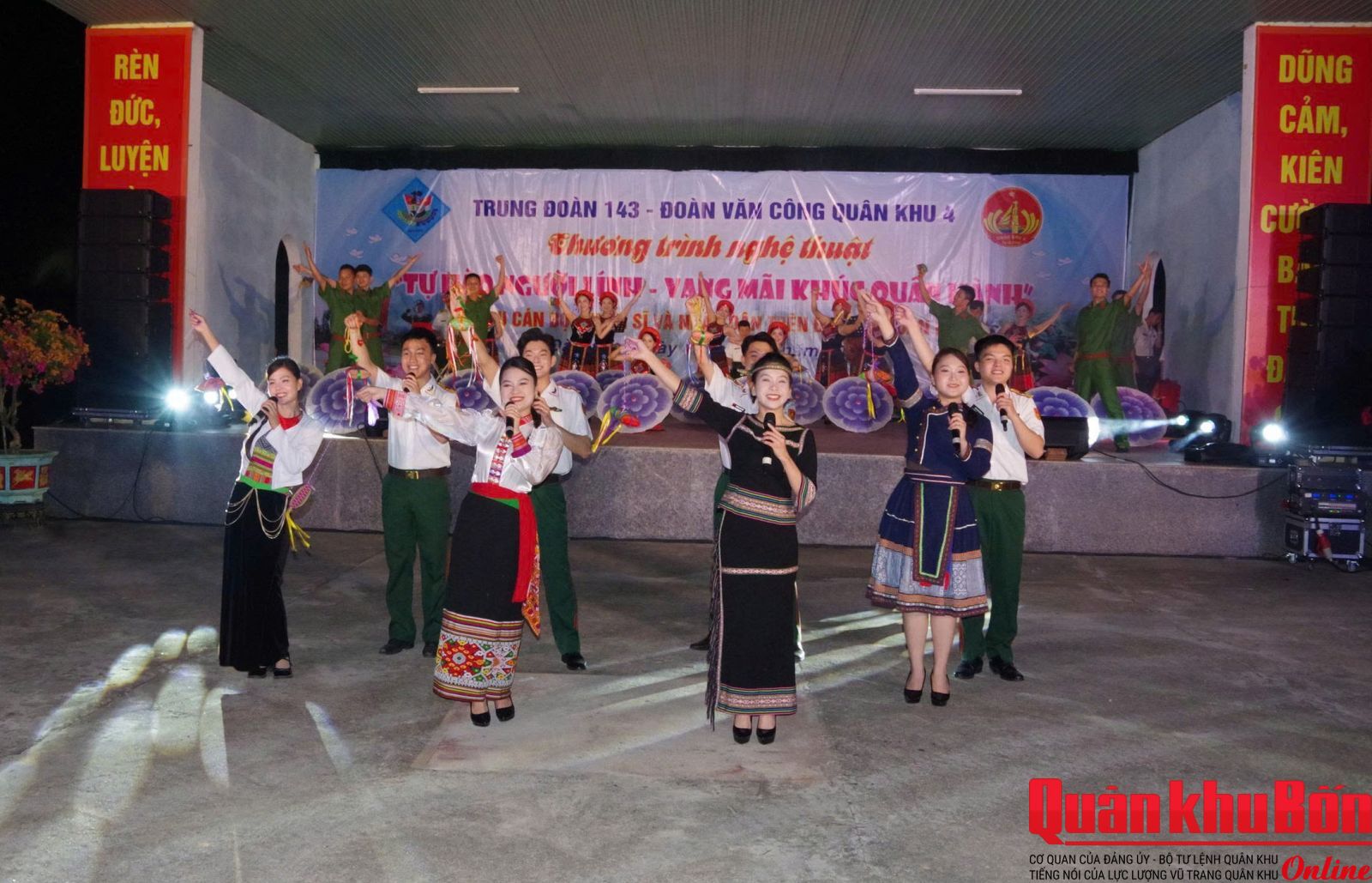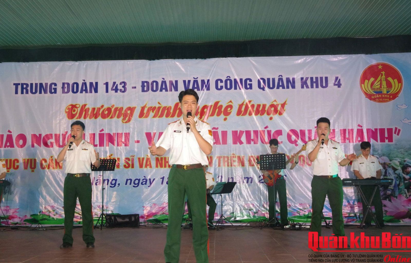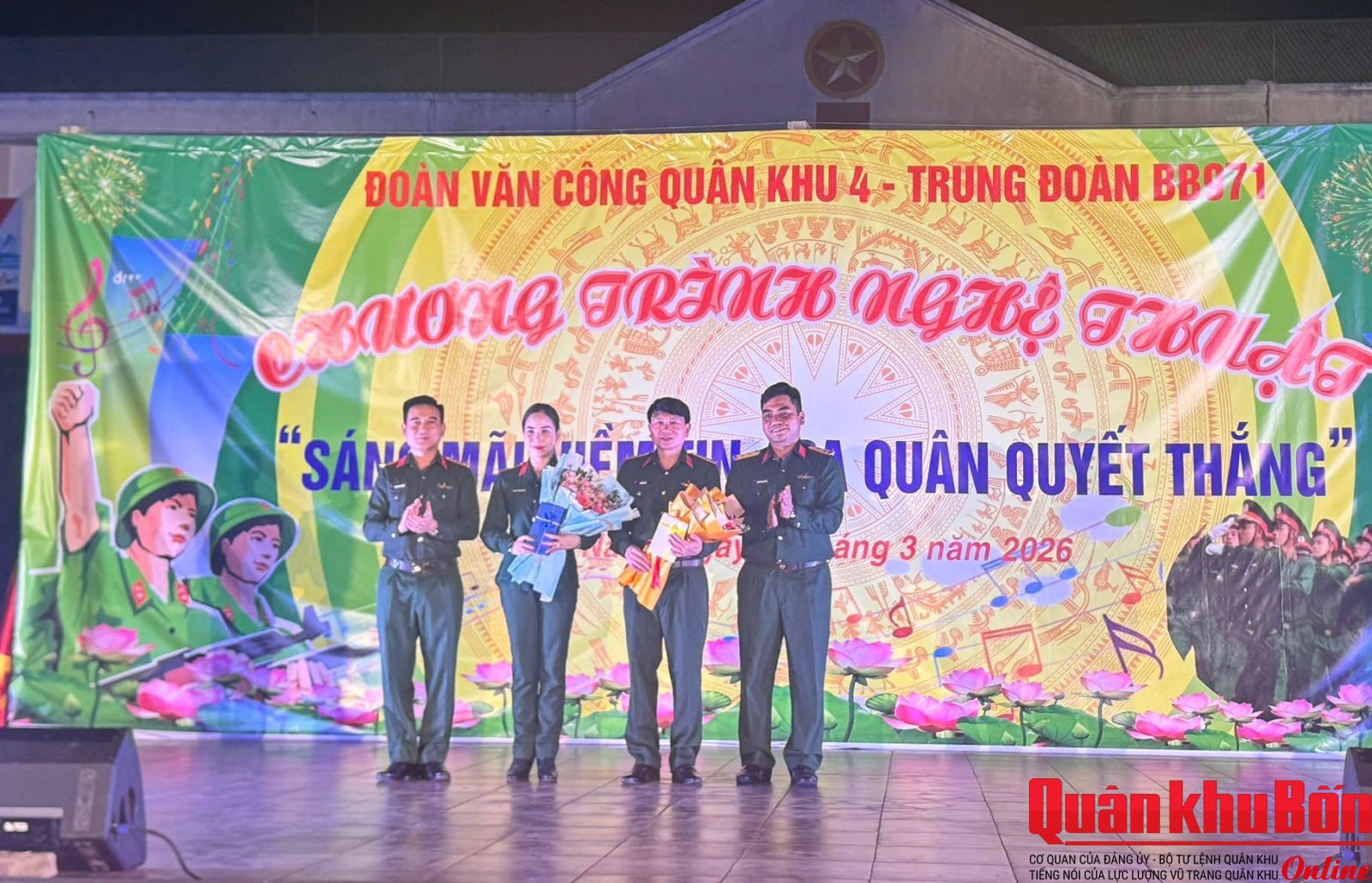 Từ ngày 18 đến 20/3/2026, Đoàn Văn công Quân khu 4 tổ chức chương trình biểu diễn nghệ thuật phục vụ cán bộ, chiến sĩ và Nhân dân tại một số đơn vị trên địa bàn Quân khu 5. Theo dõi, chỉ đạo đoàn có Đại tá Đinh Xuân Hướng, Phó Chủ nhiệm Chính trị Quân khu 4.