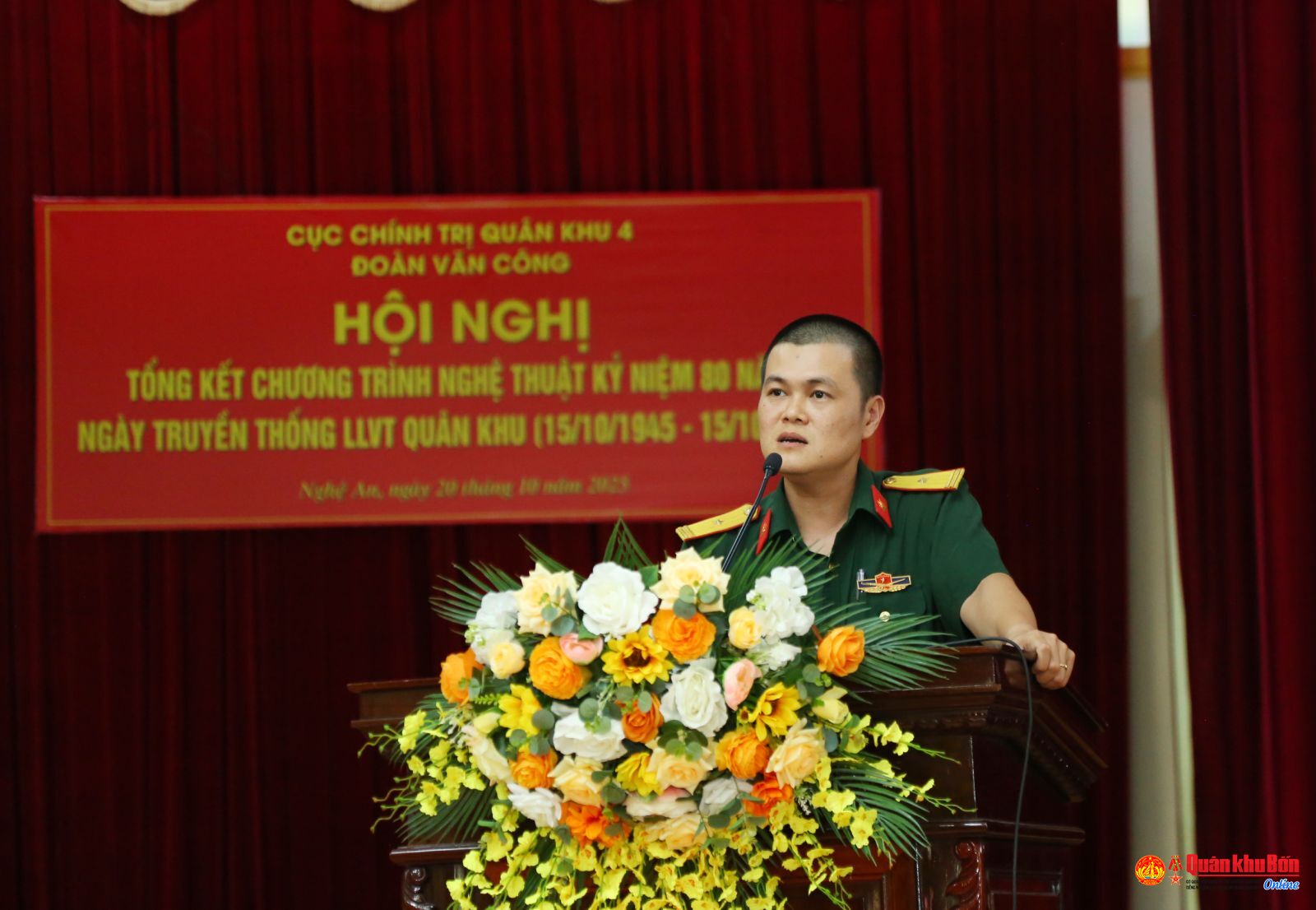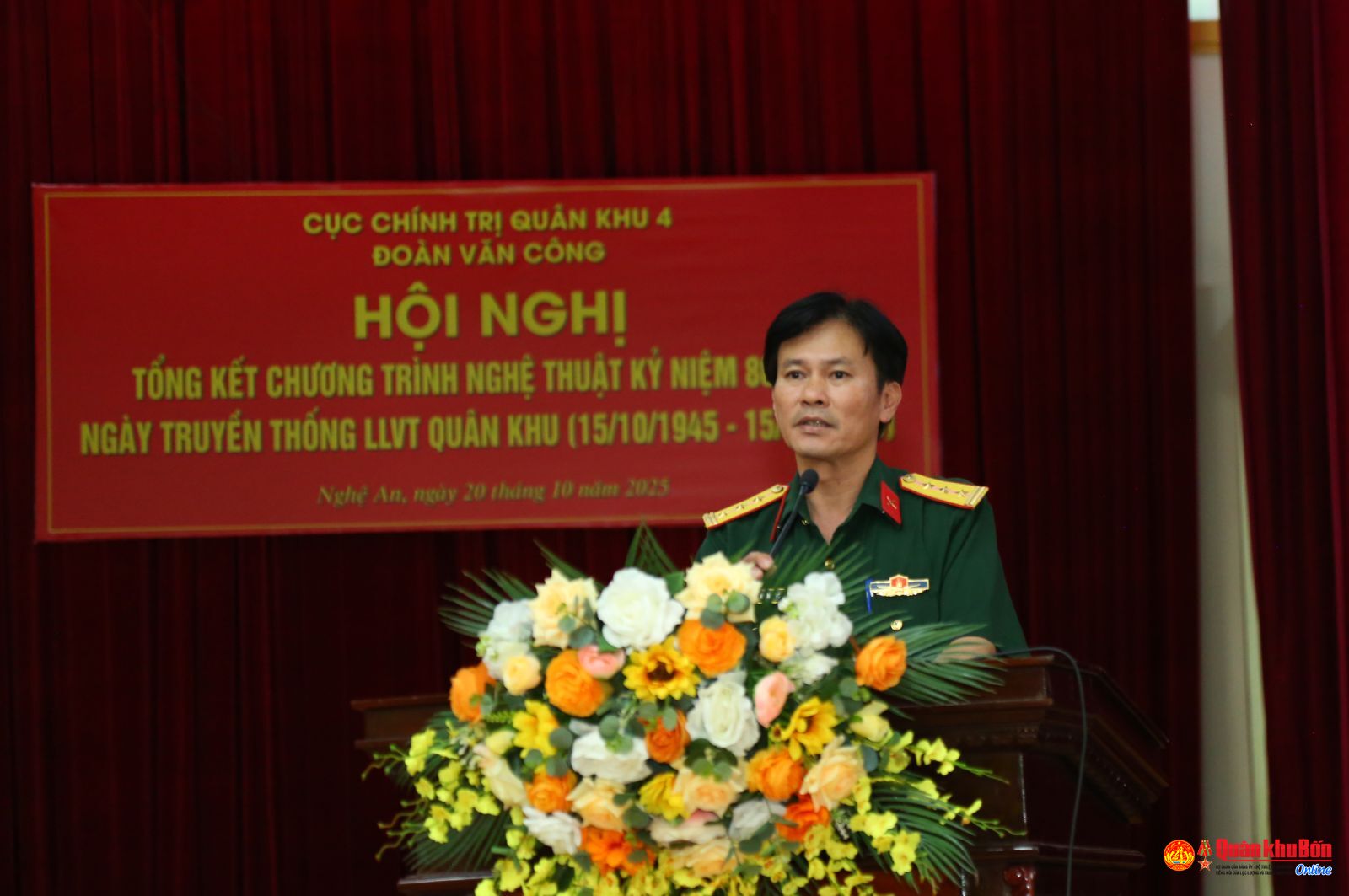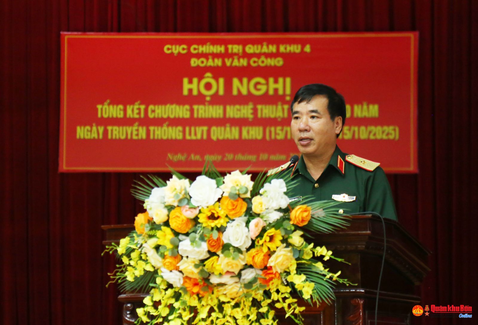 Chiều ngày 20/10/2025, Đoàn Văn công, Cục Chính trị Quân khu 4 tổ chức Hội nghị tổng kết Chương trình nghệ thuật kỷ niệm 80 năm Ngày thành lập lực lượng vũ trang (LLVT) Quân khu (15/10/1945 – 15/10/2025). Thiếu tướng Phạm Văn Đông, Ủy viên Thường vụ Đảng ủy, Chủ nhiệm Chính trị Quân khu, dự và chỉ đạo hội nghị.