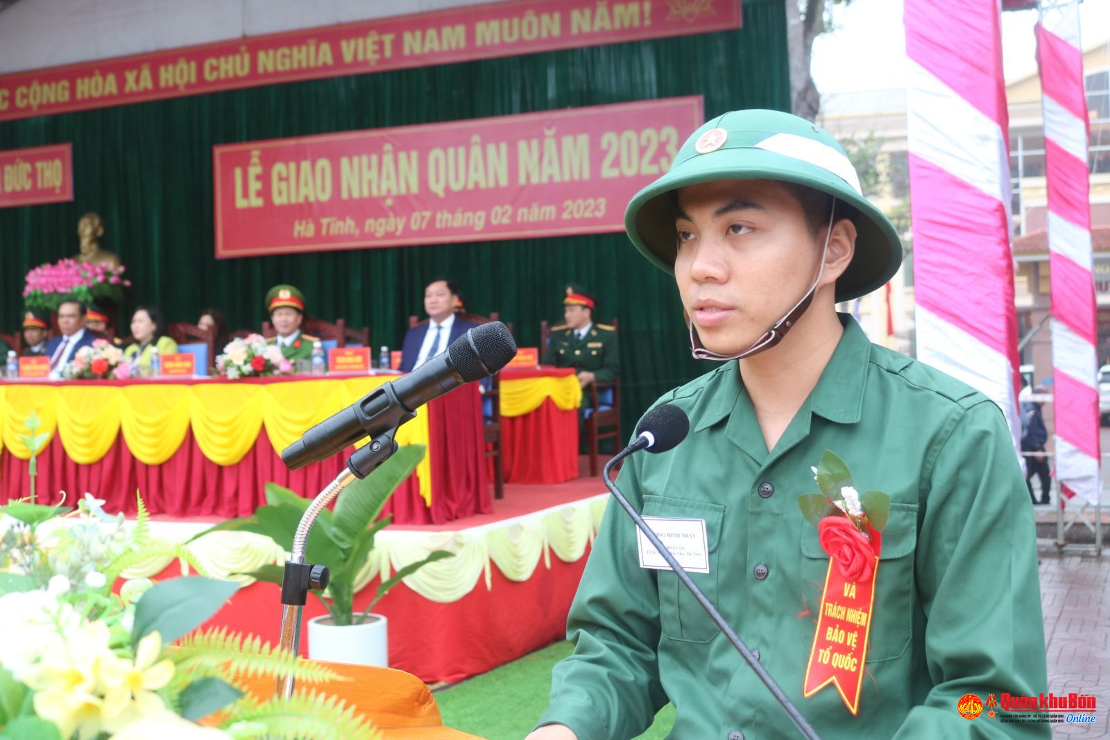 Tại buổi Lễ giao nhận quân, lãnh đạo Huyện ủy, UBND huyện Đức Thọ đã thắp lửa truyền thống, đánh trống khai hội giao quân, động viên thanh niên lên đường nhập ngũ và thanh niên Dương Minh Nhật đại diện cho 111 thanh niên phát biểu với quyết tâm đem sức trẻ của quê hương Đức Thọ cống hiến, phục vụ Tổ quốc, hoàn thành tốt mọi nhiệm vụ được giao.