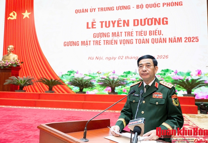 Chiều 2/4/2026, tại Hội trường Bộ Quốc phòng, Quân ủy Trung ương - Bộ Quốc phòng trang trọng tổ chức Lễ tuyên dương Gương mặt trẻ tiêu biểu, Gương mặt trẻ triển vọng toàn quân năm 2025. Đại tướng Phan Văn Giang, Ủy viên Bộ Chính trị, Phó bí thư Quân ủy Trung ương, Bộ trưởng Bộ Quốc phòng dự, phát biểu chỉ đạo.