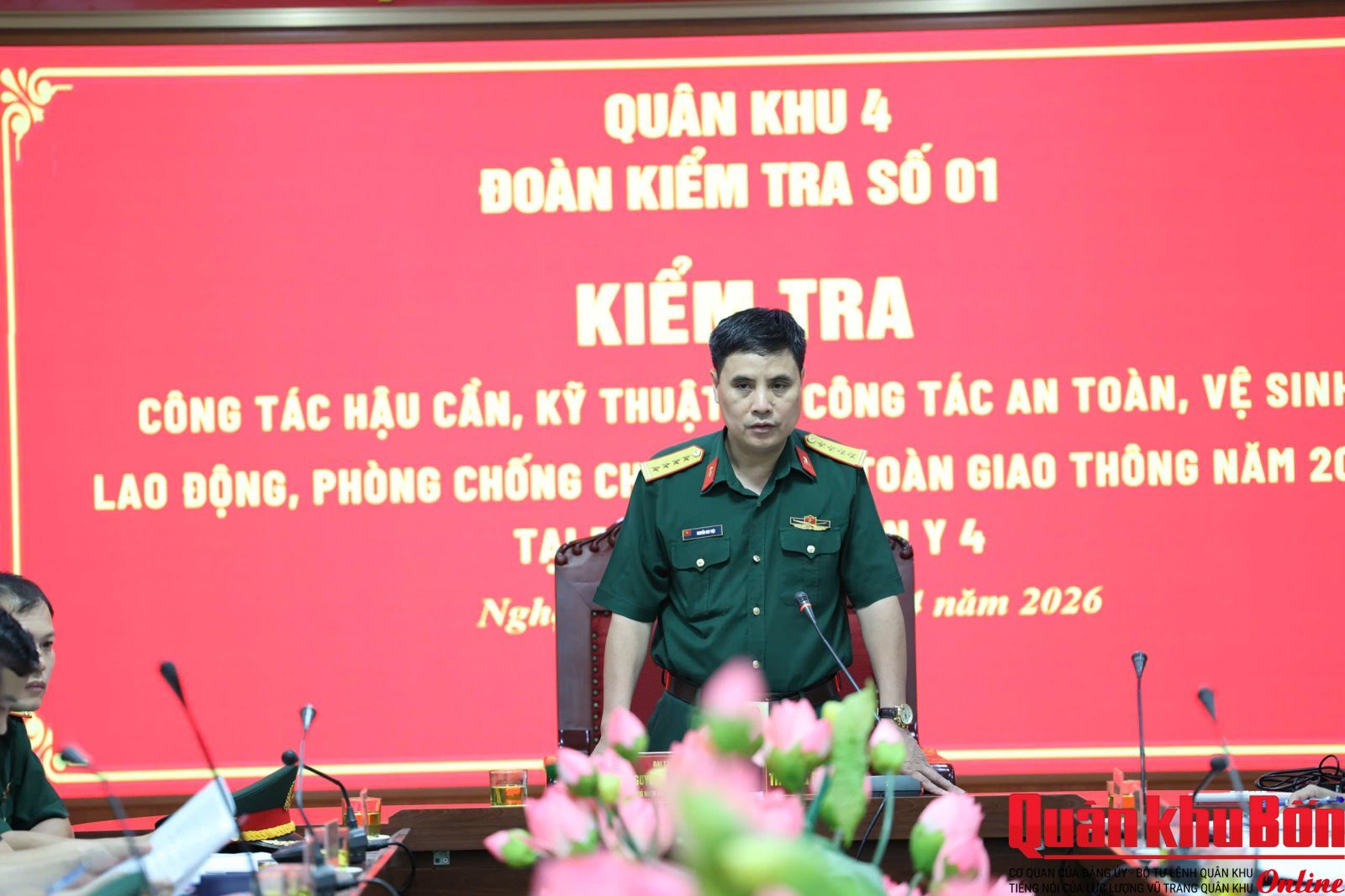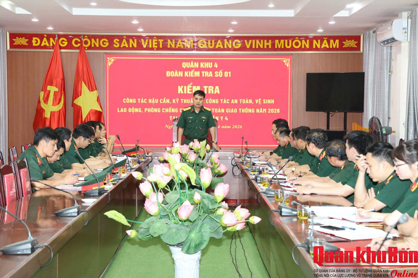 Chiều 24/4/2026, Đoàn công tác Quân khu 4 do Đại tá Nguyễn Huy Việt, Phó Chủ nhiệm Hậu cần - Kỹ thuật Quân khu làm trưởng đoàn đã tiến hành kiểm tra công tác hậu cần, kỹ thuật; an toàn, vệ sinh lao động (ATVSLĐ); phòng chống cháy nổ (PCCN) và an toàn giao thông (ATGT) tại Bệnh viện Quân y 4.