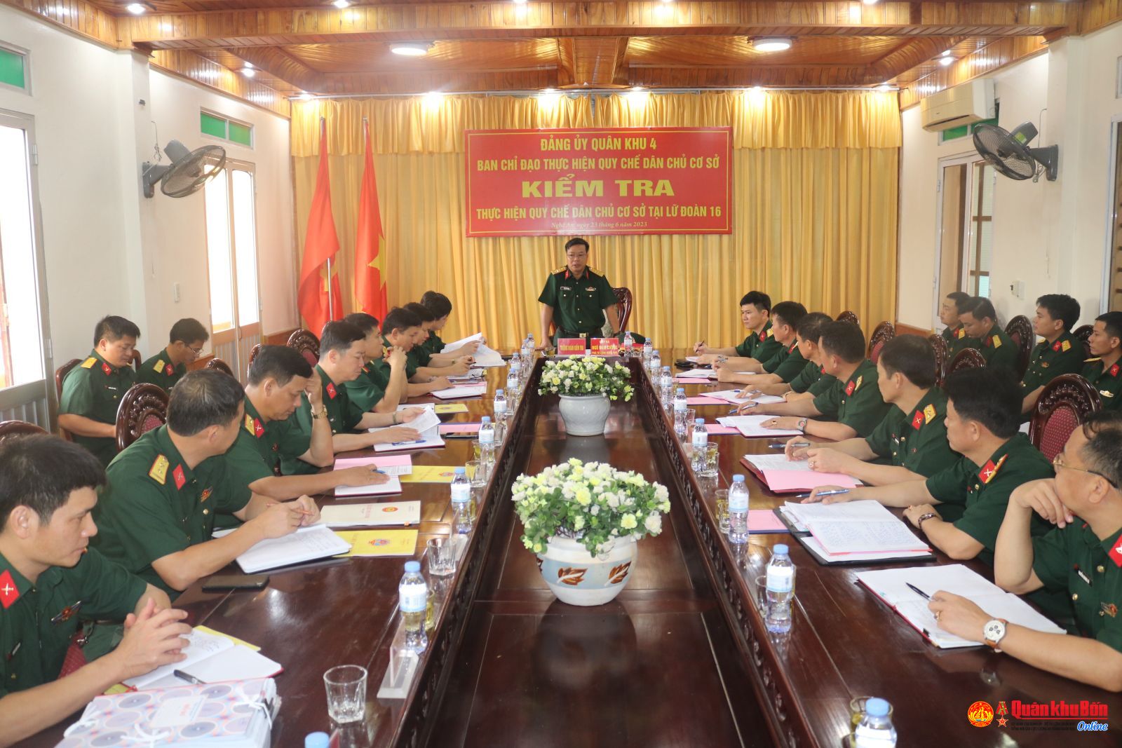 Qua kiểm tra và đối thoại vói cán bộ, chiến sĩ đơn vị, Đại tá Ngô Nam Cường, Phó Tư lệnh Quân khu ghi nhận, đánh giá cao việc thực hiện quy chế dân chủ cơ sở của Lữ đoàn 16 trong thời gian qua. Trong đó, nổi bật là 6 tháng đầu năm 2023, việc triển khai và thực hiện quy chế dân chủ cơ sở ở Lữ đoàn luôn được cấp ủy, chỉ huy các cấp quan tâm lãnh đạo, chỉ đạo và triển khai thực hiện nghiêm túc; dân chủ cơ sở hoạt động có nề nếp; nhận thức trách nhiệm của lãnh đạo, chỉ huy và cán bộ, chiến sĩ được nâng lên. Dân chủ trong hoạt động lãnh đạo của cấp ủy, chỉ huy, hội đồng quân nhân và các tổ chức quần chúng ngày càng được mở rộng, quyền dân chủ của quân nhân được phát huy, đơn vị an toàn, địa bàn an toàn. Nội bộ đoàn kết, thống nhất cao, Lữ đoàn hoàn thành tốt nhiệm vụ, có nhiệm vụ hoàn thành xuất sắc, là một trong số các đơn vị dẫn đầu phong trào thi đua quyết thắng của Quân khu 4.