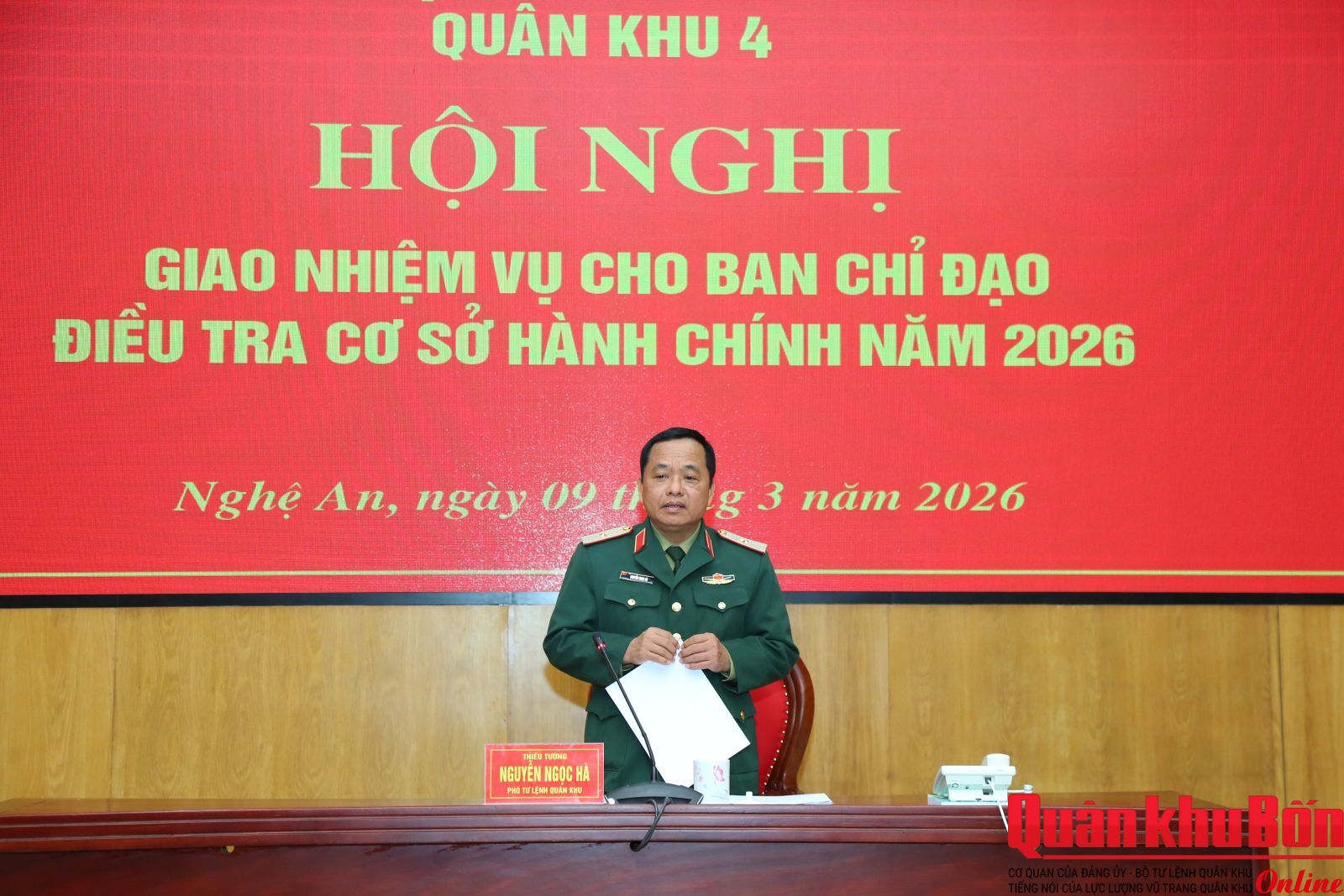 Sáng 9/3/2026, Bộ Tư lệnh Quân khu 4 tổ chức Hội nghị giao nhiệm vụ cho Ban Chỉ đạo điều tra cơ sở hành chính năm 2026. Thiếu tướng Nguyễn Ngọc Hà, Phó Tư lệnh Quân khu, Trưởng Ban Chỉ đạo chủ trì hội nghị.