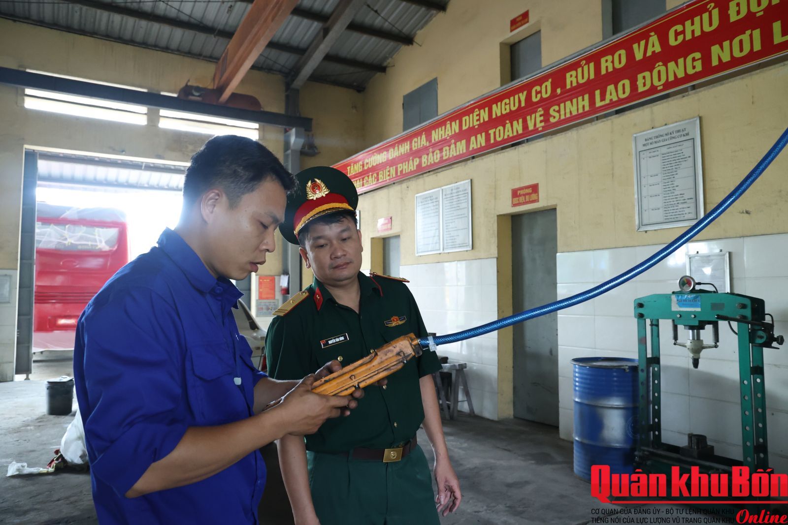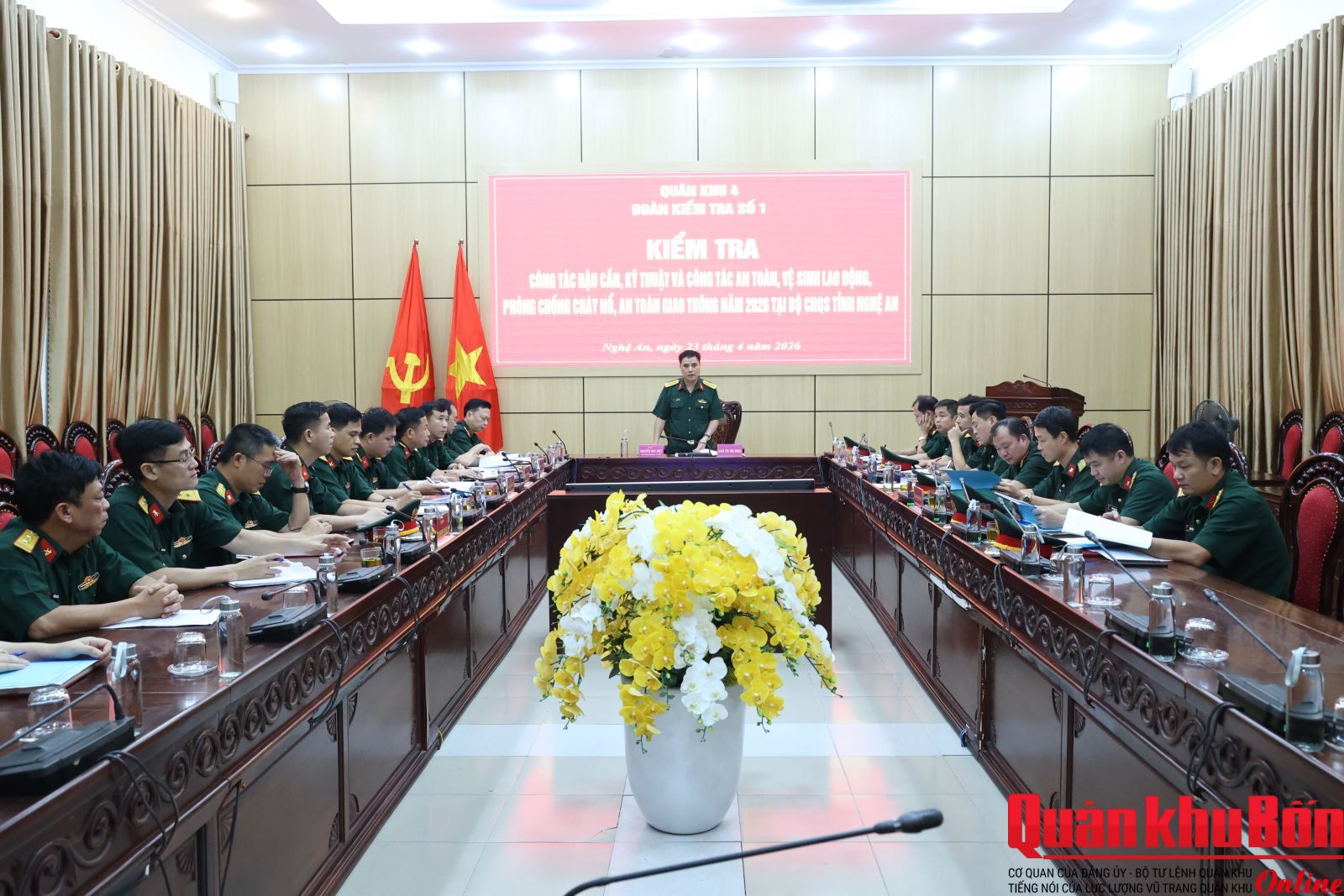 Sáng 23/4/2026, Đoàn công tác Quân khu 4 do Đại tá Nguyễn Huy Việt, Phó Chủ nhiệm Hậu cần - Kỹ thuật Quân khu làm trưởng đoàn đã tiến hành kiểm tra toàn diện công tác an toàn, vệ sinh lao động (ATVSLĐ) và phòng chống cháy nổ (PCCN) tại Bộ Chỉ huy Quân sự (CHQS) tỉnh Nghệ An. Tham dự buổi kiểm tra có đại diện lãnh đạo Bộ CHQS tỉnh và chỉ huy các cơ quan, đơn vị trực thuộc.