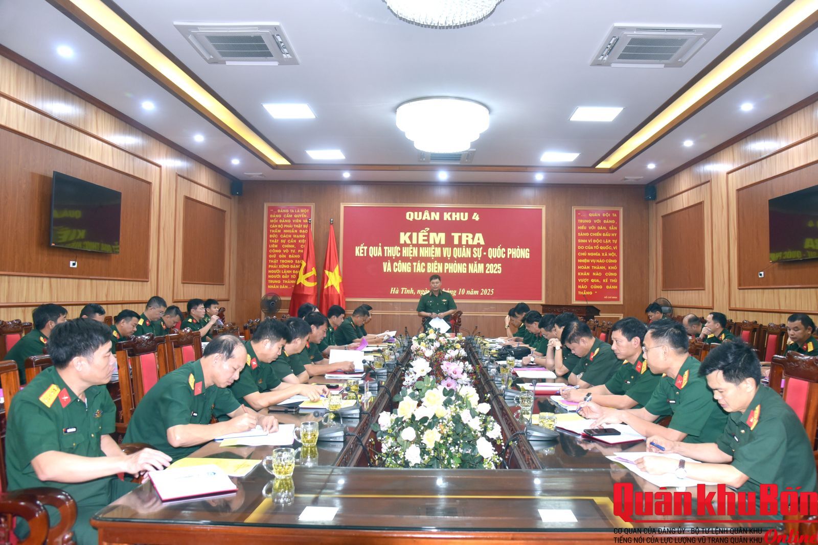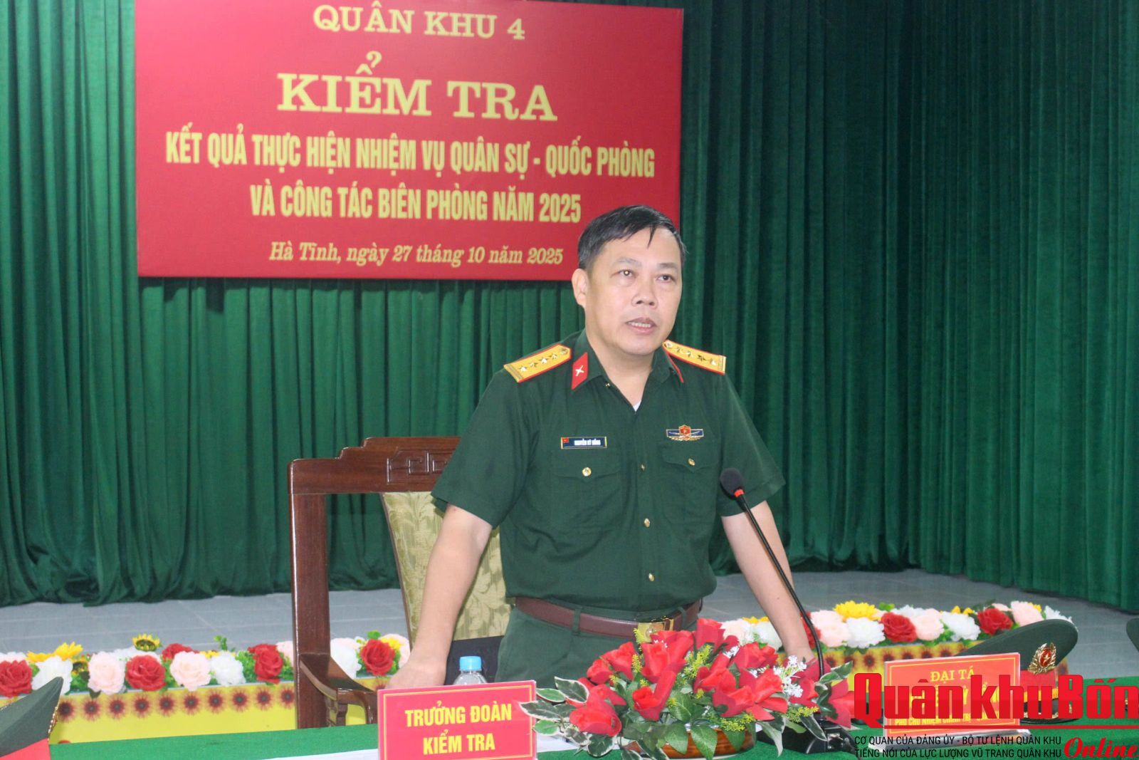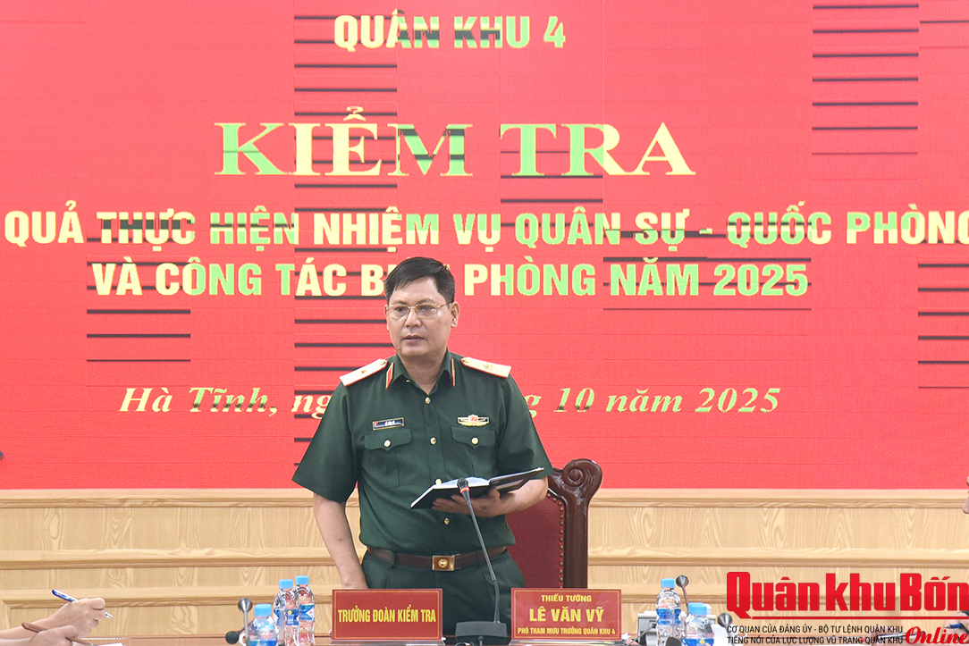Ngày 27/10/2025, Đoàn công tác Quân khu 4 do Thiếu tướng Lê Văn Vỹ, Phó Tham mưu trưởng Quân khu, làm trưởng đoàn đã tiến hành kiểm tra kết quả thực hiện nhiệm vụ quân sự, quốc phòng và công tác Biên phòng năm 2025 tại Bộ Chỉ huy Quân sự tỉnh Hà Tĩnh. Tham gia đoàn có Đại tá Nguyễn Kỳ Hồng, Phó Chủ nhiệm Chính trị Quân khu; Đại tá Nguyễn Huy Việt, Phó Chủ nhiệm Hậu cần - Kỹ thuật Quân khu cùng đại diện một số cơ quan chức năng của Quân khu.