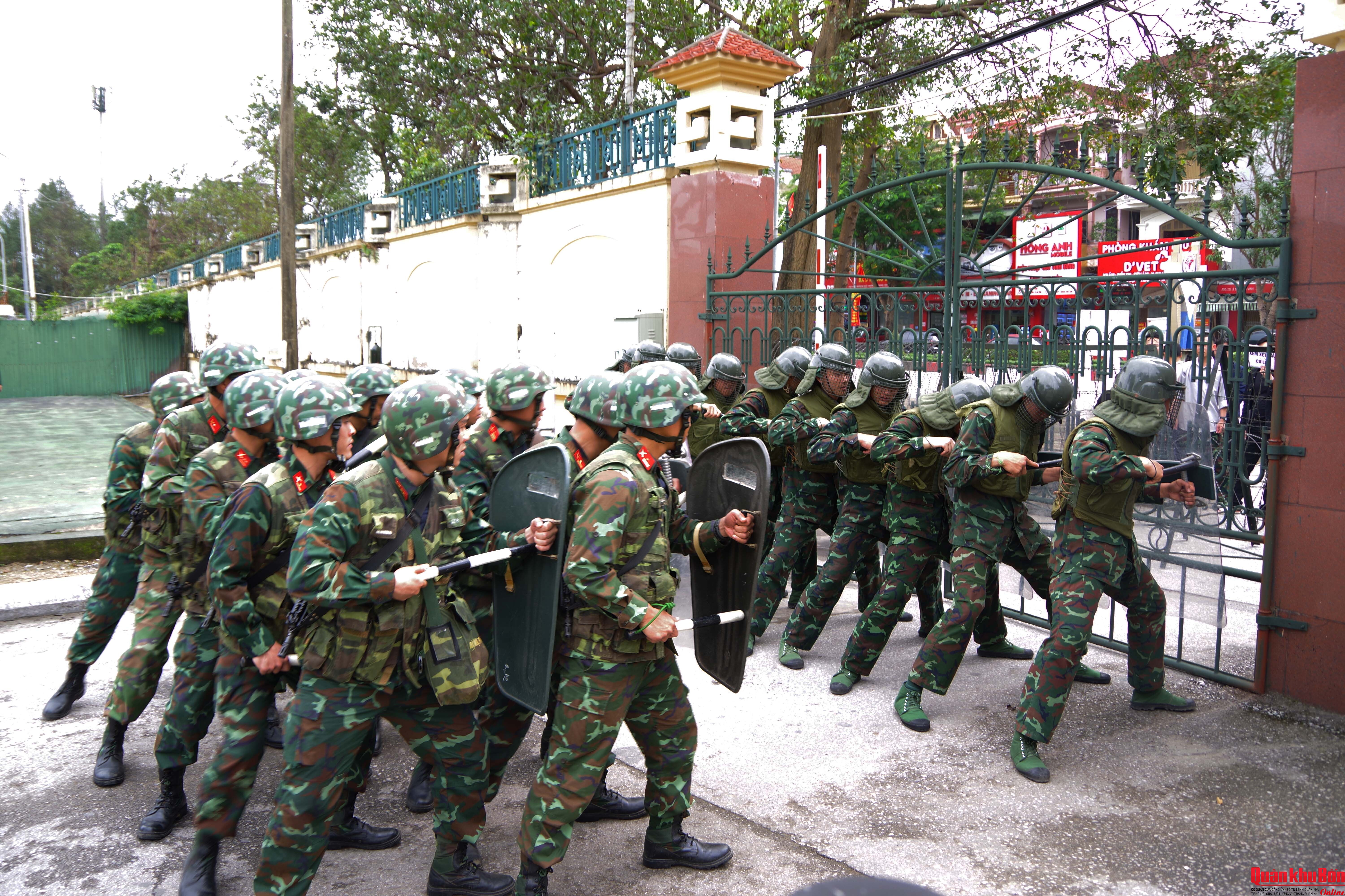 Theo đó, khối cơ quan Quân khu và các đơn vị liên quan đã tổ chức luyện tập xử trí các tình huống giả định như: tụ tập đông người gây rối an ninh trật tự; đối tượng xấu đột nhập doanh trại, phá hoại cơ sở vật chất; các hoạt động chống phá nhằm làm mất ổn định tình hình trước, trong và sau bầu cử...