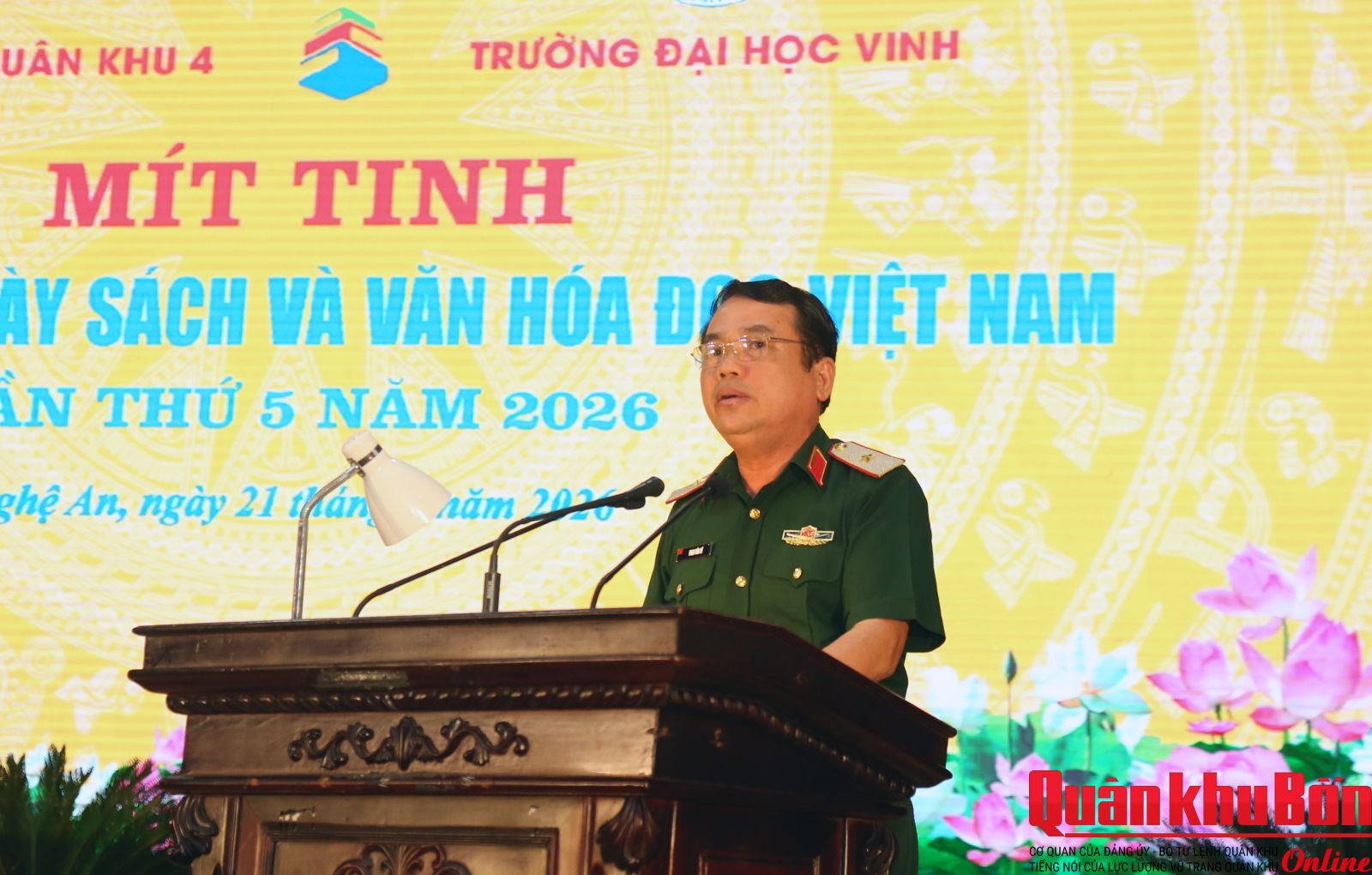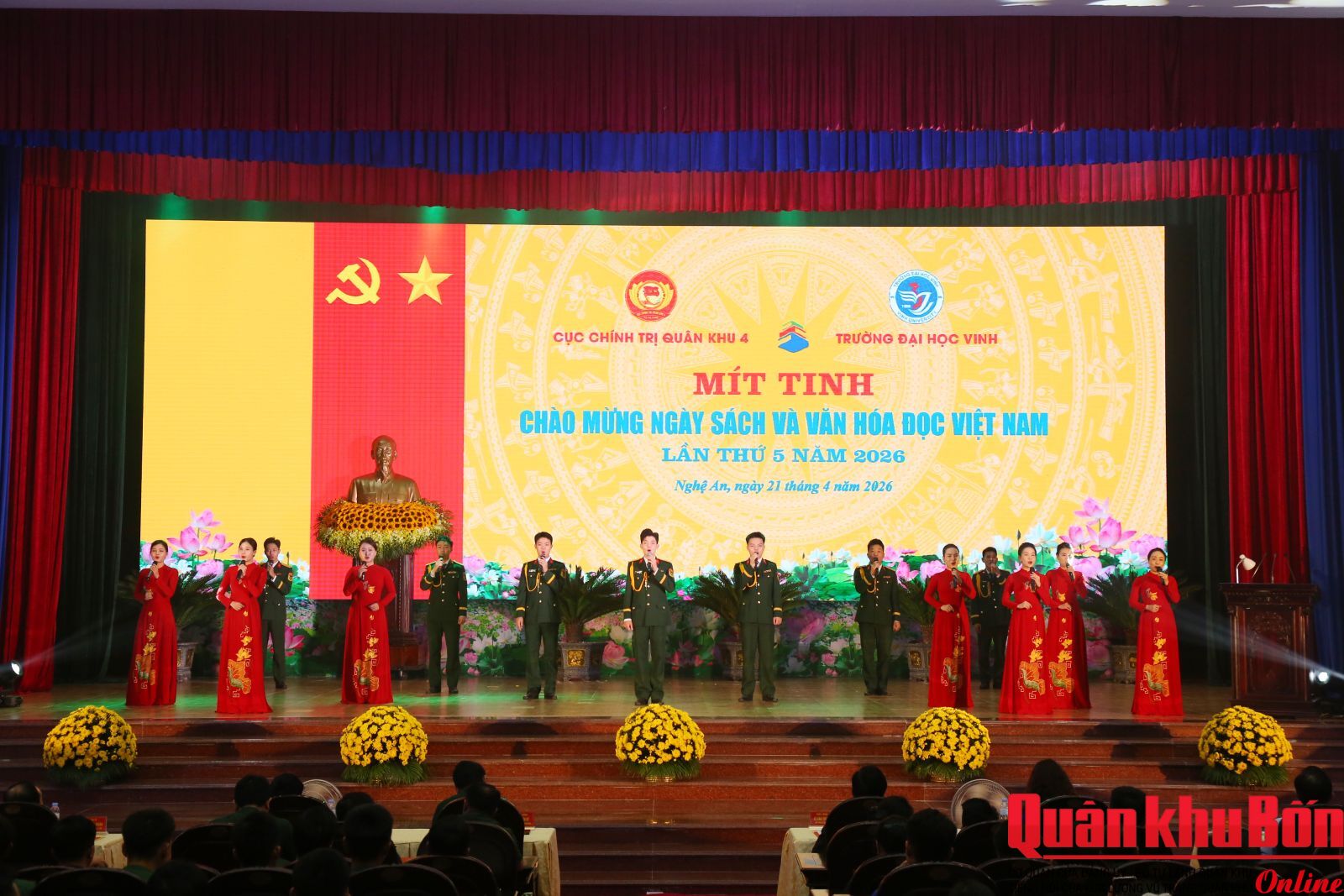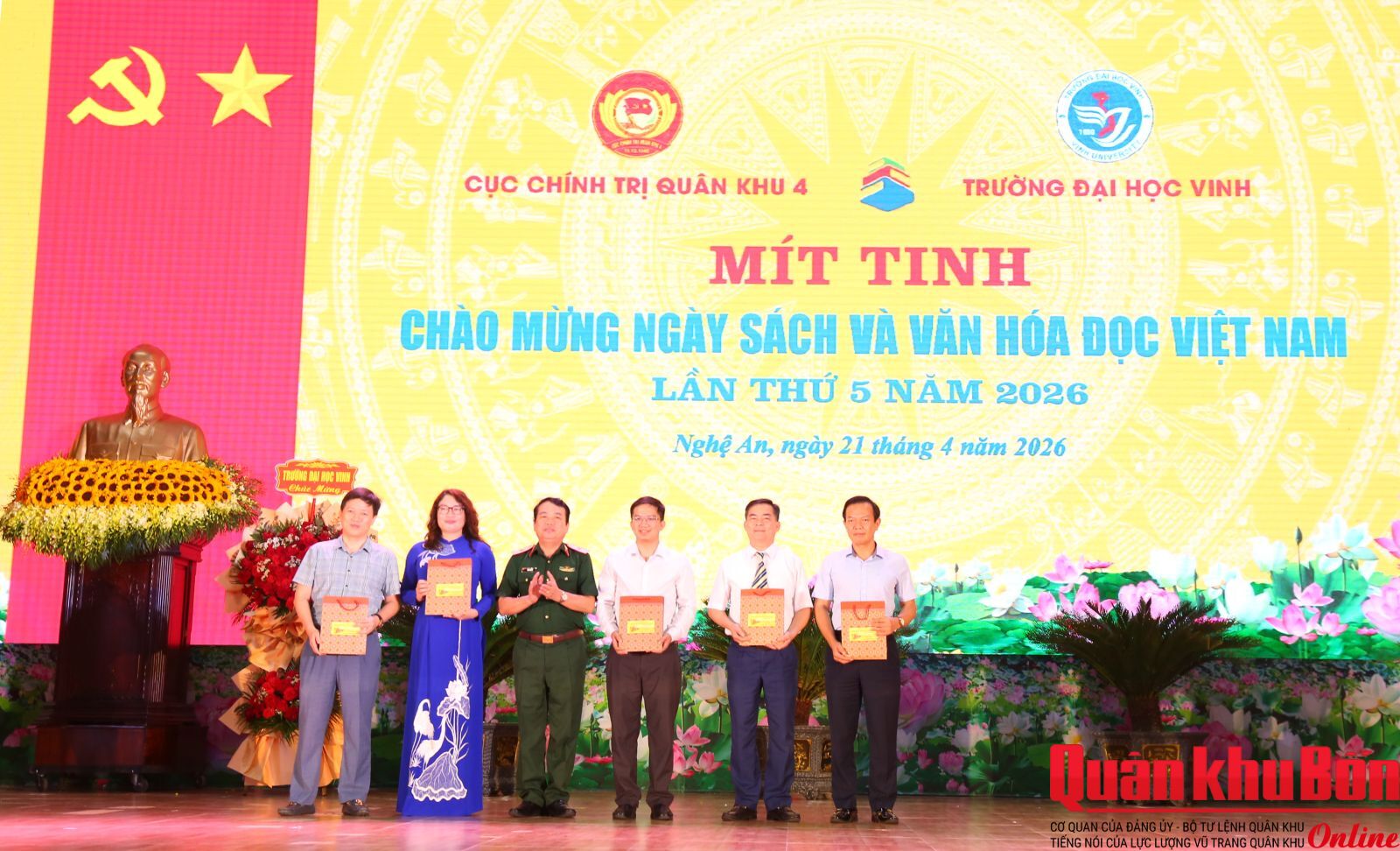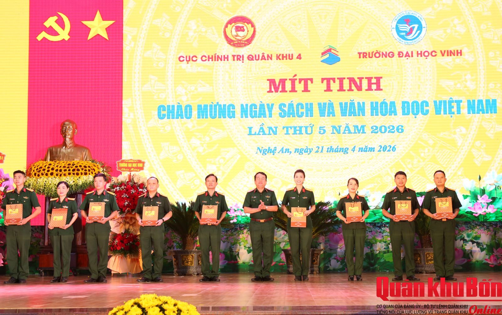 Chiều 21/4/2026, tại Nghệ An, Cục Chính trị Quân khu 4 phối hợp với Trường Đại học Vinh tổ chức mít tinh chào mừng Ngày Sách và Văn hóa đọc Việt Nam lần thứ 5 năm 2026. Hoạt động diễn ra trong không khí thi đua sôi nổi chào mừng kỷ niệm 51 năm Ngày giải phóng miền Nam, thống nhất đất nước (30/4), 72 năm Chiến thắng Điện Biên Phủ (7/5) và kỷ niệm 136 năm Ngày sinh Chủ tịch Hồ Chí Minh (19/5). Thiếu tướng Lê Văn Trung, Ủy viên Ban Thường vụ Đảng ủy, Phó Chính ủy Quân khu 4 dự, chỉ đạo chương trình.