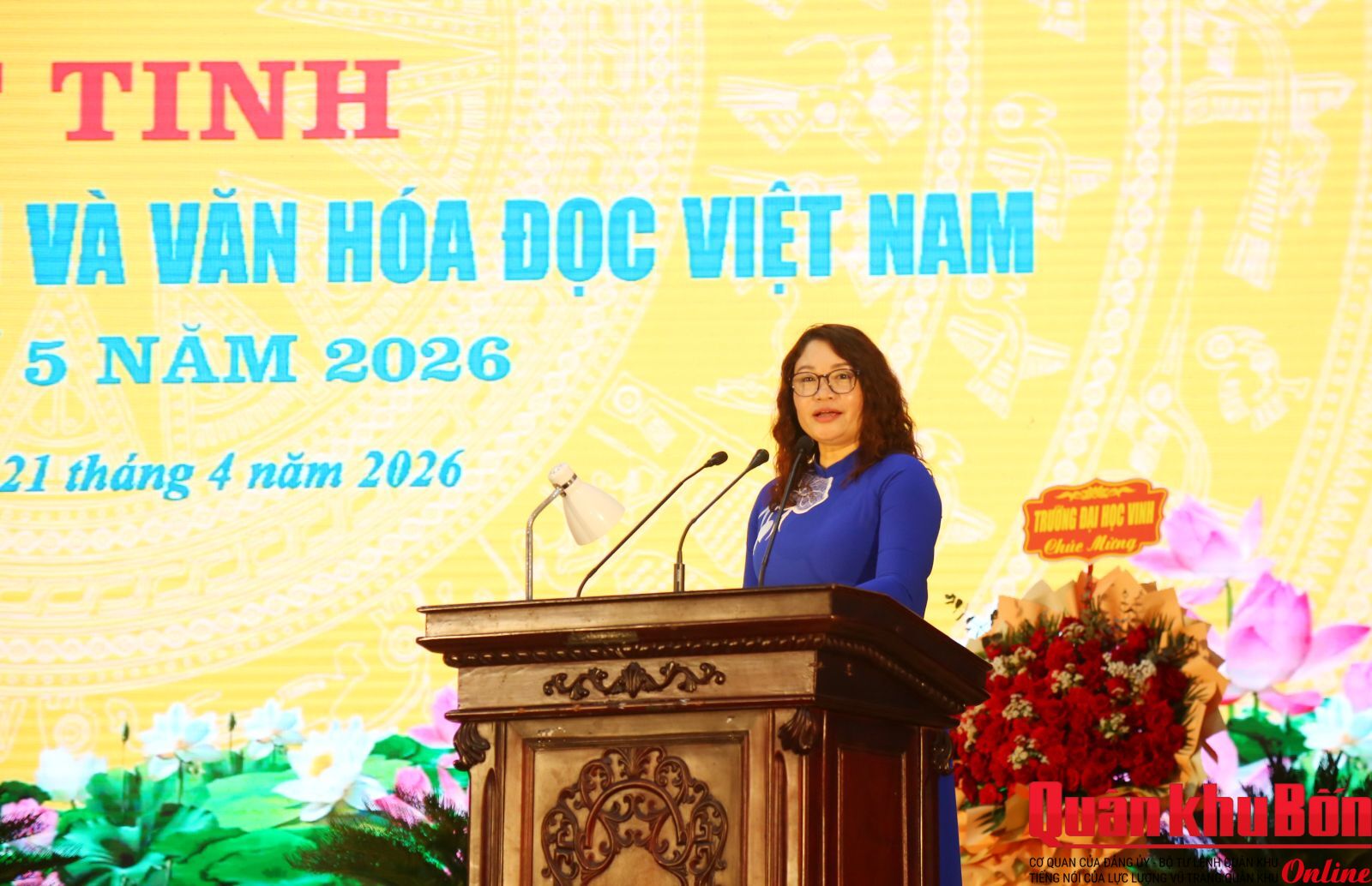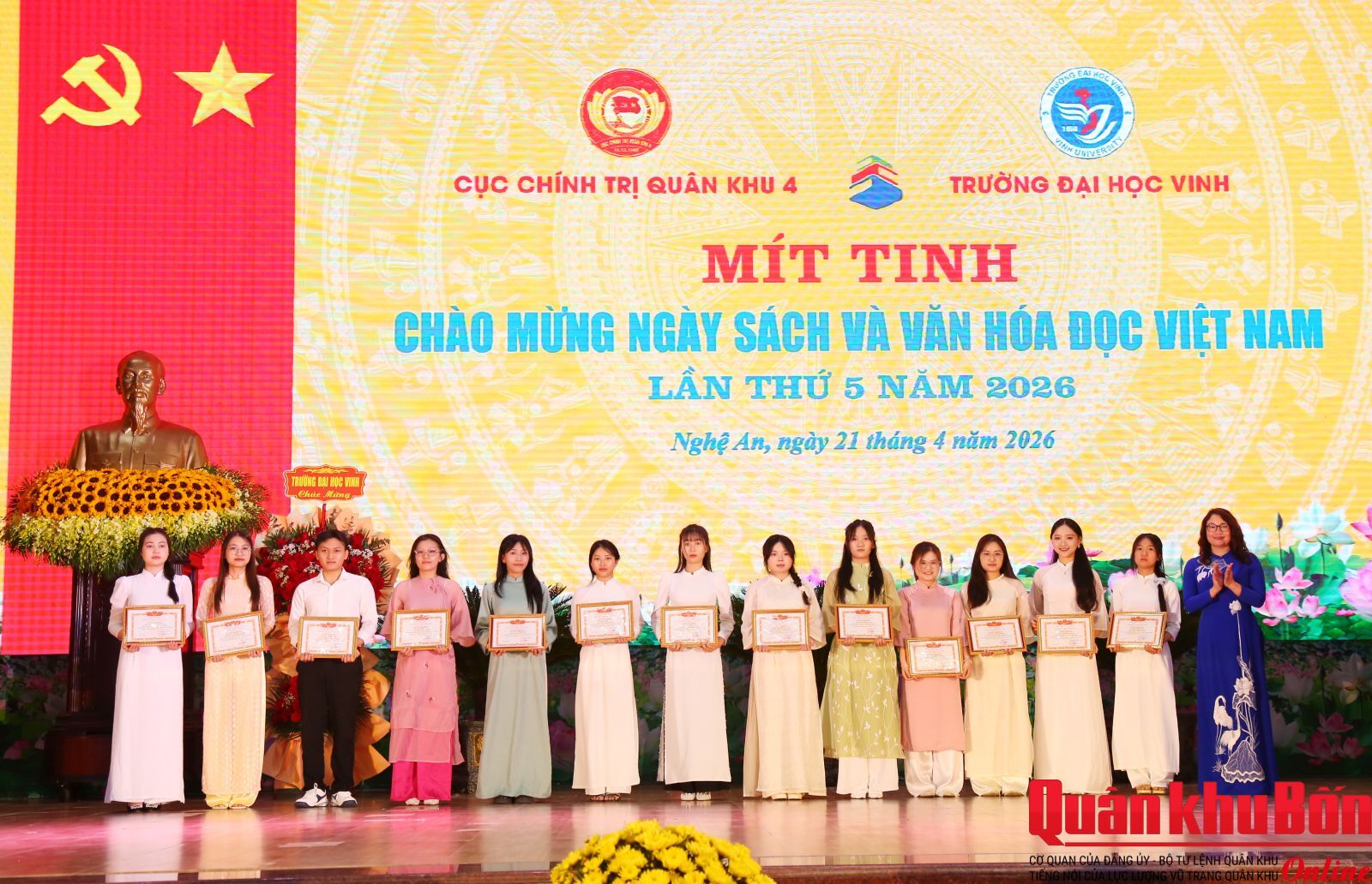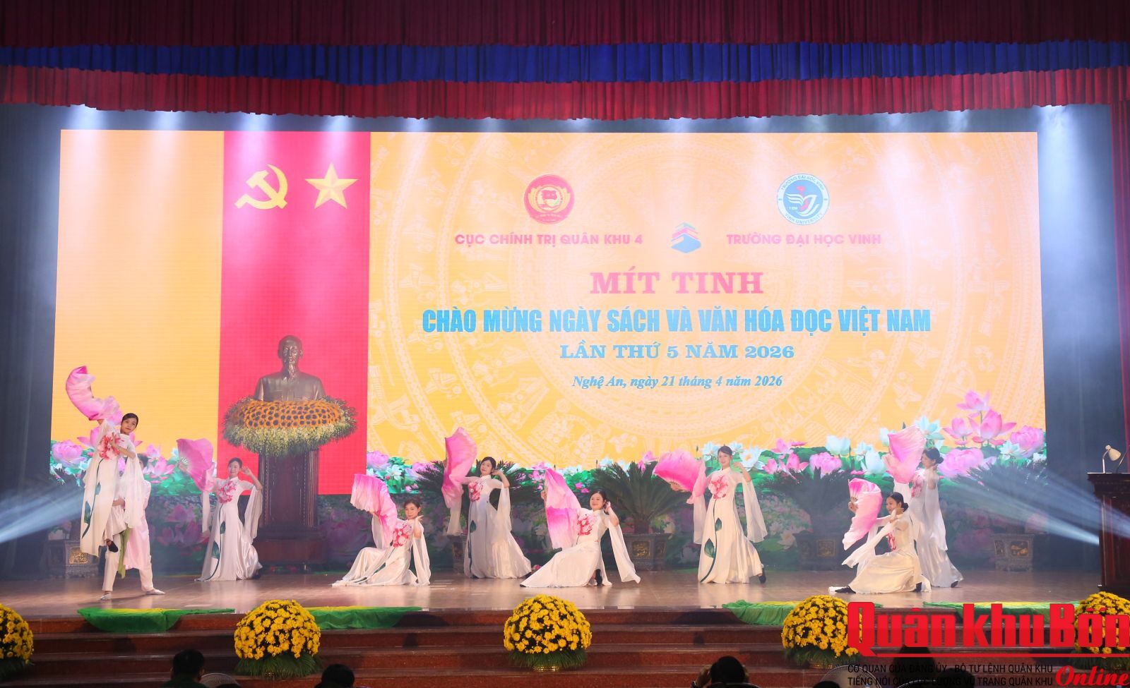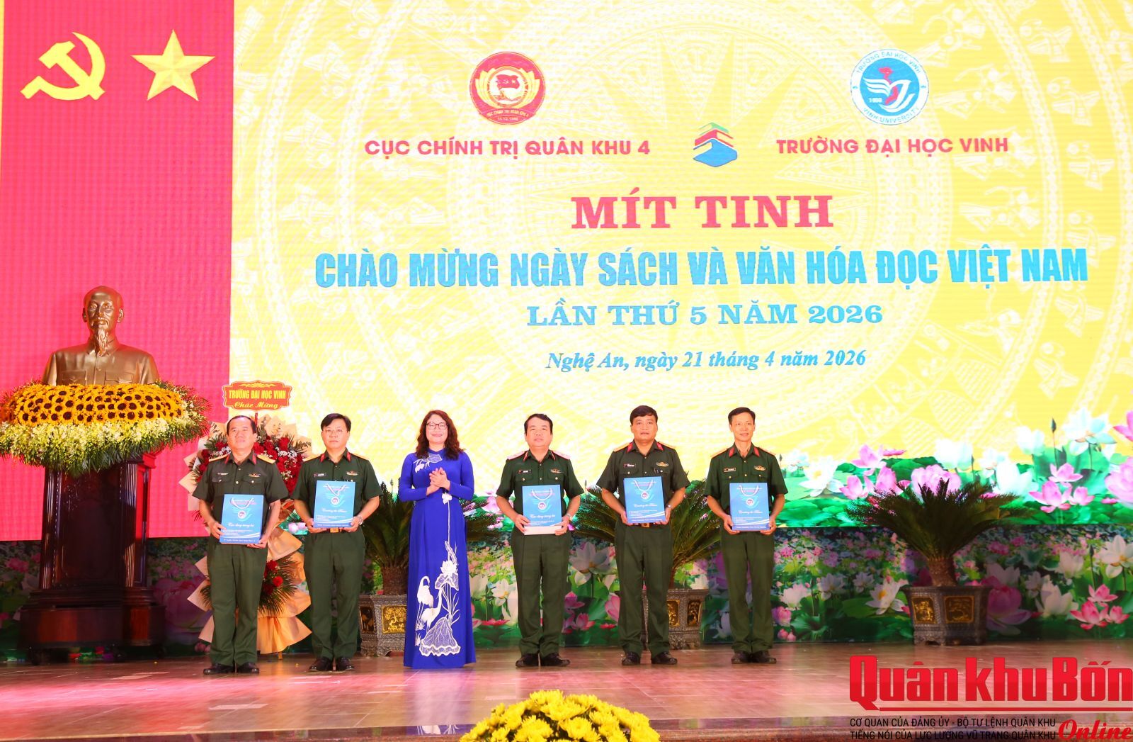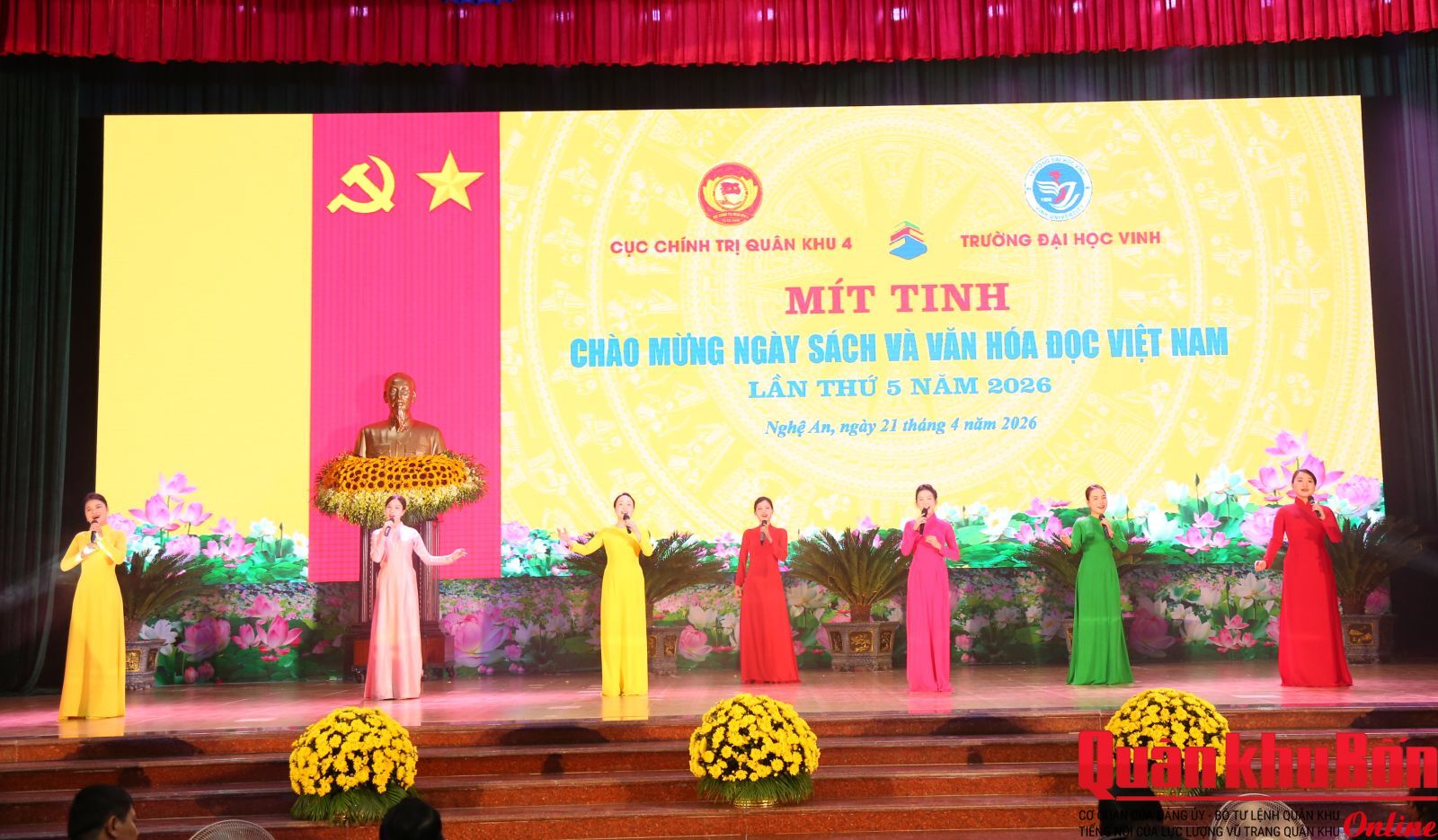 Chiều 21/4/2026, tại Nghệ An, Cục Chính trị Quân khu 4 phối hợp với Trường Đại học Vinh tổ chức mít tinh chào mừng Ngày Sách và Văn hóa đọc Việt Nam lần thứ 5 năm 2026. Hoạt động diễn ra trong không khí thi đua sôi nổi chào mừng kỷ niệm 51 năm Ngày giải phóng miền Nam, thống nhất đất nước (30/4), 72 năm Chiến thắng Điện Biên Phủ (7/5) và kỷ niệm 136 năm Ngày sinh Chủ tịch Hồ Chí Minh (19/5). Thiếu tướng Lê Văn Trung, Ủy viên Ban Thường vụ Đảng ủy, Phó Chính ủy Quân khu 4 dự, chỉ đạo chương trình.