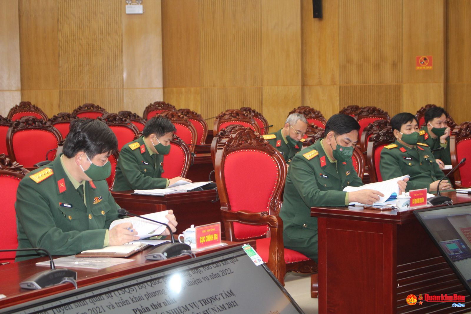Để phát huy kết quả đạt được trong năm 2021, Hội nghị xác định năm 2022, đối với công tác tuyển sinh đại học, cao đẳng, trung cấp quân sự, các cơ quan chức năng Bộ Quốc phòng, Ban tuyển sinh quân sự các địa phương, đơn vị, các học viện, nhà trường tiếp tục tăng cường công tác tuyên truyền, hướng nghiệp tuyển sinh quân sự. Ban tuyển sinh quân sự cấp huyện, đơn vị cấp trung đoàn và tương đương, các nhà trường tổ chức tốt công tác sơ tuyển, xét tuyển, bàn giao thí sinh trúng tuyển nhập học chặt chẽ, đúng quy định. Thực hiện nghiêm công tác khám phúc tra sức khỏe thí sinh trúng tuyển nhập học và làm tốt việc hậu kiểm, có phương án tự chủ tuyển sinh. Đối với công tác tuyển sinh đào tạo sau đại học, tổ chức chặt chẽ việc tạo nguồn, ôn luyện cho cán bộ dự thi, xét tuyển; hướng dẫn tổ chức tuyển sinh đào tạo trình độ thạc sĩ, tiến sĩ theo đúng quy trình, quy định và đủ chỉ tiêu được giao. Tuyển sinh theo chế độ cử tuyển và tuyển sinh ngành quân sự cơ sở, các đơn vị, địa phương lựa chọn nguồn đề nghị đào tạo bảo đảm phù hợp với nhu cầu sử dụng trong thời gian tới.
