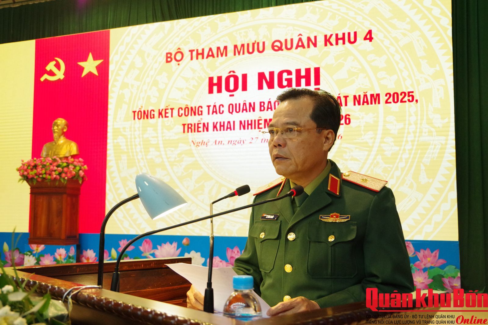 Phát biểu chỉ đạo tại Hội nghị, Thiếu tướng Lê Hồng Nhân ghi nhận, biểu dương và đánh giá cao những kết quả mà lực lượng Quân báo - Trinh sát Quân khu 4 đã đạt được trong năm 2025. Đồng chí nhấn mạnh: trong năm 2026, tình hình nhiệm vụ đặt ra nhiều yêu cầu mới, đòi hỏi ngành Quân báo - Trinh sát phải tiếp tục phát huy truyền thống, nâng cao năng lực nghiên cứu, dự báo chiến lược, chủ động nắm chắc tình hình từ sớm, từ xa, từ cơ sở; kịp thời tham mưu đúng, trúng cho Đảng ủy, Bộ Tư lệnh Quân khu trong lãnh đạo, chỉ đạo thực hiện nhiệm vụ quân sự, quốc phòng; tiếp tục quán triệt và triển khai hiệu quả các nghị quyết, chỉ thị của trên; nâng cao chất lượng huấn luyện, xây dựng lực lượng Quân báo - Trinh sát “tinh, gọn, mạnh”, có trình độ chuyên sâu, bản lĩnh chính trị vững vàng; đẩy mạnh ứng dụng khoa học công nghệ, hiện đại hóa trang bị, phương tiện trinh sát; tăng cường phối hợp hiệp đồng với các lực lượng, giữ vững an ninh chính trị, trật tự an toàn xã hội trên địa bàn Quân khu, góp phần xây dựng cơ quan, đơn vị vững mạnh toàn diện, đáp ứng yêu cầu nhiệm vụ bảo vệ Tổ quốc trong tình hình mới.