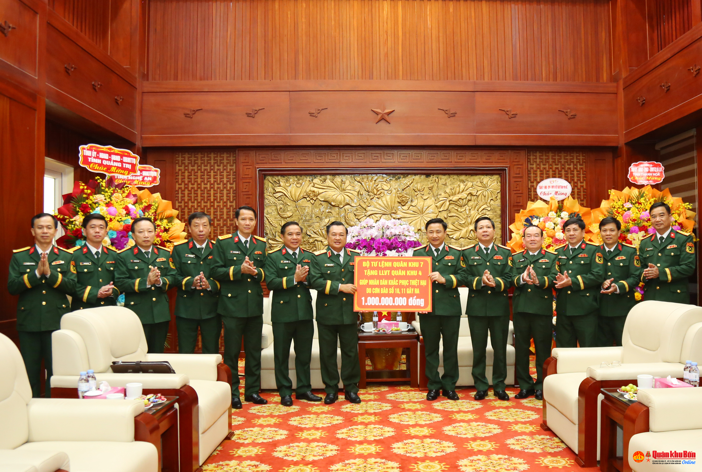 Sáng 12/10/2025, tại Bộ Tư lệnh Quân khu 4, Đoàn công tác Bộ Tư lệnh Quân khu 7 do Thiếu tướng Trần Vinh Ngọc, Bí thư Đảng ủy, Chính ủy Quân khu 7 làm Trưởng đoàn, đã trao kinh phí hỗ trợ 1 tỷ đồng giúp lực lượng vũ trang Quân khu 4 và Nhân dân trên địa bàn khắc phục hậu quả do bão số 10, 11 gây ra.