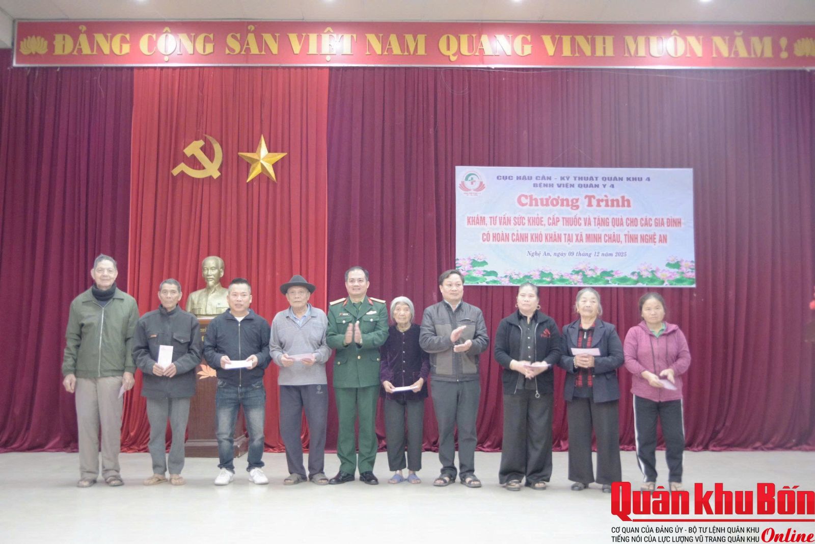 Sáng 09/12/2025, thực hiện Đề án “Nâng cao chất lượng, hiệu quả công tác dân vận của Lực lượng vũ trang Quân khu 4 ... năm 2025”, hướng tới chào mừng kỷ niệm 81 năm Ngày thành lập Quân đội nhân dân Việt Nam (22/12/1944 – 22/12/2025) và 36 năm Ngày hội Quốc phòng toàn dân (22/12/1989 – 22/12/2025), Bệnh viện Quân y 4 tổ chức chương trình khám, chữa bệnh, tư vấn sức khỏe, cấp thuốc và tặng quà các gia đình có hoàn cảnh khó khăn tại xã Minh Châu, tỉnh Nghệ An.