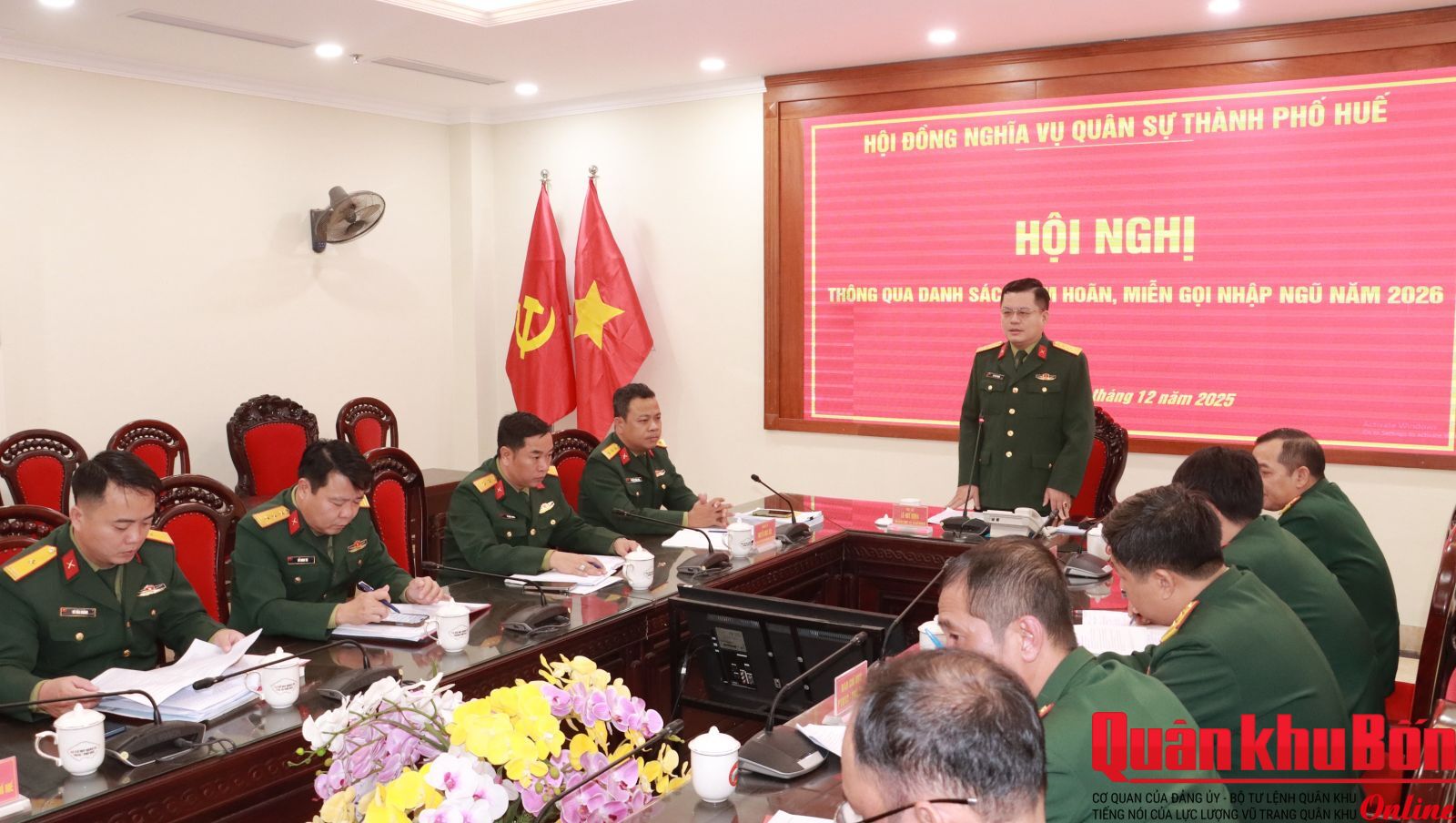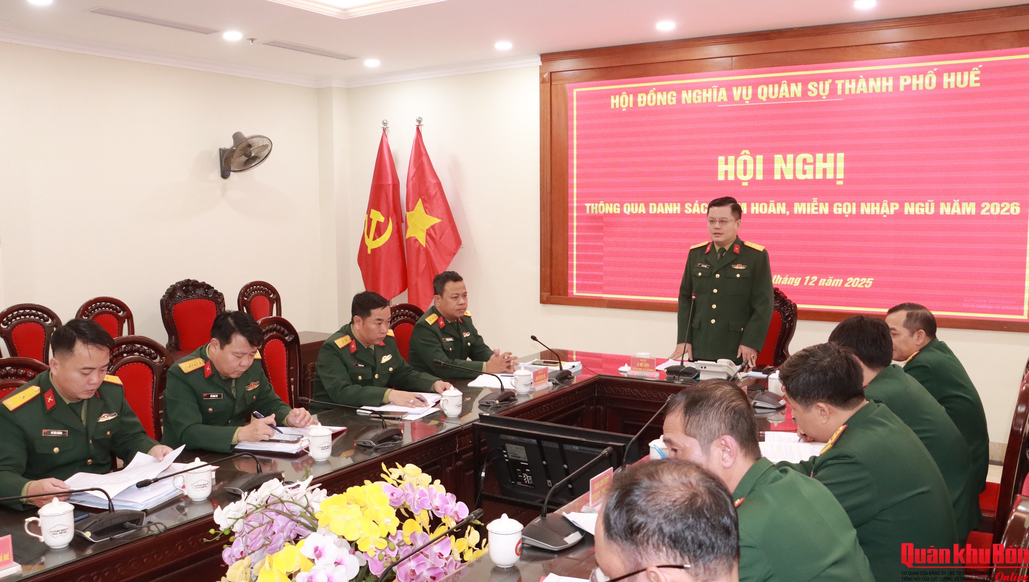 Sáng ngày 01/12/2025, Hội đồng Nghĩa vụ quân sự (NVQS) thành phố Huế tổ chức Hội nghị thông qua danh sách các trường hợp đủ điều kiện, tạm hoãn và miễn gọi nhập ngũ năm 2026 của các xã, phường. Đại tá Lê Huy Nghĩa, Phó Chỉ huy trưởng, Tham mưu trưởng Bộ CHQS thành phố, Phó Chủ tịch Hội đồng NVQS thành phố Huế chủ trì Hội nghị.