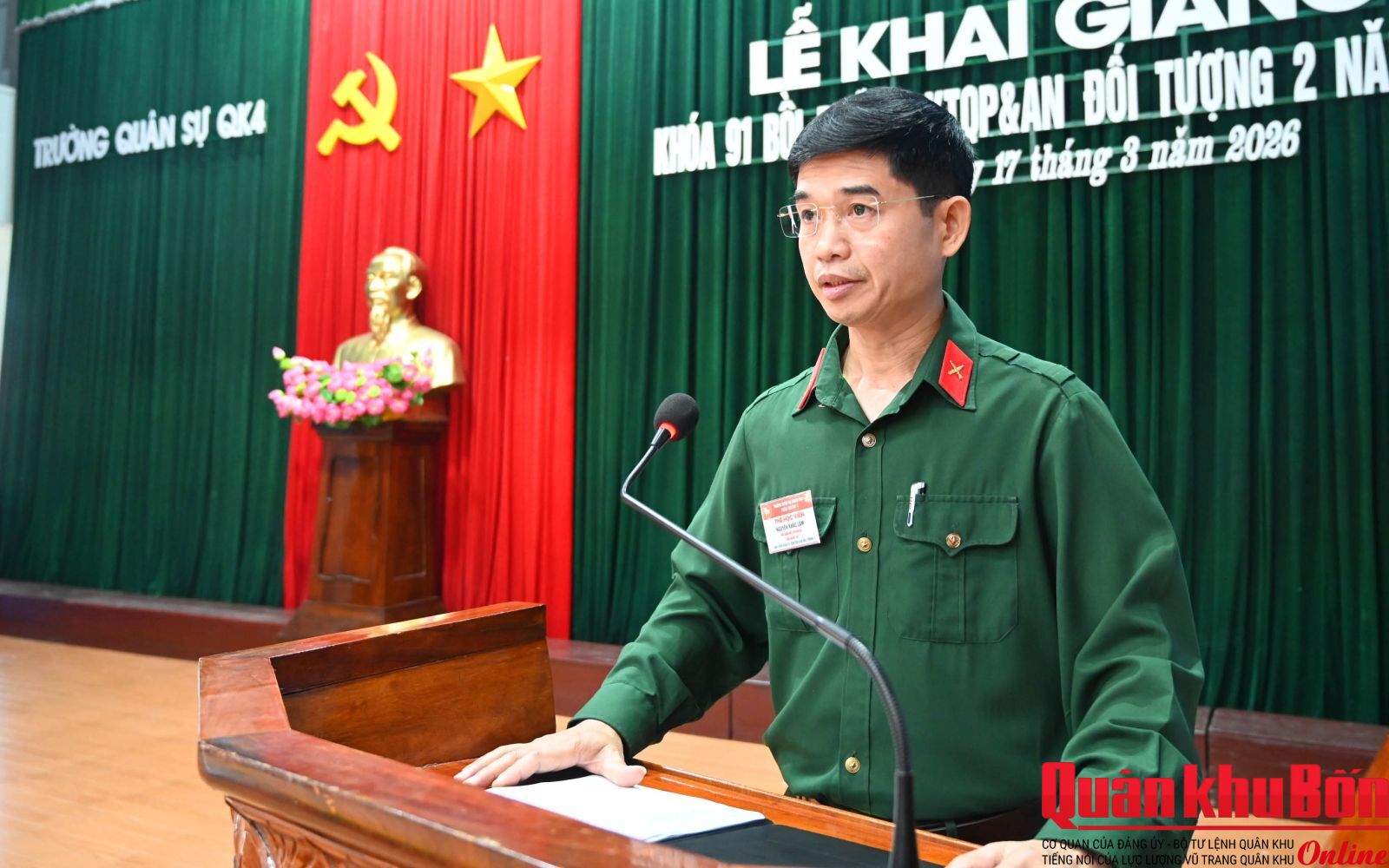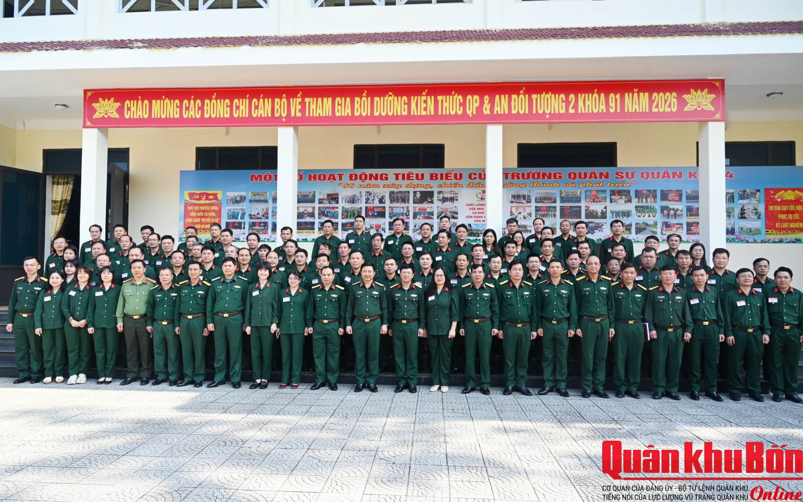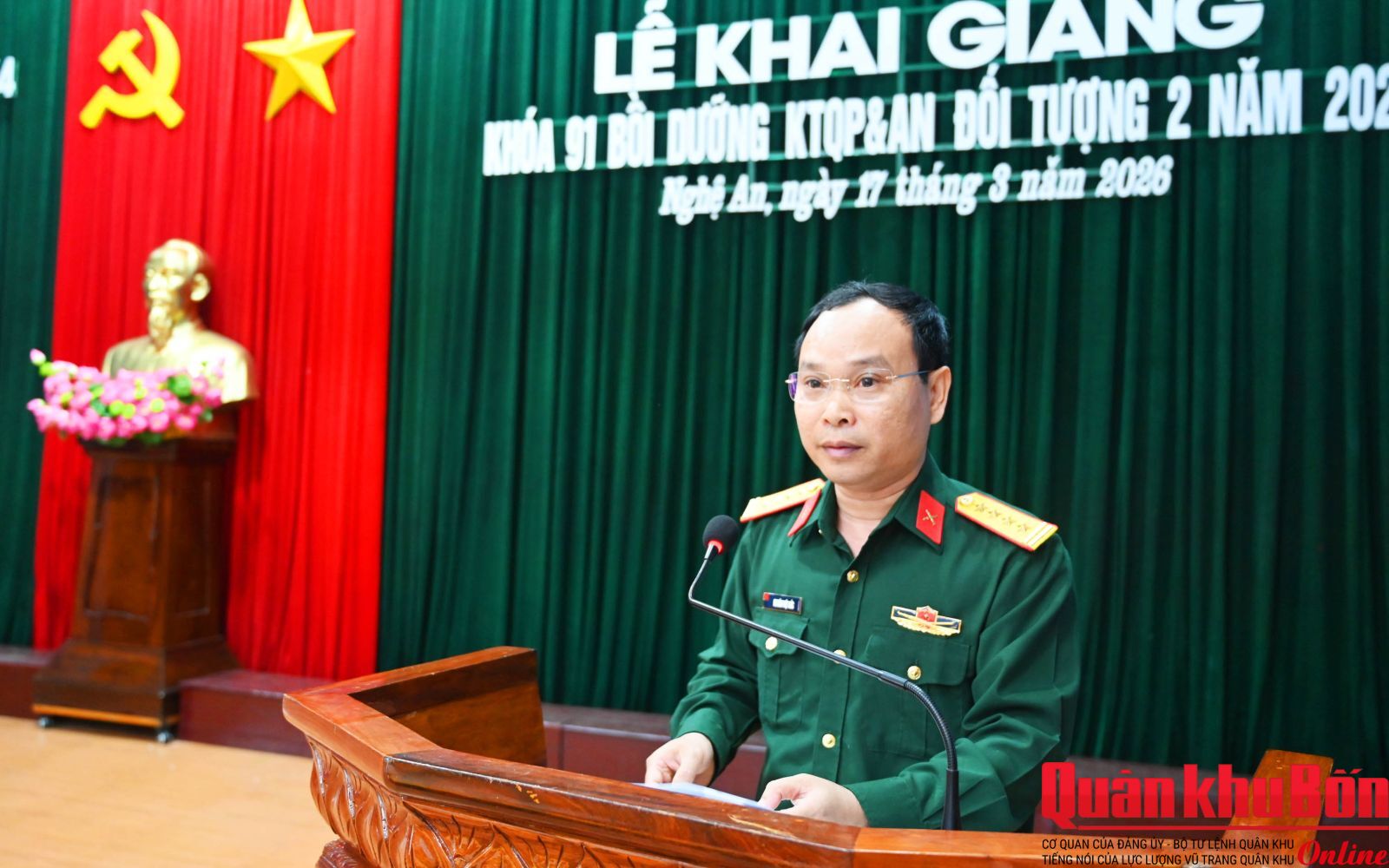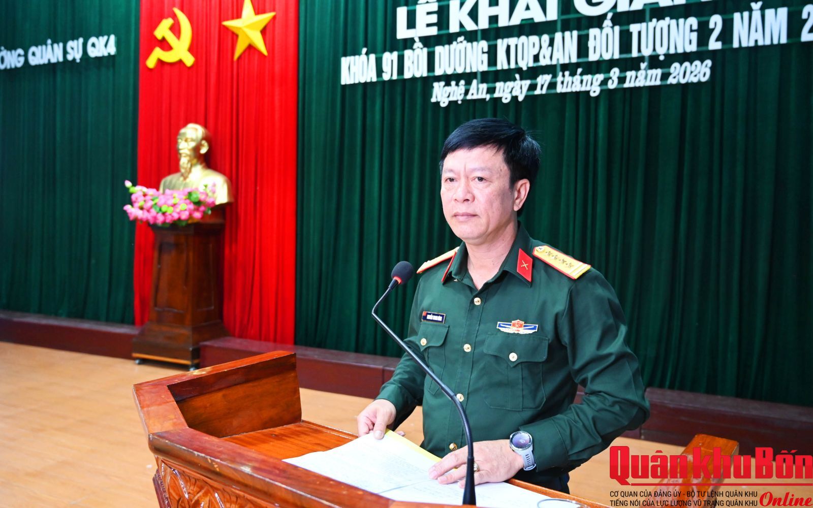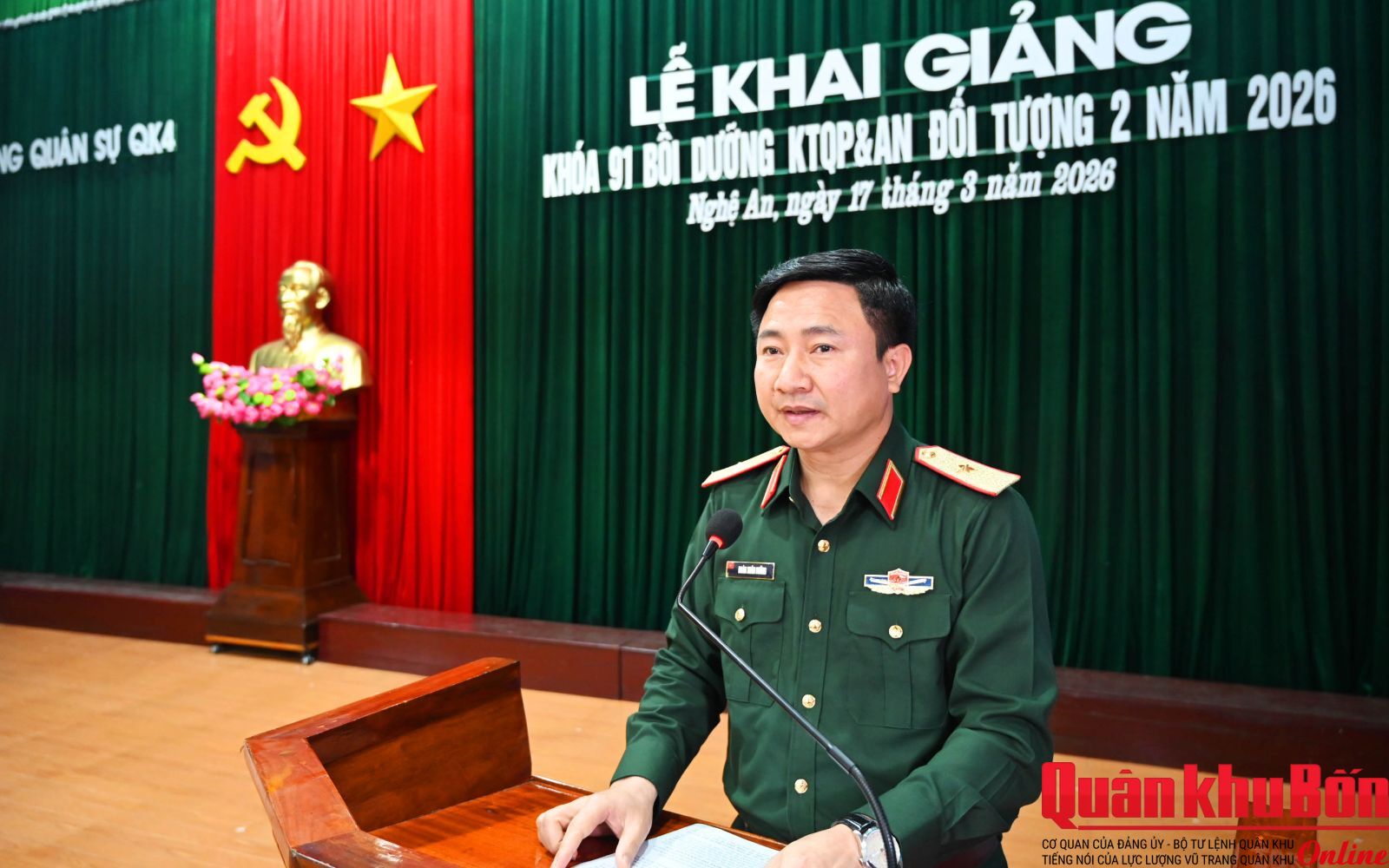 Sáng 17/3/2026, Trường Quân sự Quân khu 4 tổ chức Lễ khai giảng khóa 91 lớp bồi dưỡng kiến thức quốc phòng và an ninh đối tượng 2, năm 2026. Thiếu tướng Đoàn Xuân Bường, Ủy viên Ban Chấp hành Trung ương Đảng, Bí thư Đảng ủy, Chính ủy Quân khu 4, Phó Chủ tịch Hội đồng Giáo dục Quốc phòng và An ninh Quân khu dự và phát biểu khai mạc.