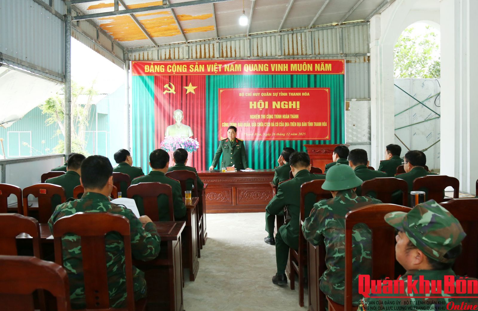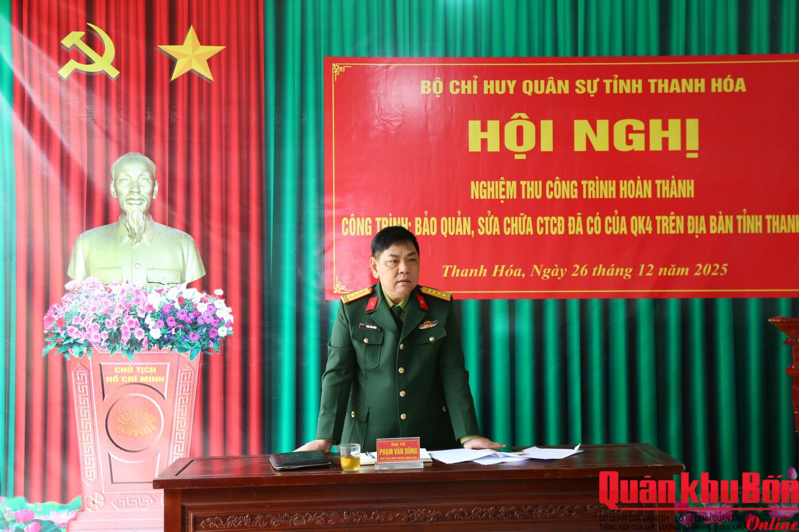Sáng ngày 26/12/2025, Đoàn công tác Quân khu 4 do Đại tá Phạm Văn Dũng, Phó Tham mưu trưởng Quân khu làm Trưởng đoàn, tiến hành kiểm tra, nghiệm thu hoàn thành các công trình của Quân khu trên địa bàn tỉnh Thanh Hóa. Tham gia cùng đoàn có thủ trưởng Phòng Công binh, Phòng Bảo vệ an ninh; cán bộ Phòng Tác chiến. Làm việc với đoàn có Đại tá Nguyễn Thao Trường, Sư đoàn trưởng Sư đoàn 324; Đại tá Trần Hữu Tùng, Phó Chỉ huy trưởng Bộ Chỉ huy Quân sự tỉnh Thanh Hóa; đại diện Binh chủng Công binh cùng cấp ủy, chính quyền địa phương.