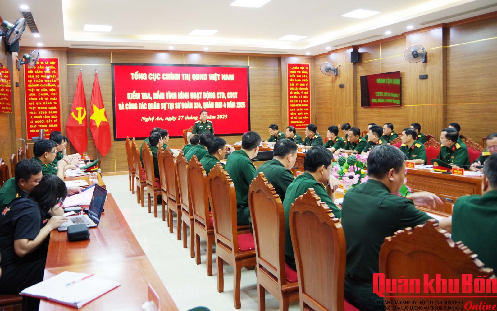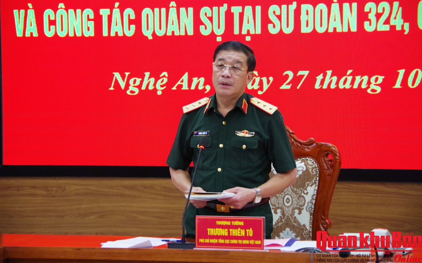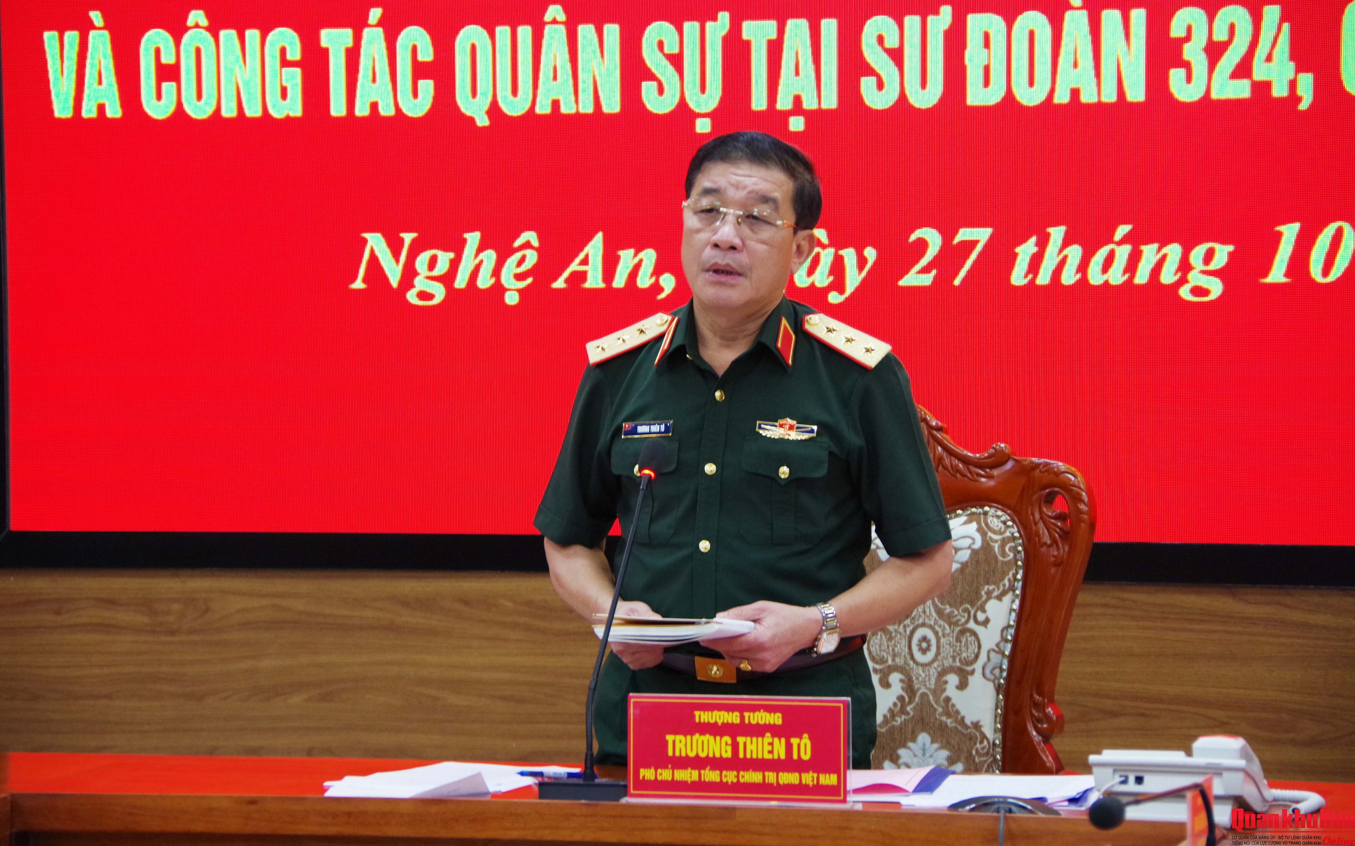 Chiều ngày 27/10/2025, Đoàn công tác số 2 của Tổng cục Chính trị do Thượng tướng Trương Thiên Tô, Phó Chủ nhiệm Tổng cục Chính trị Quân đội nhân dân Việt Nam làm Trưởng đoàn, đã đến kiểm tra, nắm tình hình hoạt động công tác Đảng, công tác chính trị (CTĐ, CTCT) và một số nội dung công tác quân sự tại Sư đoàn 324.