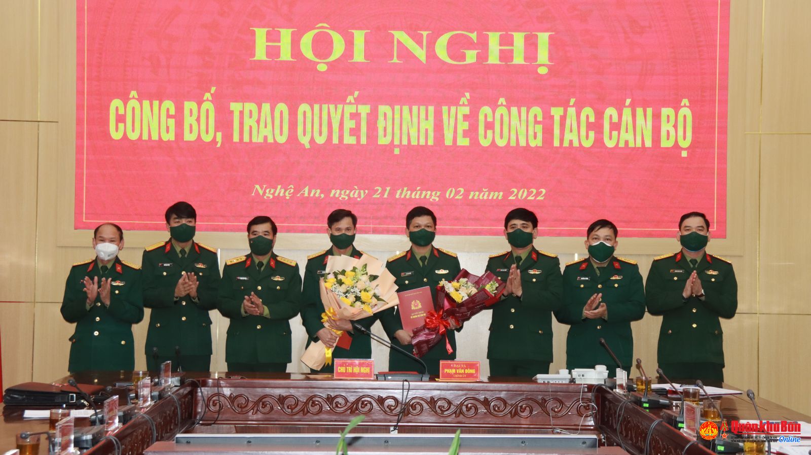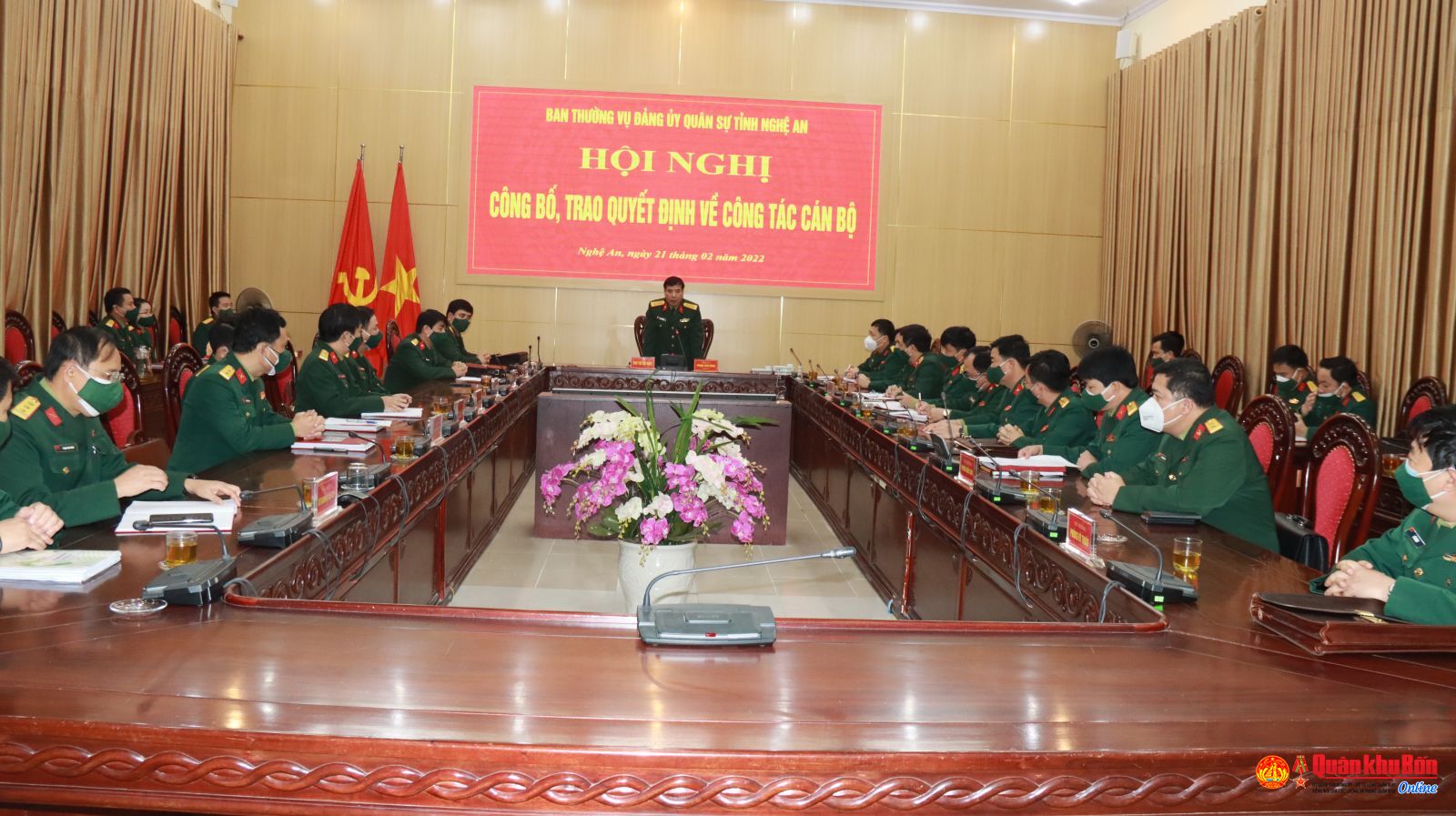 Thực hiện Quyết định của Bộ trưởng Bộ Quốc phòng và Chính uỷ Quân khu 4, sáng ngày 21/2/2022, dưới sự chủ trì của đồng chí Đại tá Phạm Văn Đông, Phó Bí thư Đảng ủy, Chính uỷ Bộ CHQS tỉnh, Thường vụ Đảng uỷ Bộ Chỉ huy Quân sự (CHQS) tỉnh Nghệ An tổ chức Hội nghị công tác cán bộ, trao quyết định về công tác cán bộ.