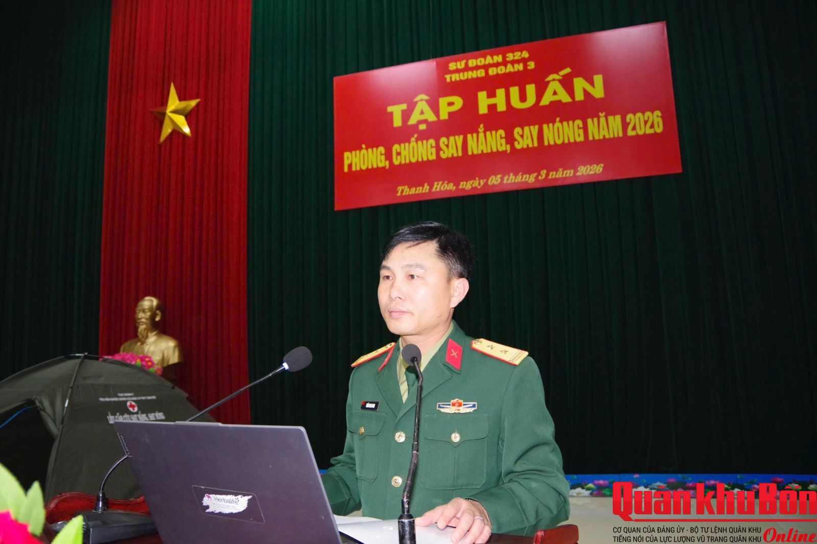 Nhằm bảo đảm sức khỏe cho bộ đội trong huấn luyện, công tác, tối ngày 5/3/2026, Trung đoàn 3, Sư đoàn 324 đã tổ chức tập huấn công tác phòng, chống say nắng, say nóng cho đội ngũ cán bộ các cấp trong toàn Trung đoàn. Trung tá Trần Nam Long, Phó Trung đoàn trưởng, Tham mưu trưởng Trung đoàn dự, chỉ đạo lớp tập huấn.