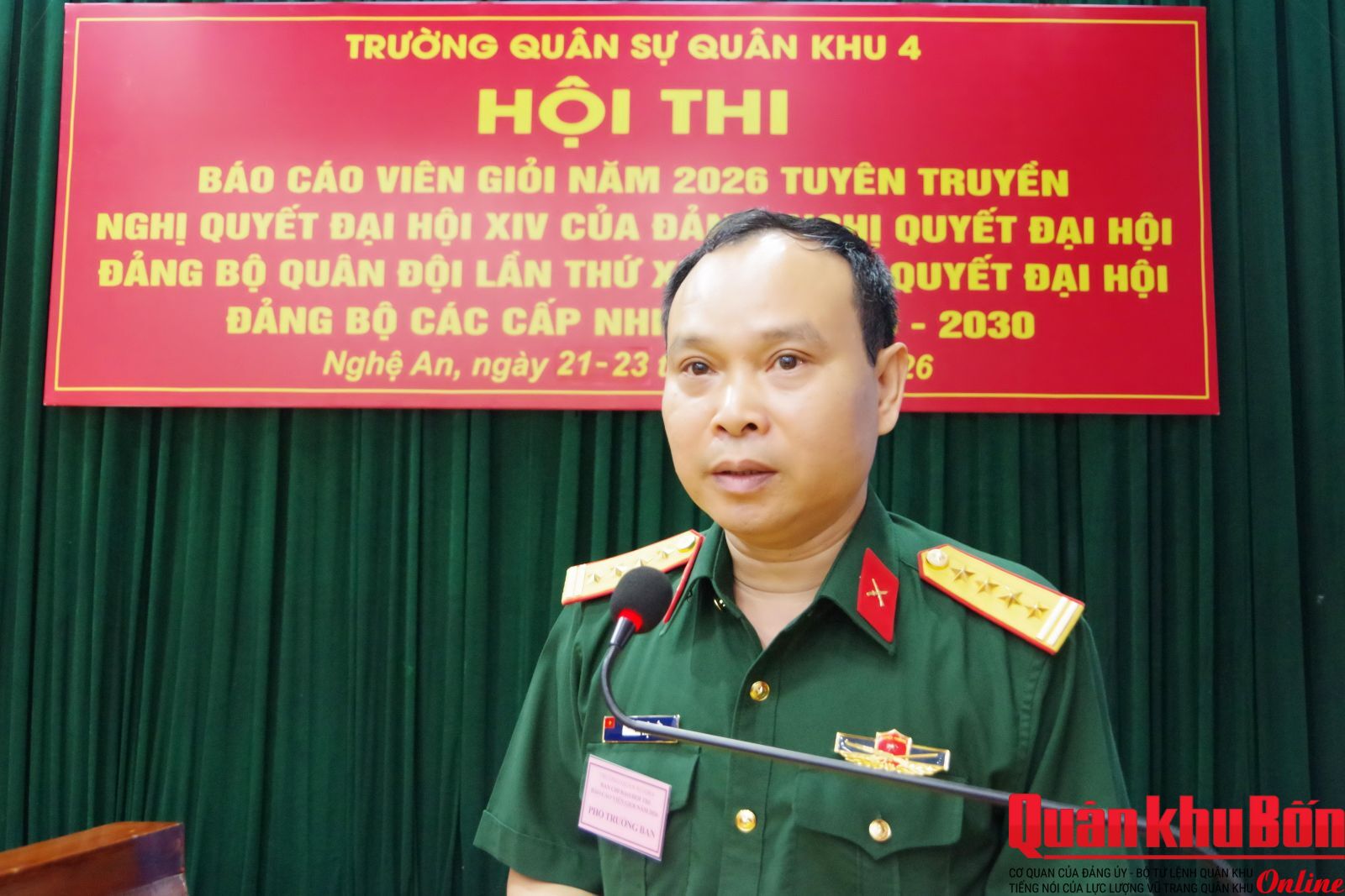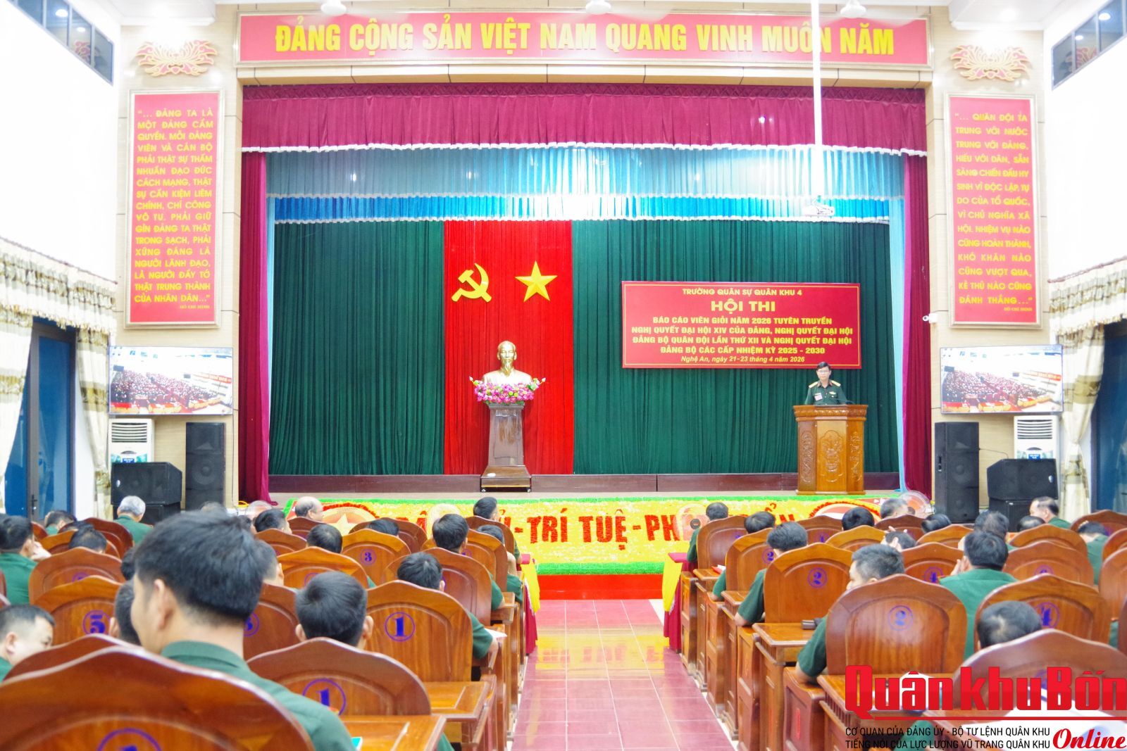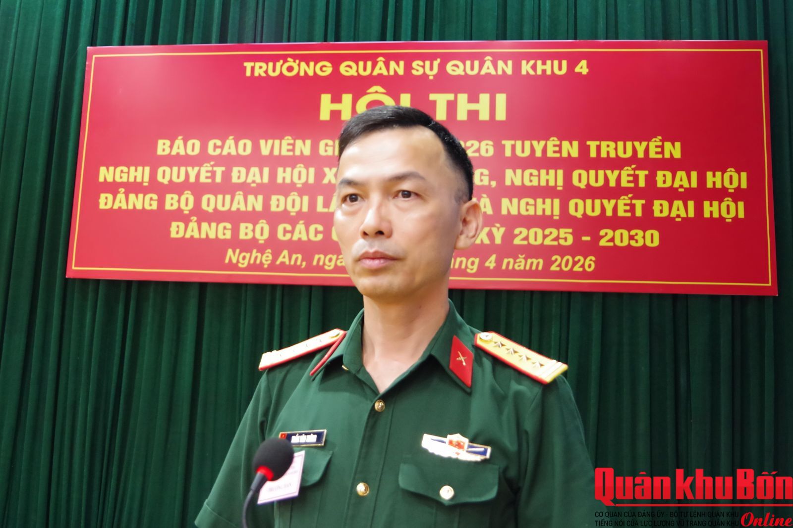 Ngày 21/4/2026, Trường Quân sự Quân khu 4 tổ chức Hội thi Báo cáo viên giỏi cấp Nhà trường năm 2026. Đây là hoạt động có ý nghĩa thiết thực nhằm tuyên truyền sâu rộng Nghị quyết Đại hội XIV của Đảng, Nghị quyết Đại hội Đảng bộ Quân đội lần thứ XII và nghị quyết đại hội đảng bộ các cấp nhiệm kỳ 2025 - 2030.