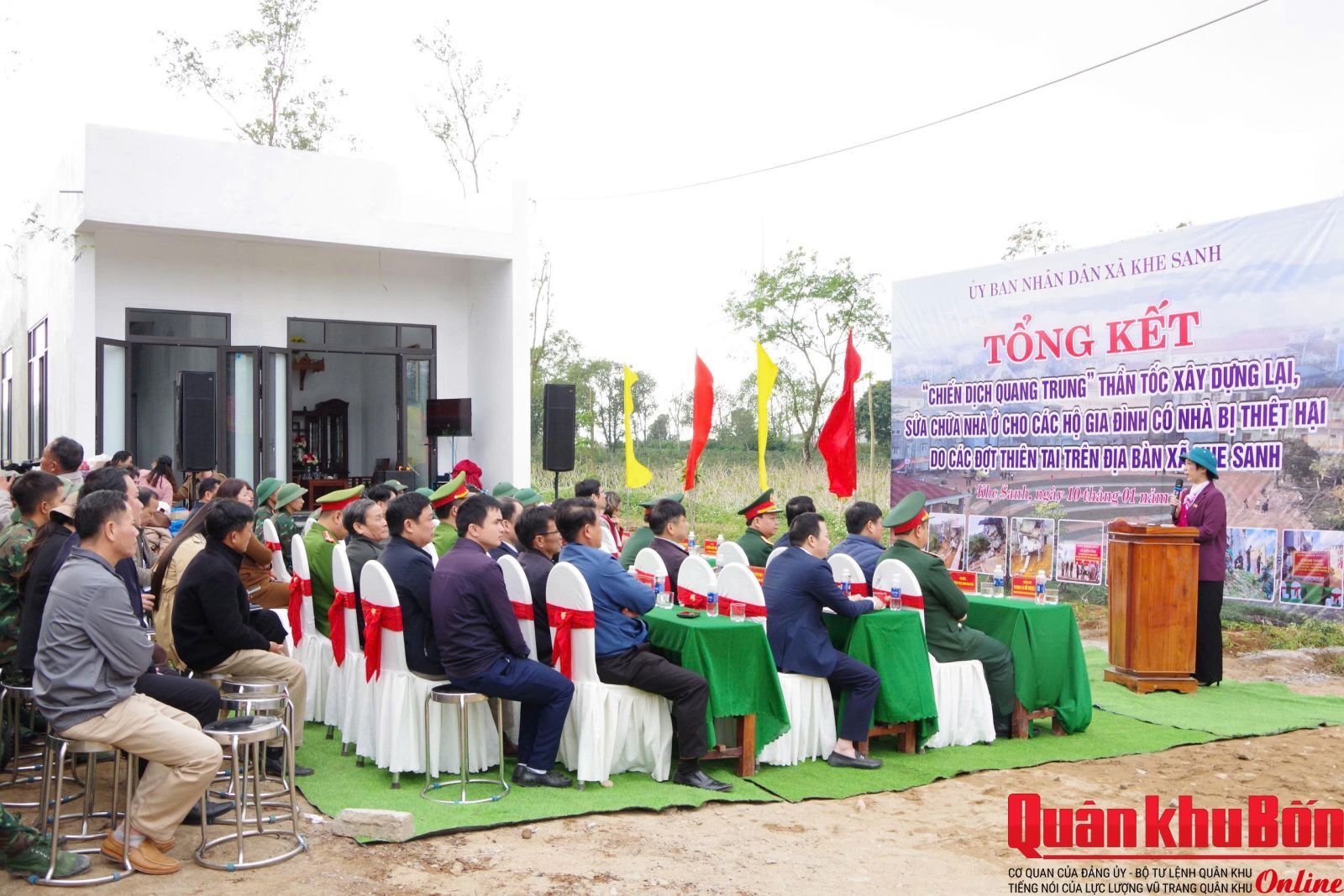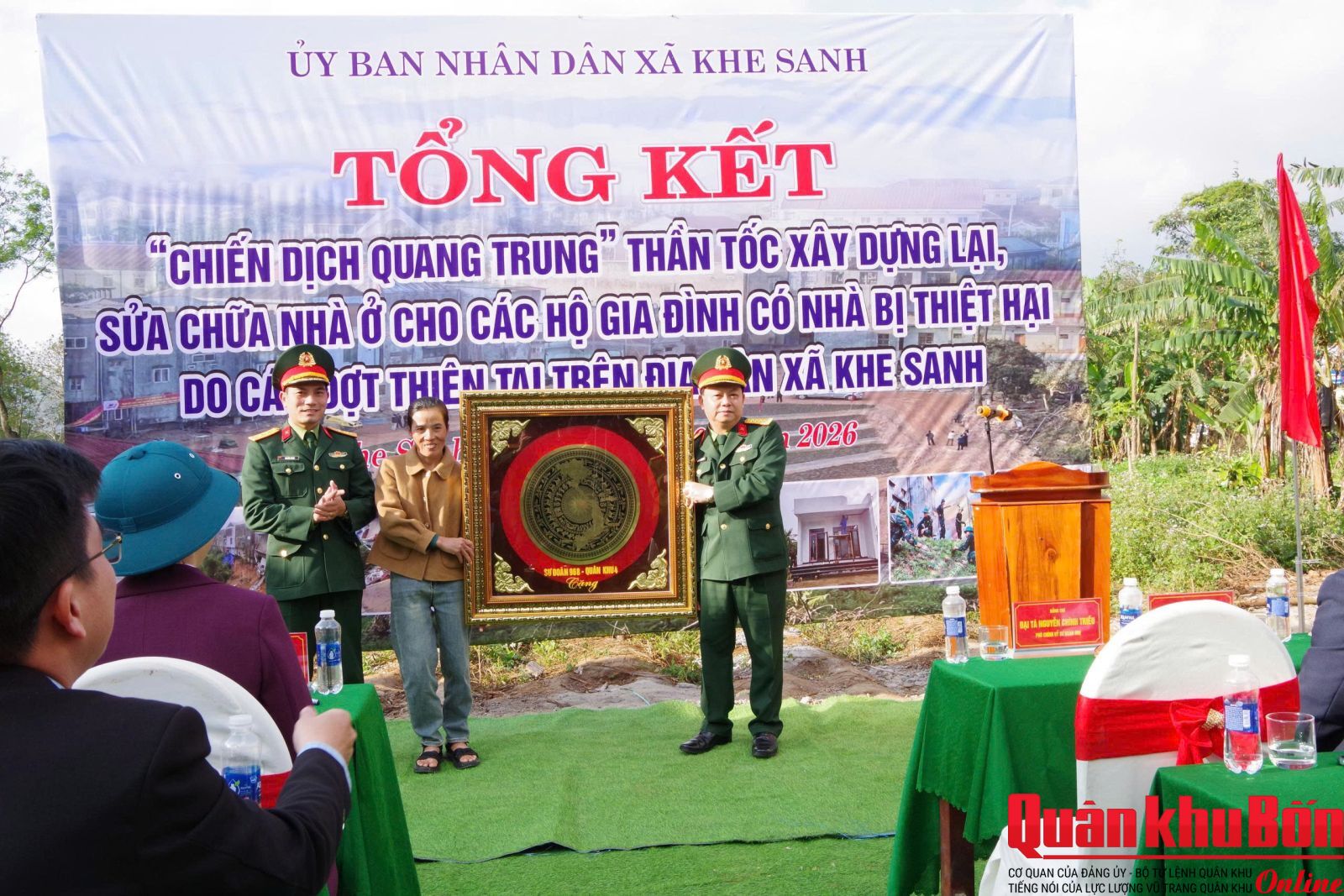 Tại xã Khe Sanh, tỉnh Quảng Trị, chiều ngày 10/1/2026, Sư đoàn 968 (Quân khu 4) phối hợp với cấp ủy, chính quyền địa phương xã tổ chức tổng kết “Chiến dịch Quang Trung” thần tốc xây dựng mới, sửa chữa nhà ở cho các hộ gia đình bị thiệt hại do thiên tai trên địa bàn. Dự buổi tổng kết có Đại tá Nguyễn Chính Triều, Ủy viên Ban Thường vụ Đảng ủy, Phó Chính ủy Sư đoàn; lãnh đạo chính quyền xã Khe xanh, tỉnh Quảng Trị..