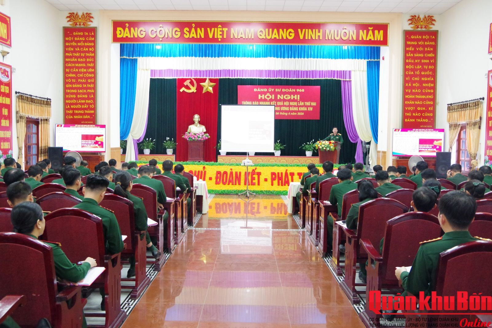 Sáng 6/4/2026, Đảng ủy Sư đoàn 968 (Quân khu 4) tổ chức hội nghị thông báo nhanh kết quả Hội nghị lần thứ hai Ban Chấp hành Trung ương Đảng khóa XIV. Đại tá Nguyễn Chính Triều, Ủy viên Ban Thường vụ Đảng ủy, Phó Chính ủy Sư đoàn chủ trì hội nghị.