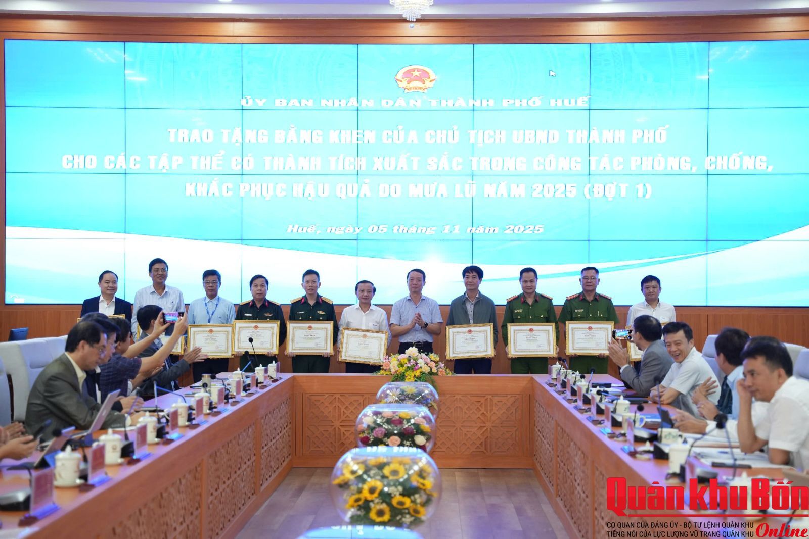 Sáng ngày 5/11/2025, Ủy ban Nhân dân (UBND) thành phố Huế tổ chức trao Bằng khen của Chủ tịch UBND thành phố cho 12 tập thể có thành tích xuất sắc trong công tác phòng, chống và khắc phục hậu quả mưa lũ năm 2025 (đợt 1).