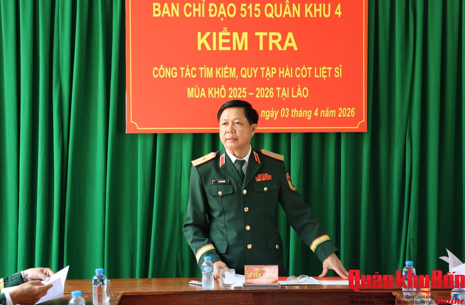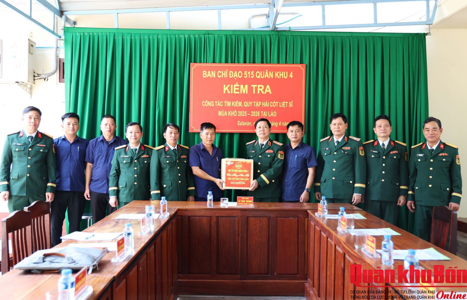 Ngày 3/4/2026, Đoàn công tác Quân khu 4 do Thiếu tướng Lê Văn Trung, Ủy viên Ban Thường vụ Đảng ủy, Phó Chính ủy, Trưởng Ban Chỉ đạo 515 Quân khu dẫn đầu đã đến kiểm tra, động viên cán bộ, chiến sĩ Đội Quy tập 192 (Bộ CHQS thành phố Huế) đang thực hiện nhiệm vụ tìm kiếm, quy tập hài cốt liệt sĩ quân tình nguyện và chuyên gia Việt Nam hy sinh tại hai tỉnh Salavan và Sekong, nước bạn Lào. Thiếu tướng Lê Văn Vỹ, Phó Tham mưu trưởng, Phó Ban Chỉ đạo 515 Quân khu; Đại tá Hà Văn Ái, Phó Chính ủy Bộ CHQS thành phố Huế tham gia đoàn công tác.