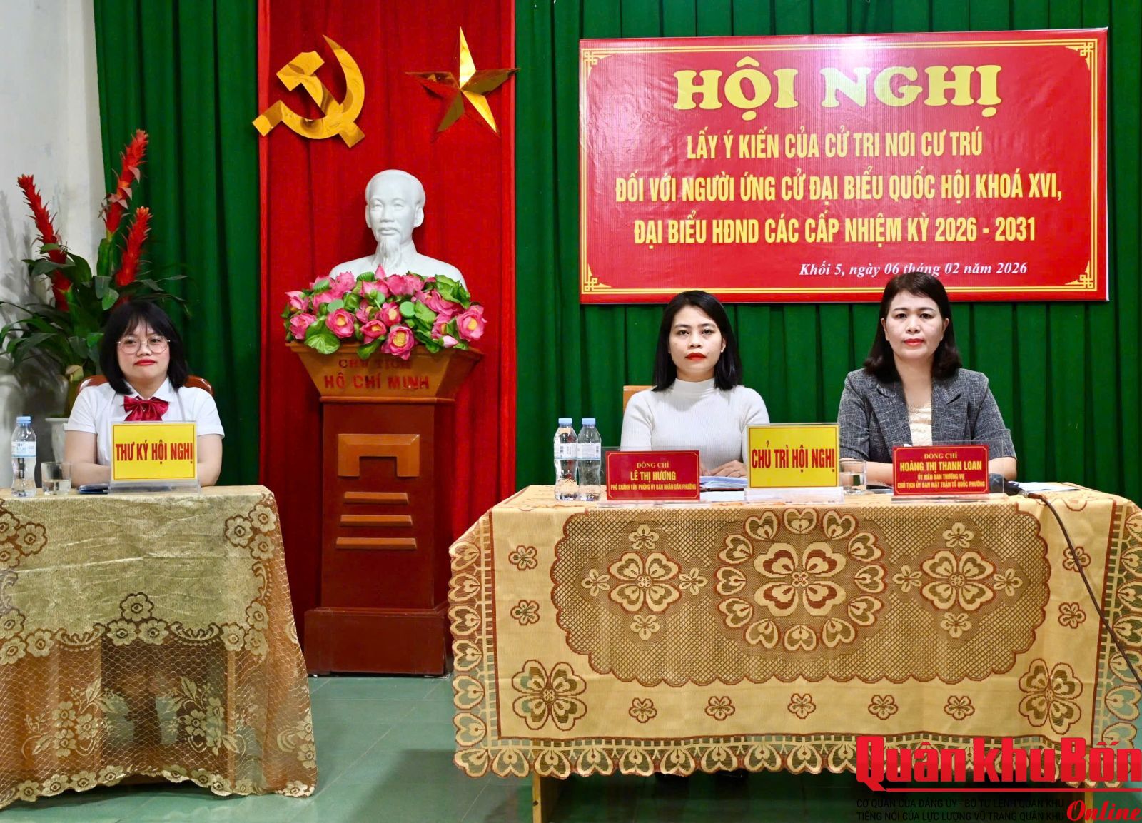 Tại Hội nghị, đại diện Ban Tổ chức đã thông báo tiêu chuẩn đại biểu Quốc hội, đại biểu HĐND các cấp nhiệm kỳ 2026 – 2031; đồng thời giới thiệu danh sách, tiểu sử tóm tắt của những người được giới thiệu ứng cử gồm: Thiếu tướng Nguyễn Ngọc Hà, Phó Tư lệnh Quân khu 4, ứng cử đại biểu Quốc hội khóa XVI; bà Thái Thị Thu Nga, Phó Hiệu trưởng Trường Mầm non Nguyễn Huệ – Hưng Nguyên, ứng cử đại biểu HĐND phường Thành Vinh.