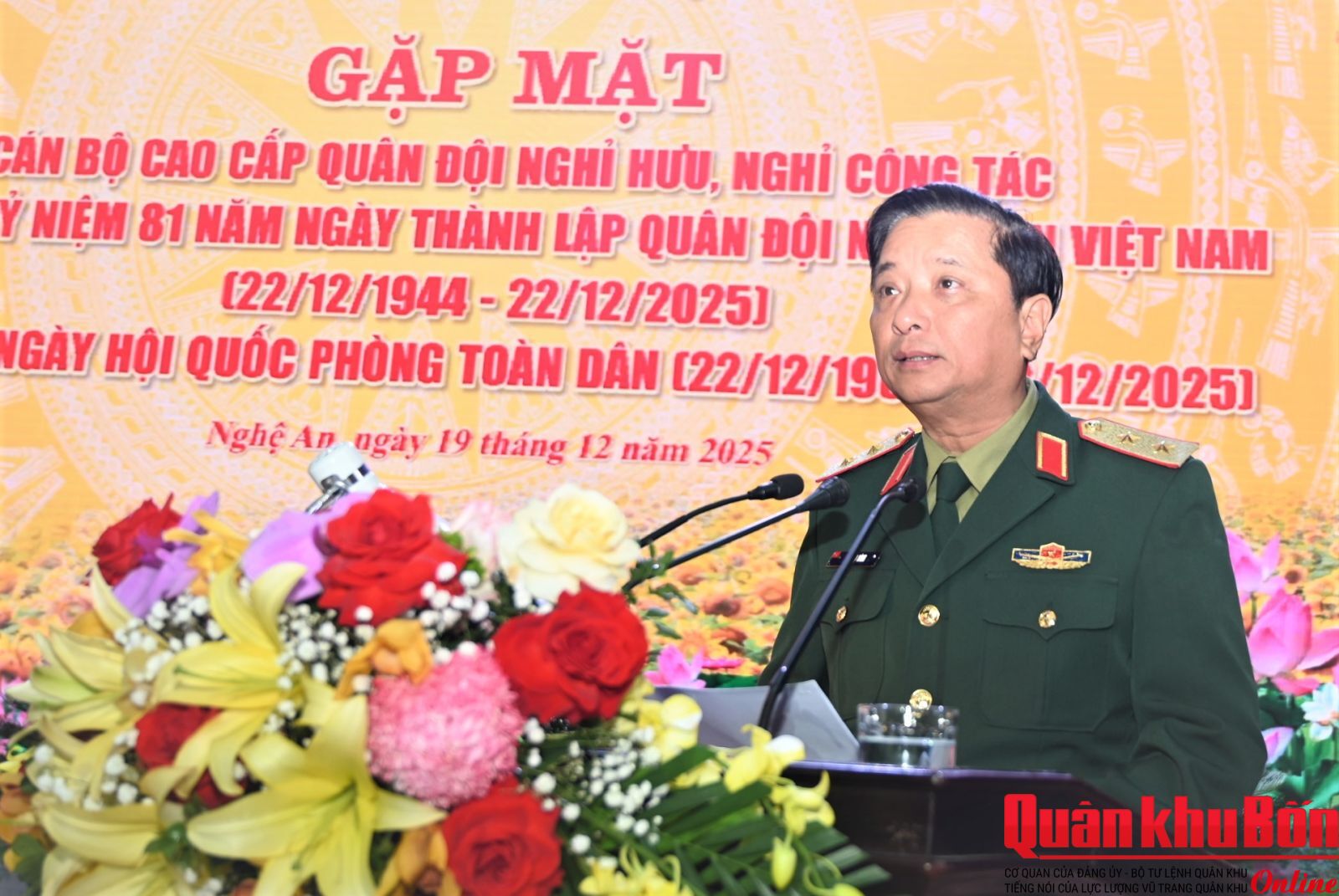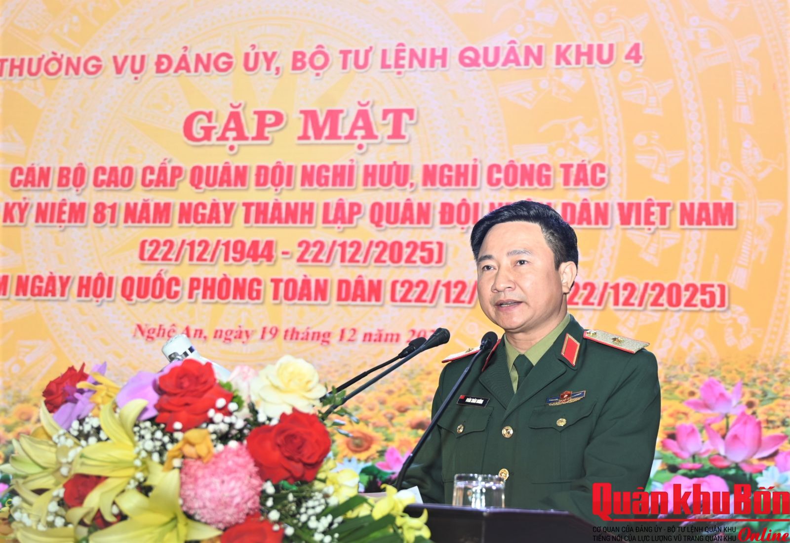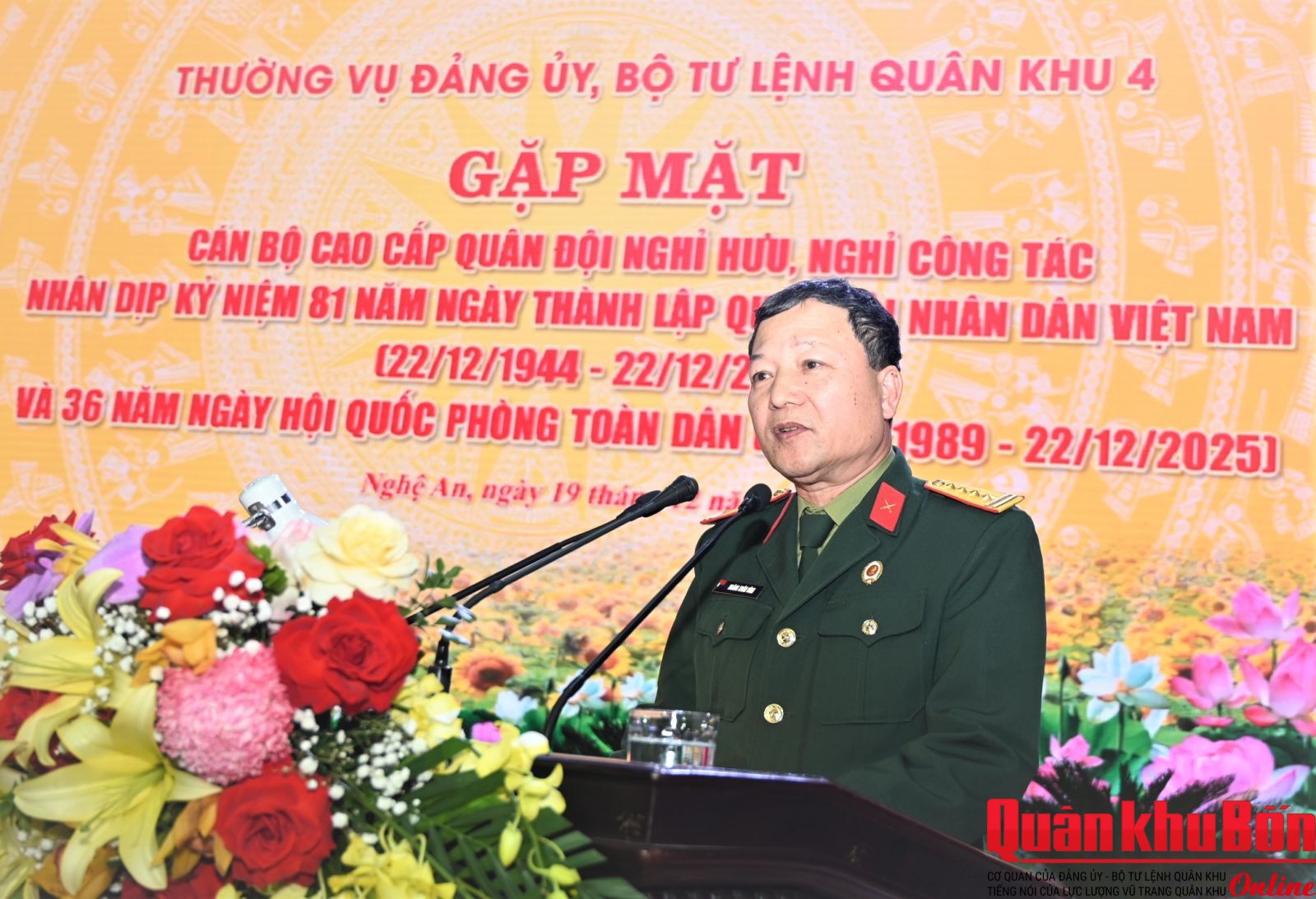 Sáng 19/12/2025, Thường vụ Đảng ủy, Bộ Tư lệnh Quân khu 4 tổ chức gặp mặt cán bộ cao cấp Quân đội nghỉ hưu, nghỉ công tác trên địa bàn Quân khu 4 nhân kỷ niệm 81 năm Ngày thành lập Quân đội Nhân dân Việt Nam (22/12/1944-22/12/2025) và 36 năm Ngày hội Quốc phòng toàn dân (22/12/1989-22/12/2025).