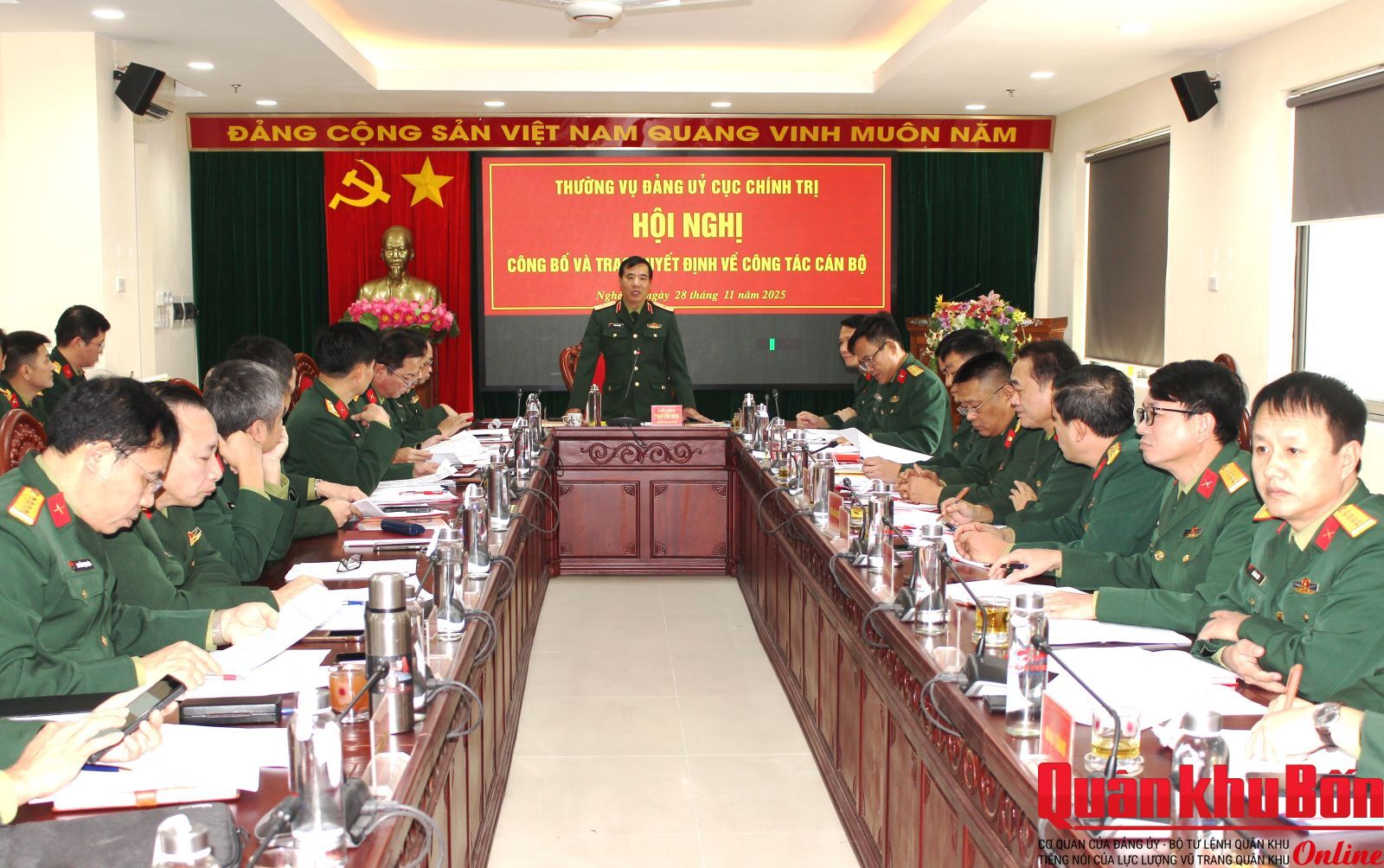 Chiều ngày 28/11/2025, Thường vụ Đảng ủy Cục Chính trị Quân khu đã tổ chức Hội nghị trao quyết định thăng quân hàm, nâng lương cho cán bộ năm 2025. Thiếu tướng Phan Văn Sỹ, Bí thư Đảng ủy Cục Chính trị, Phó Chủ nhiệm Chính trị Quân khu chủ trì Hội nghị; Thiếu tướng Phạm Văn Đông, Ủy viên Thường vụ Đảng ủy Quân khu, Chủ nhiệm Chính trị dự và trao quyết định. Dự Hội nghị còn có Đại tá Đình Xuân Hướng; Đại tá Nguyễn Kỹ Hồng, Phó Chủ nhiệm Chính trị Quân khu.