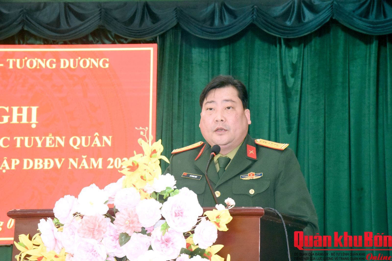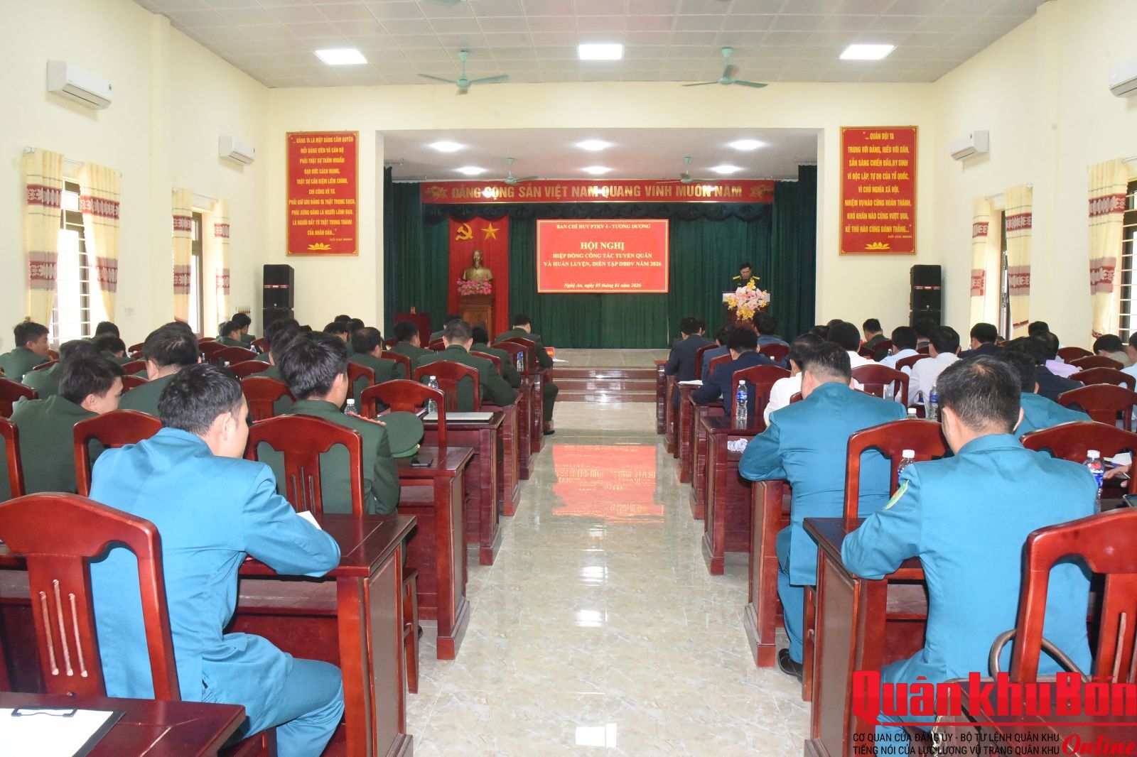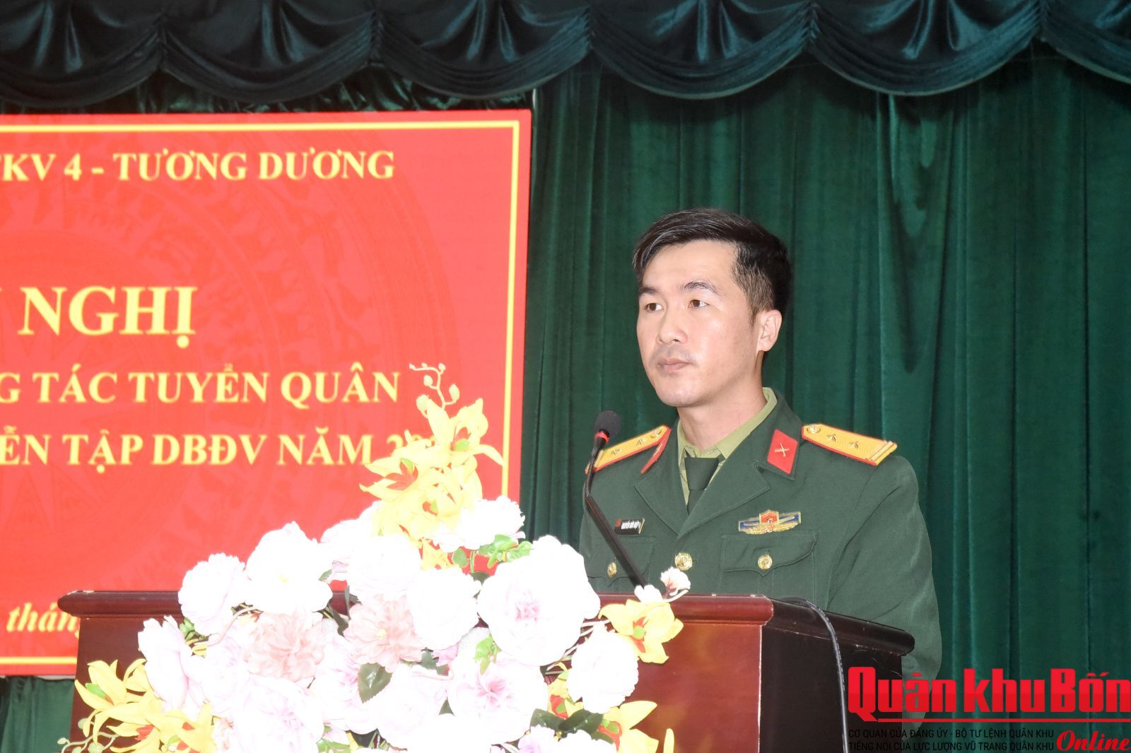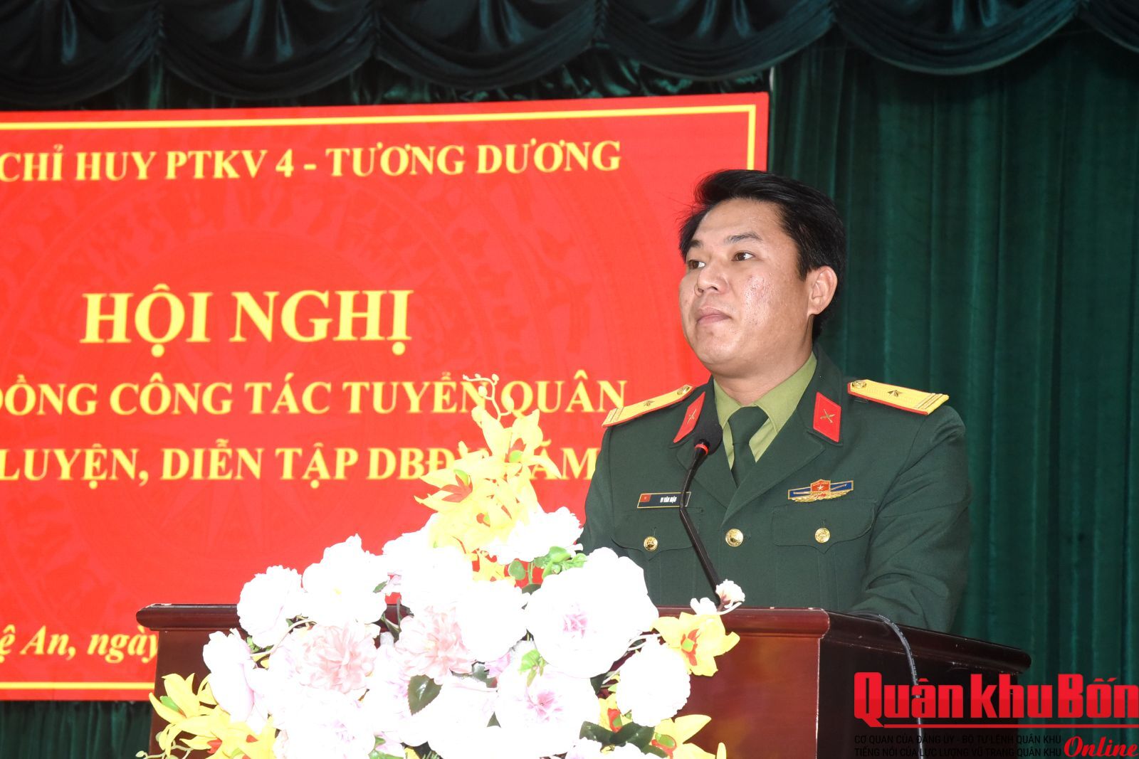Chiều 05/01/2026, Ban Chỉ huy Phòng thủ khu vực 4 - Tương Dương (Bộ CHQS tỉnh Nghệ An) tổ chức Hội nghị hiệp đồng tuyển quân và huấn luyện, diễn tập lực lượng dự bị động viên năm 2026. Thượng tá Lô Thanh Như, Chỉ huy trưởng Ban Chỉ huy Phòng thủ khu vực 4 - Tương Dương, thành viên Hội đồng Nghĩa vụ Quân sự tỉnh Nghệ An chủ trì hội nghị. Tham dự có Thượng tá Nguyễn Đình Mạnh, Chính ủy Ban Chỉ huy Phòng thủ khu vực 4 - Tương Dương; các đồng chí trong Đảng ủy, chỉ huy, cơ quan Ban Chỉ huy Phòng thủ khu vực 4 - Tương Dương; lãnh đạo 27 xã trên địa bàn; đại diện các đơn vị nhận quân, nhận nguồn.