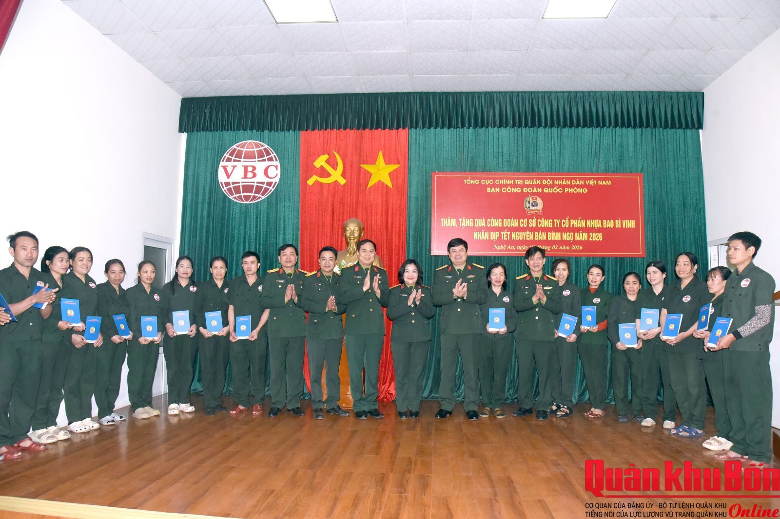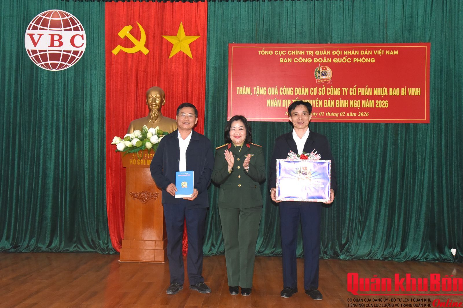 Theo đó, tại Công ty Cổ phần Nhựa Bao bì Vinh và Công ty Cổ phần Gạch ngói 30/4 thuộc Tổng Công ty Hợp tác kinh tế, Đại tá Trần Thị Thu Hiền cùng đoàn công tác đã trực tiếp thăm hỏi tình hình đời sống, sản xuất và trao tận tay những phần quà ý nghĩa. Trong đó, đoàn đã tặng quà cho 2 Công đoàn cơ sở, 26 suất quà cho đoàn viên, người lao động Công ty Cổ phần Nhựa Bao bì Vinh và Công ty Cổ phần Gạch ngói 30/4.