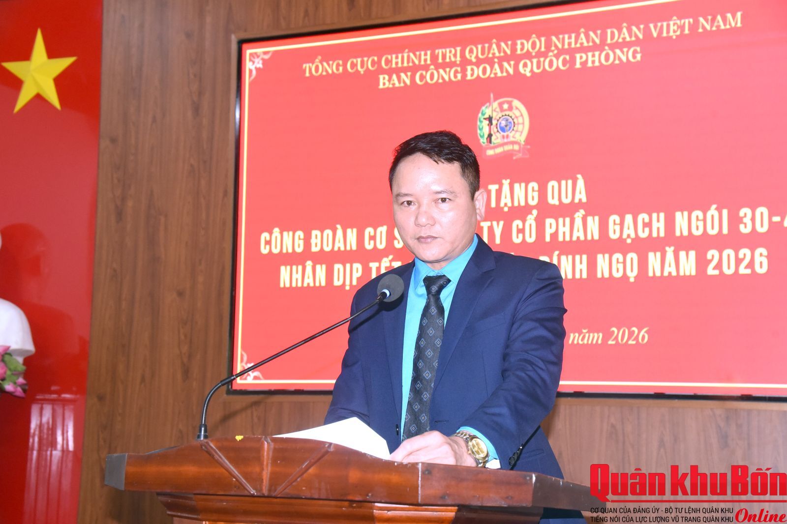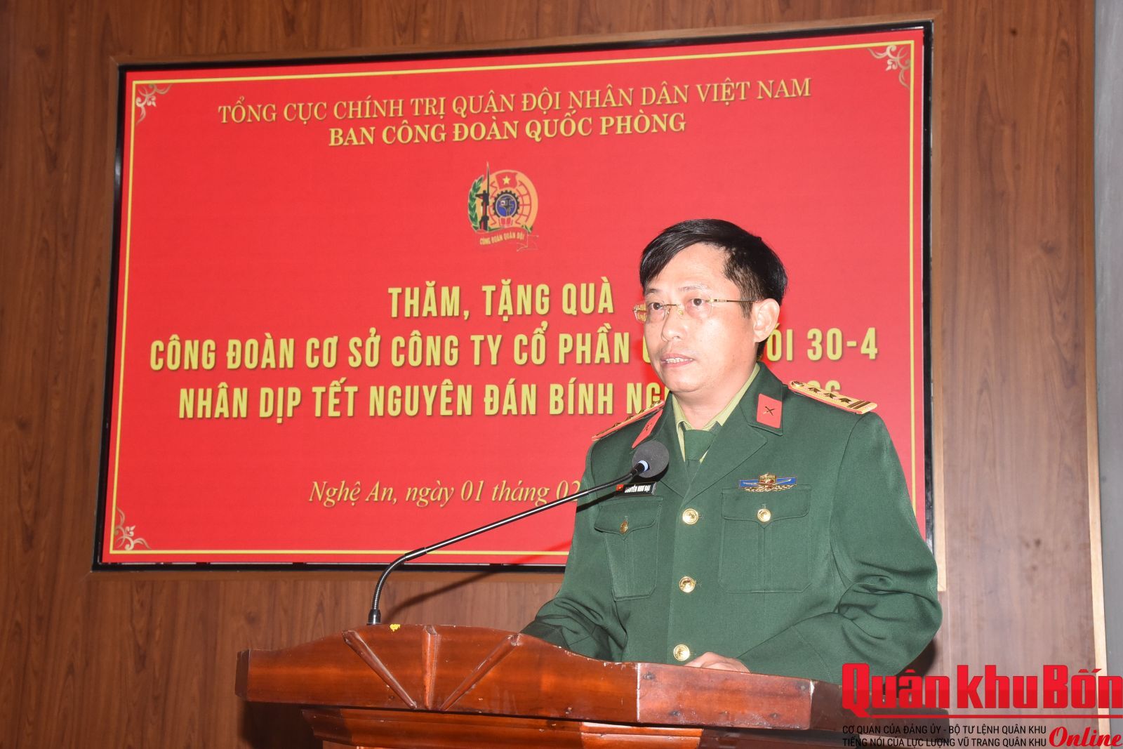 Dịp này, Ban Công đoàn Quốc phòng cũng ủy quyền cho Tổng Công ty Hợp tác kinh tế Quân khu 4 trao 54 suất quà tặng đoàn viên công đoàn thuộc Tổng Công ty có hoàn cảnh khó khăn; Ủy quyền cho các đơn vị thuộc Quân khu 4 trao 13 suất quà tặng đoàn viên mắc bệnh hiểm nghèo và 108 suất quà tặng đoàn viên có hoàn cảnh khó khăn. Tổng trị giá quà tặng trong đợt này lên đến gần 130 triệu đồng. Cục Chính trị Quân khu 4 cũng trao tặng phần quà ý nghĩa cho Công đoàn cơ sở và 6 đoàn viên có hoàn cảnh khó khăn thuộc Công ty Cổ phần Gạch ngói 30/4.