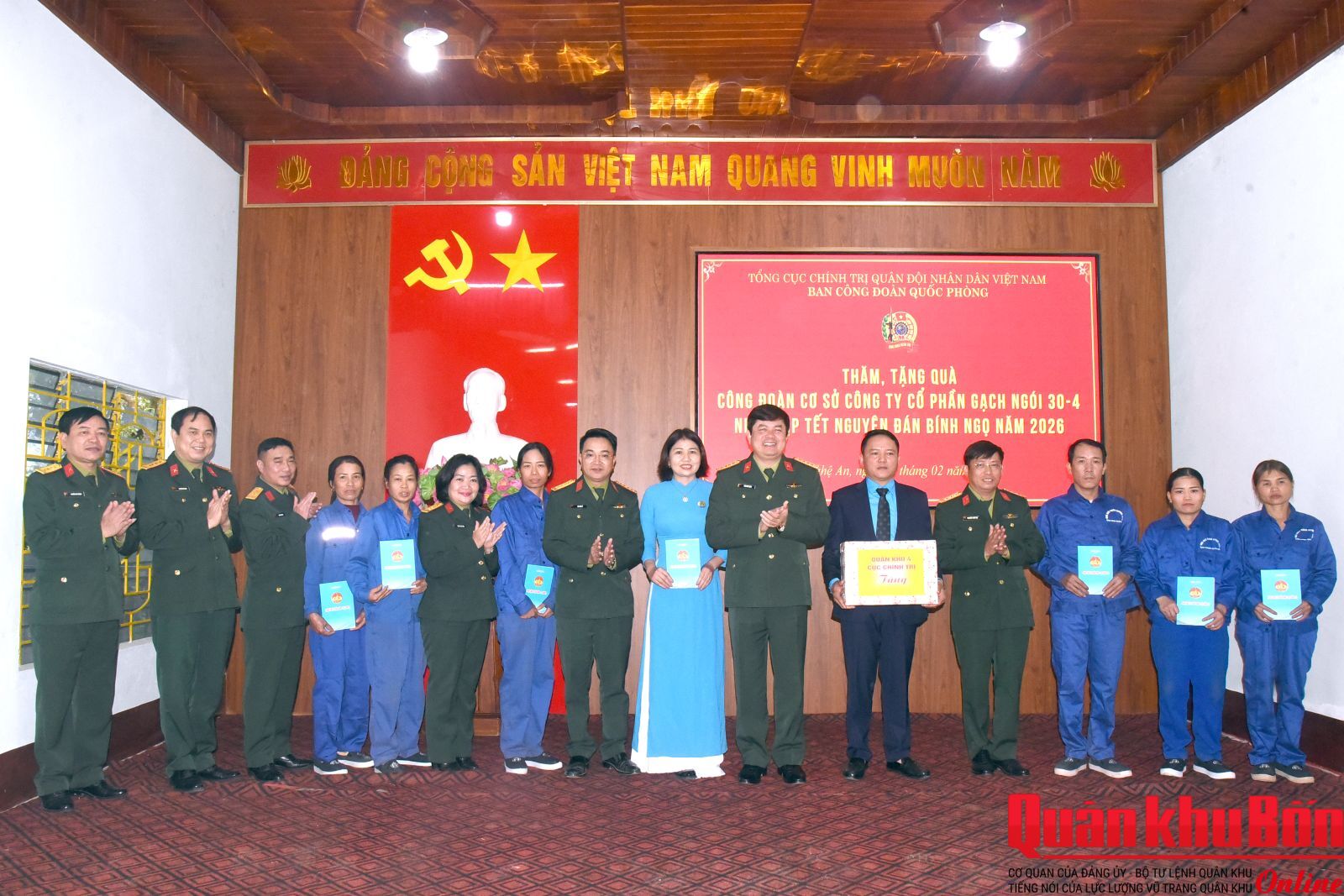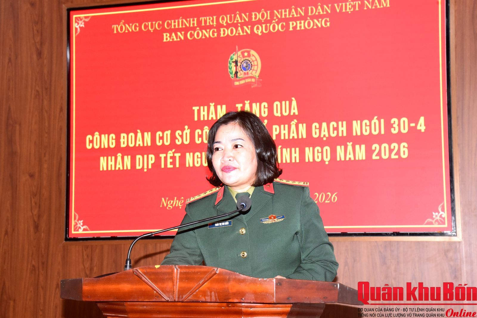 Trong không khí ấm áp của những ngày giáp Tết Bính Ngọ 2026, sáng ngày 01/02/2026, đoàn công tác Ban Công đoàn Quốc phòng do Đại tá Trần Thị Thu Hiền, Phó trưởng Ban Công đoàn Quốc phòng làm trưởng đoàn đã đến thăm và chúc Tết cán bộ, đoàn viên công đoàn, người lao động có hoàn cảnh khó khăn tại Quân khu 4.