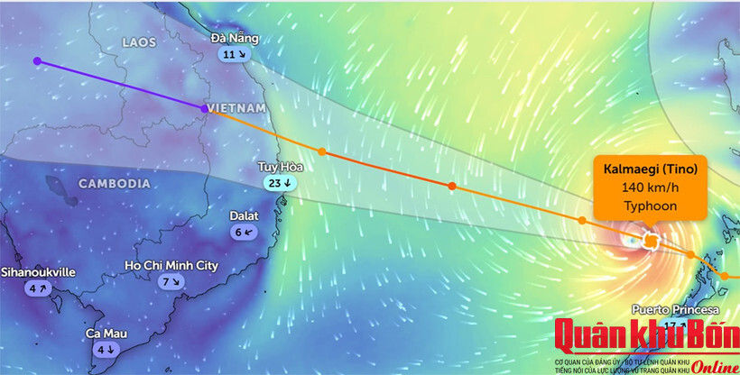 Theo Trung tâm Dự báo khí tượng thủy văn quốc gia, lúc 11 giờ ngày 5/11, vị trí tâm bão số 13 (Kalmaegi) ở khoảng 11,7 độ vĩ bắc; 118,2 độ kinh đông, cách đảo Song Tử Tây (thuộc đặc khu Trường Sa) khoảng 430km về phía đông. Sức gió mạnh nhất cấp 13-14 (134-166km/giờ), giật cấp 17. Dự báo trong 3 giờ tới, bão số 13 di chuyển theo hướng tây tây bắc, tốc độ khoảng 20-25km/giờ.